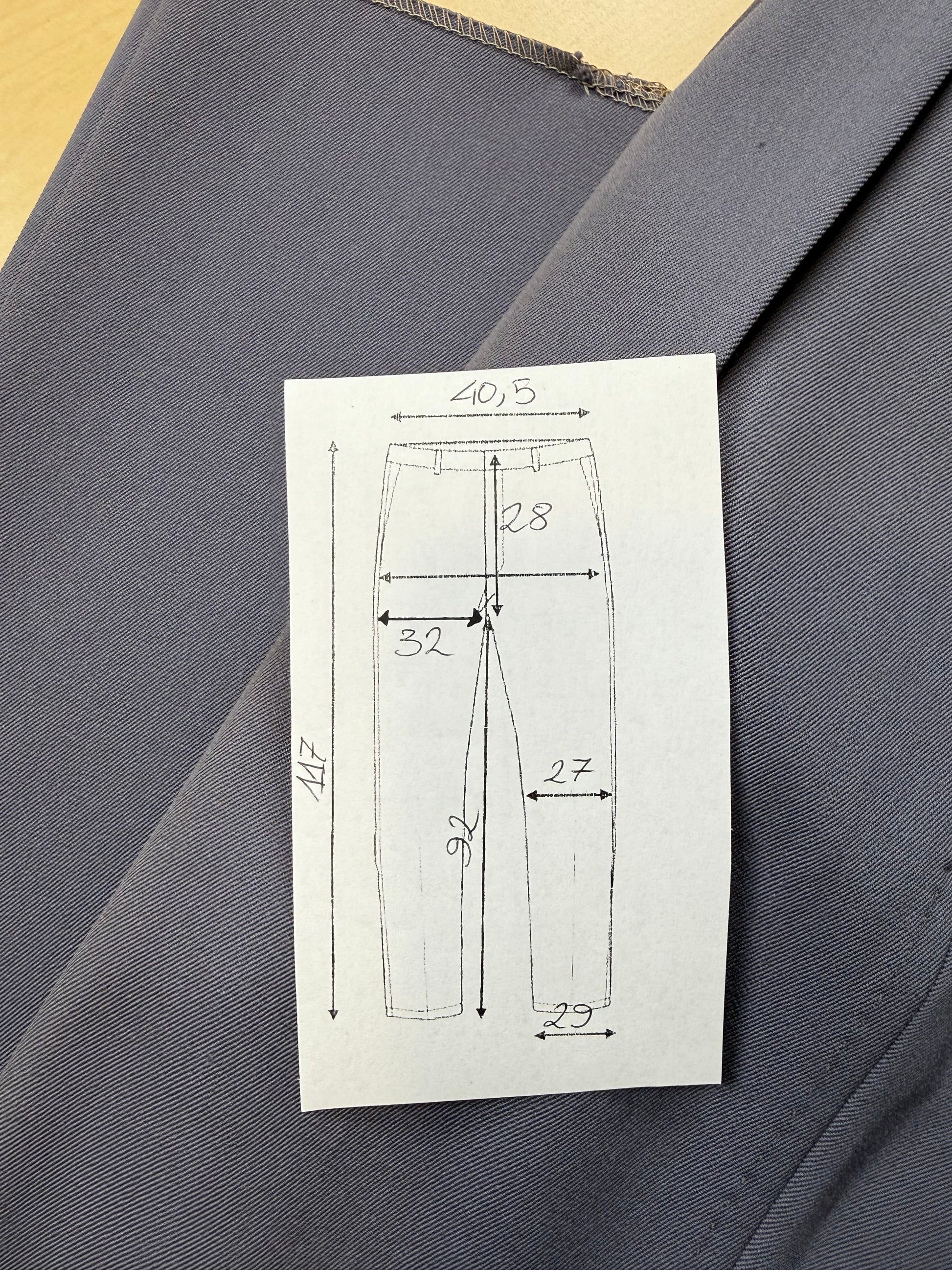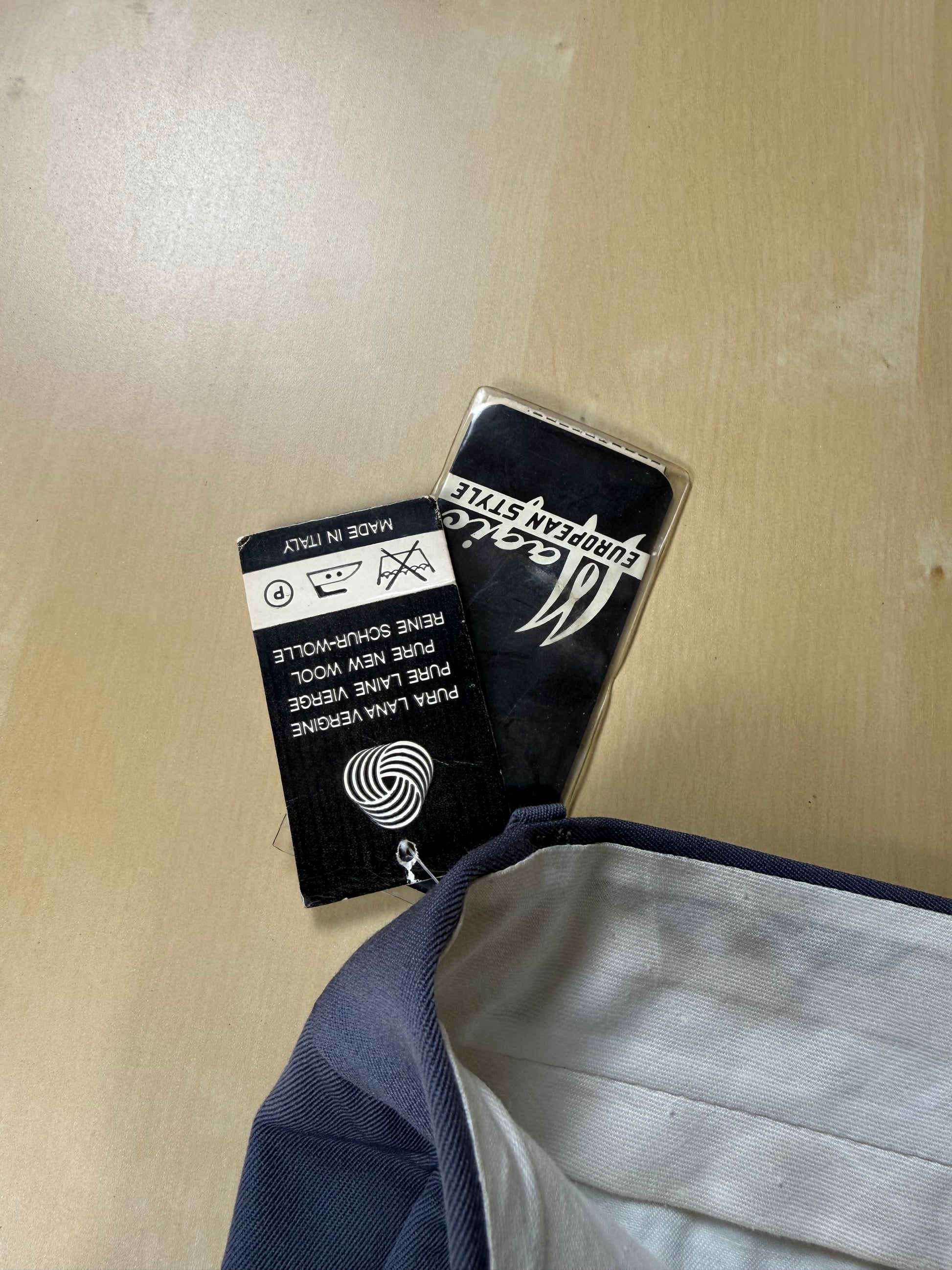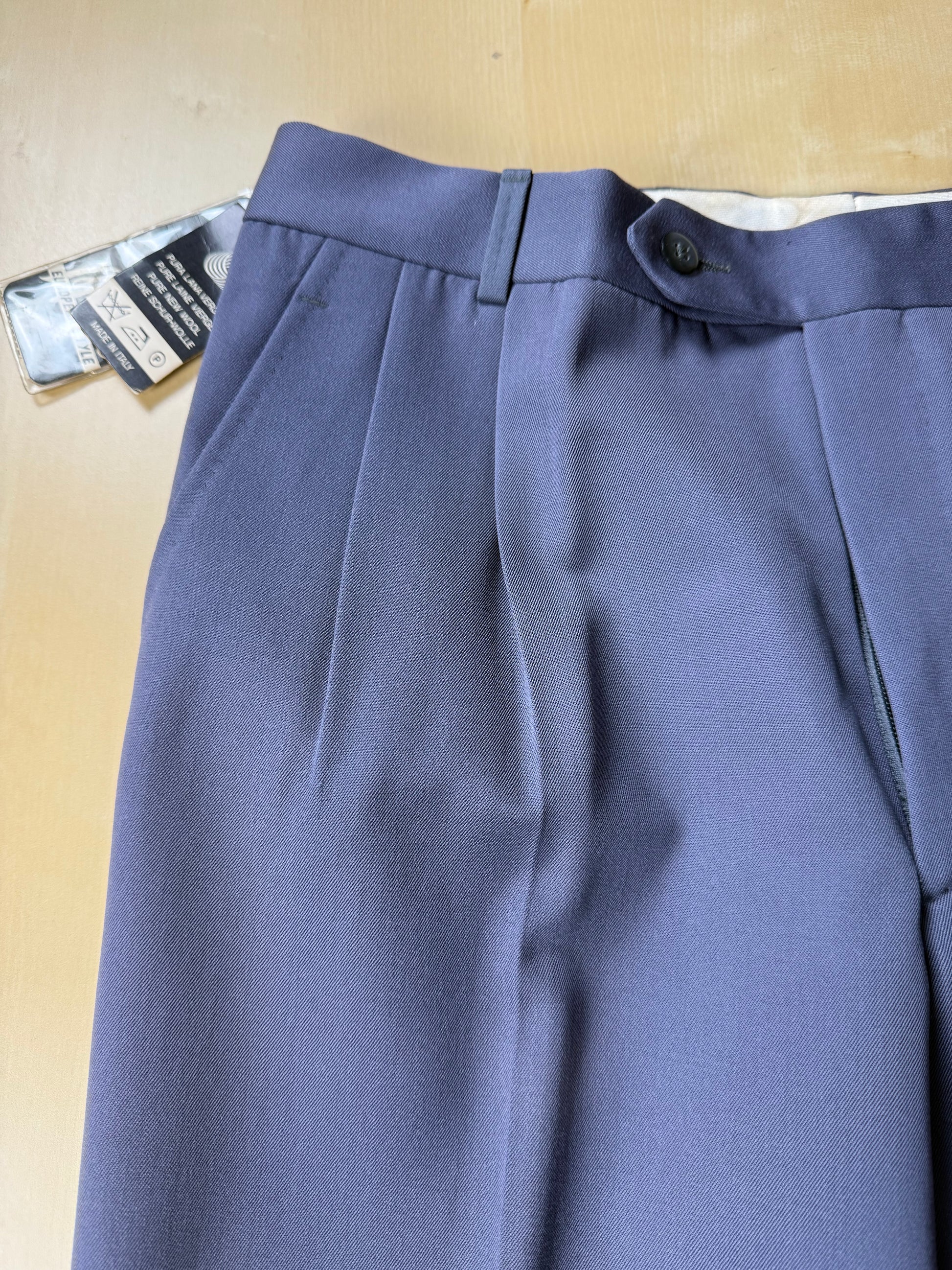 I pantaloni sono in condizioni di nuovo, ma a causa del lungo stoccaggio il tessuto si presenta leggermente scolorito sul fronte della gamba sinistra in corrispondenza della piega: vedere il dettaglio in foto (si tratta comunque di un difetto appena visibile).