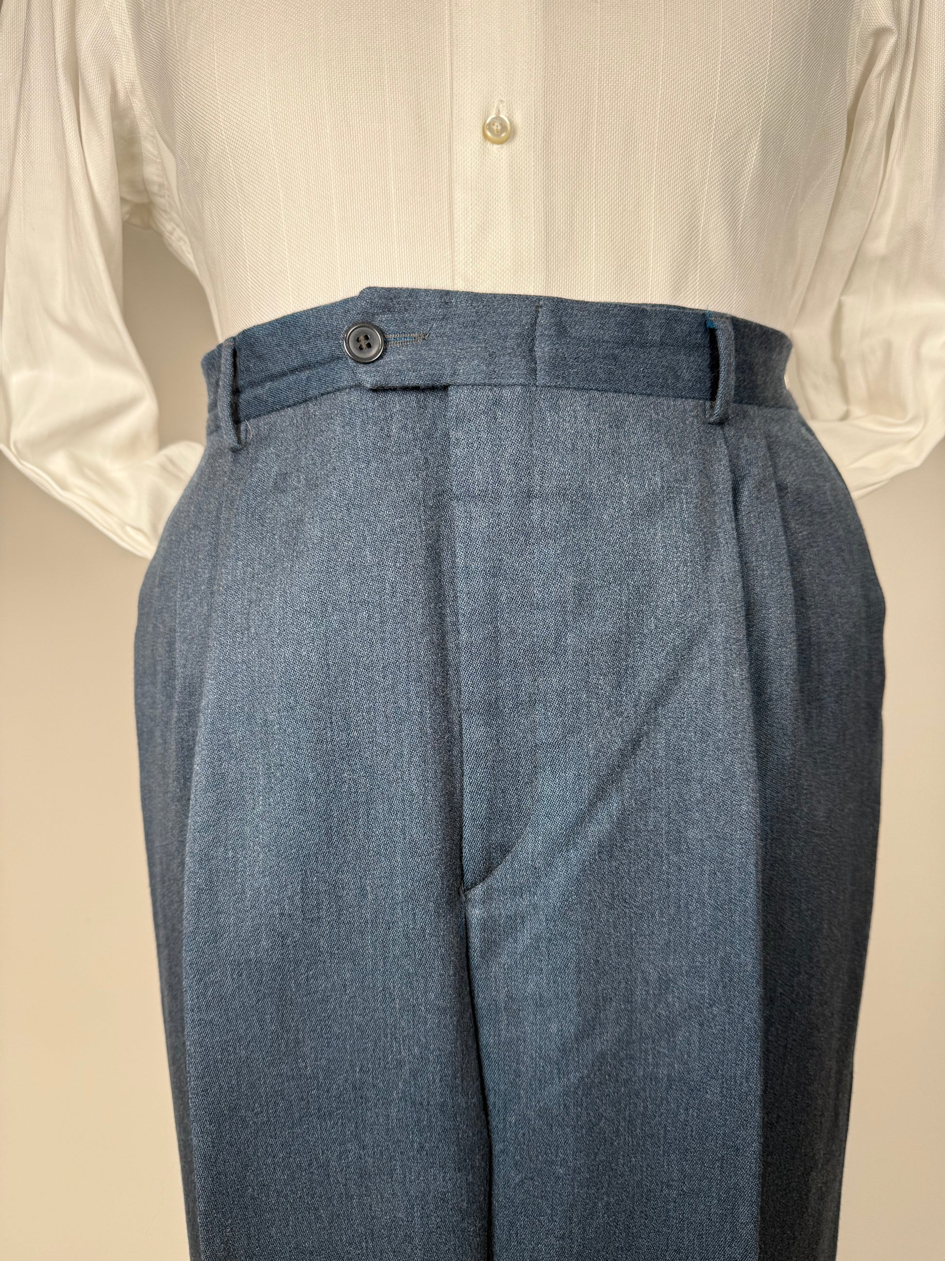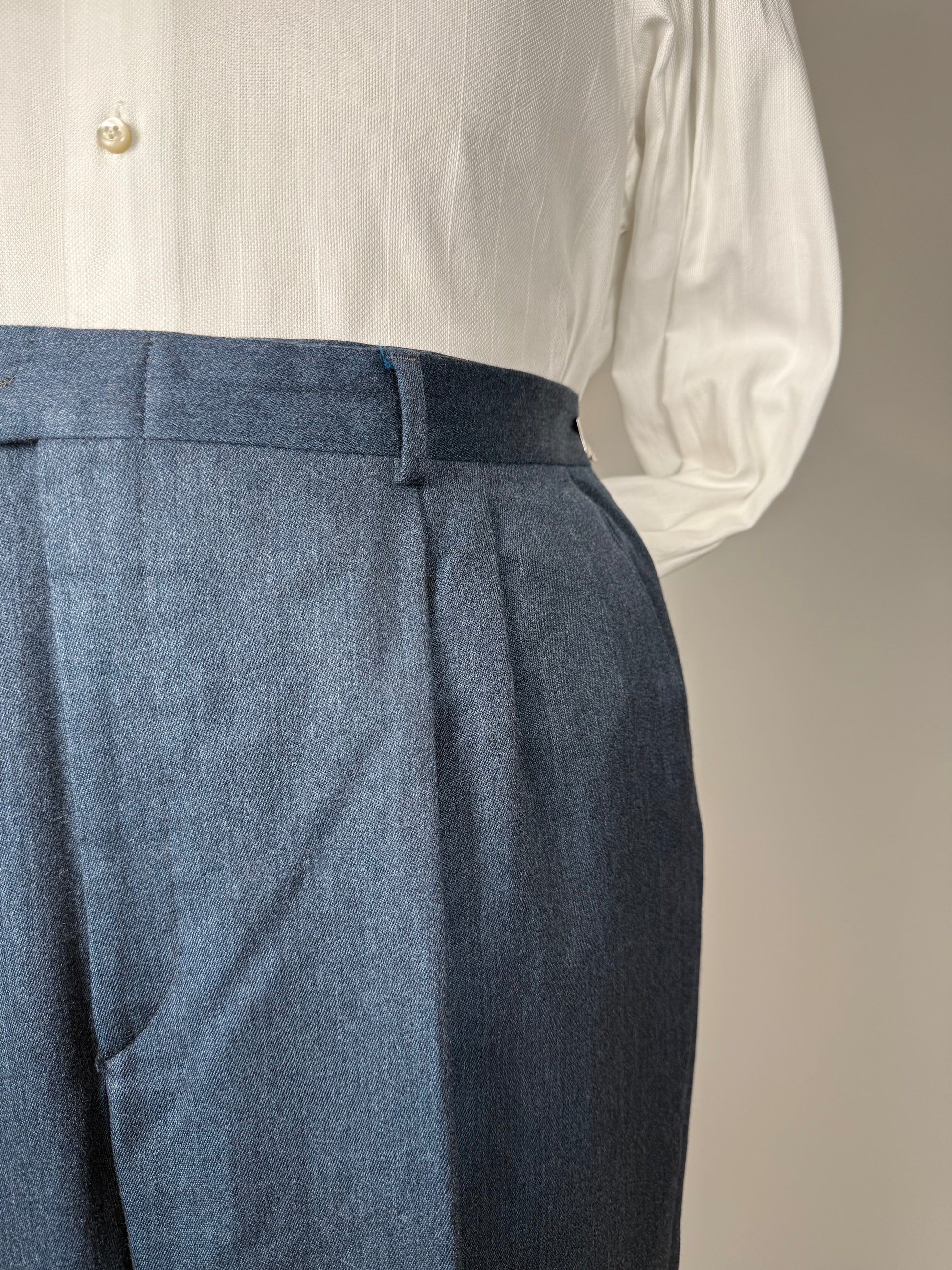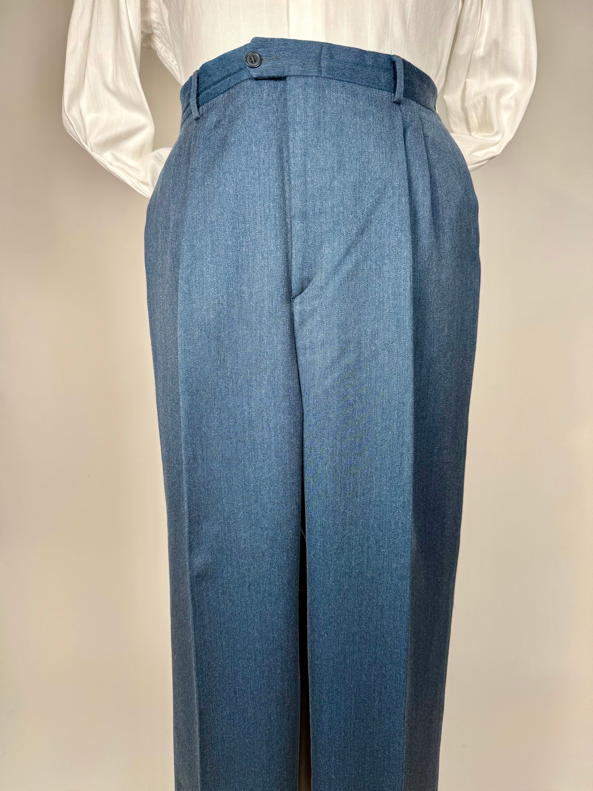 Pantaloni degli anni ‘80 in flanella 100% lana dalla mano mediamente pettinata, di un bellissimo colore blu mélange con sfumature di azzurro e cobalto.