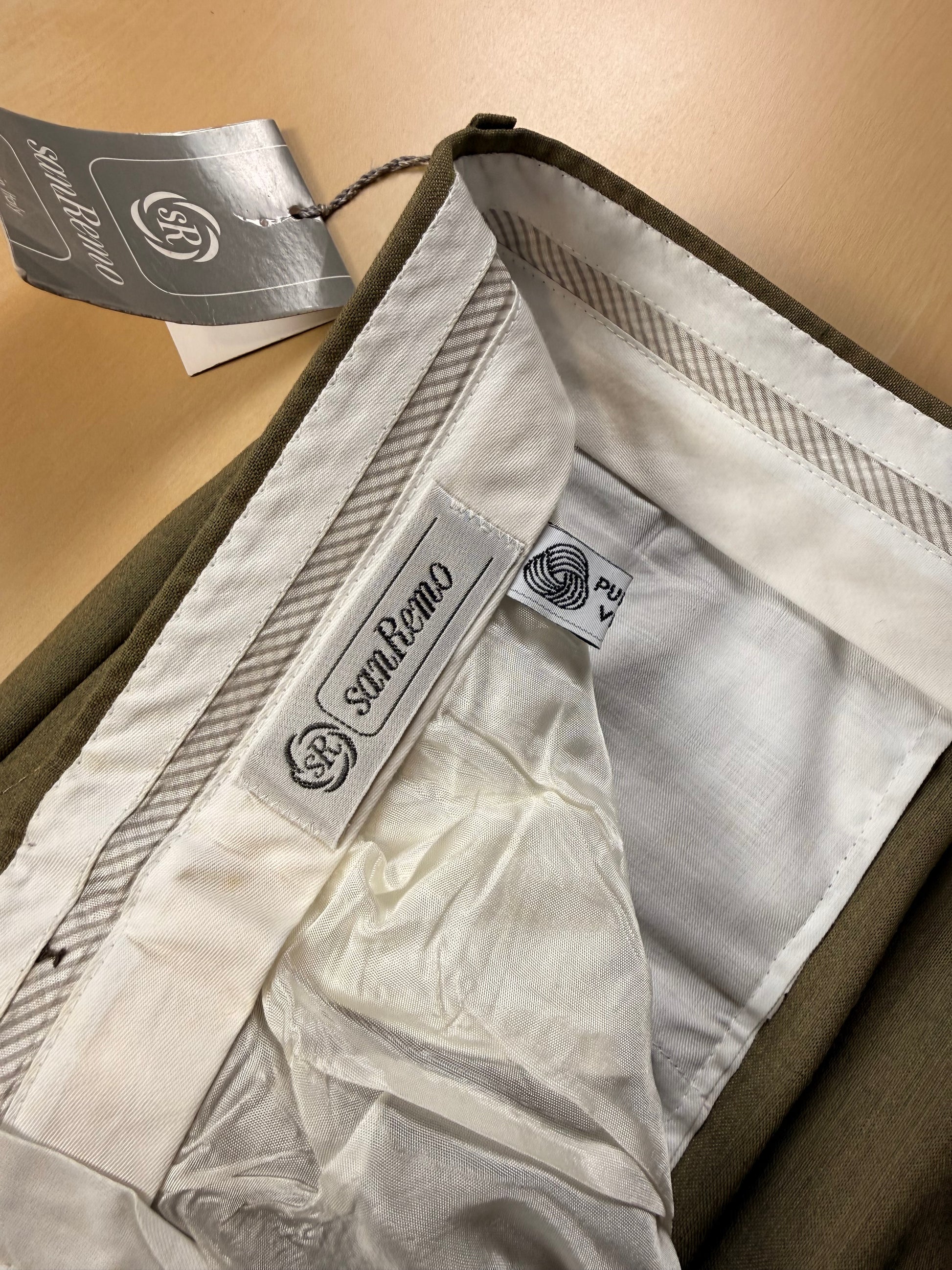 Pantaloni deadstock da vecchio fondo di negozio anni ‘80: capo di eccellente qualità vintage ma nuovo con cartellino, mai indossato e con fondo ancora da orlare. Completo di strisce battitacco da applicare al fondo.