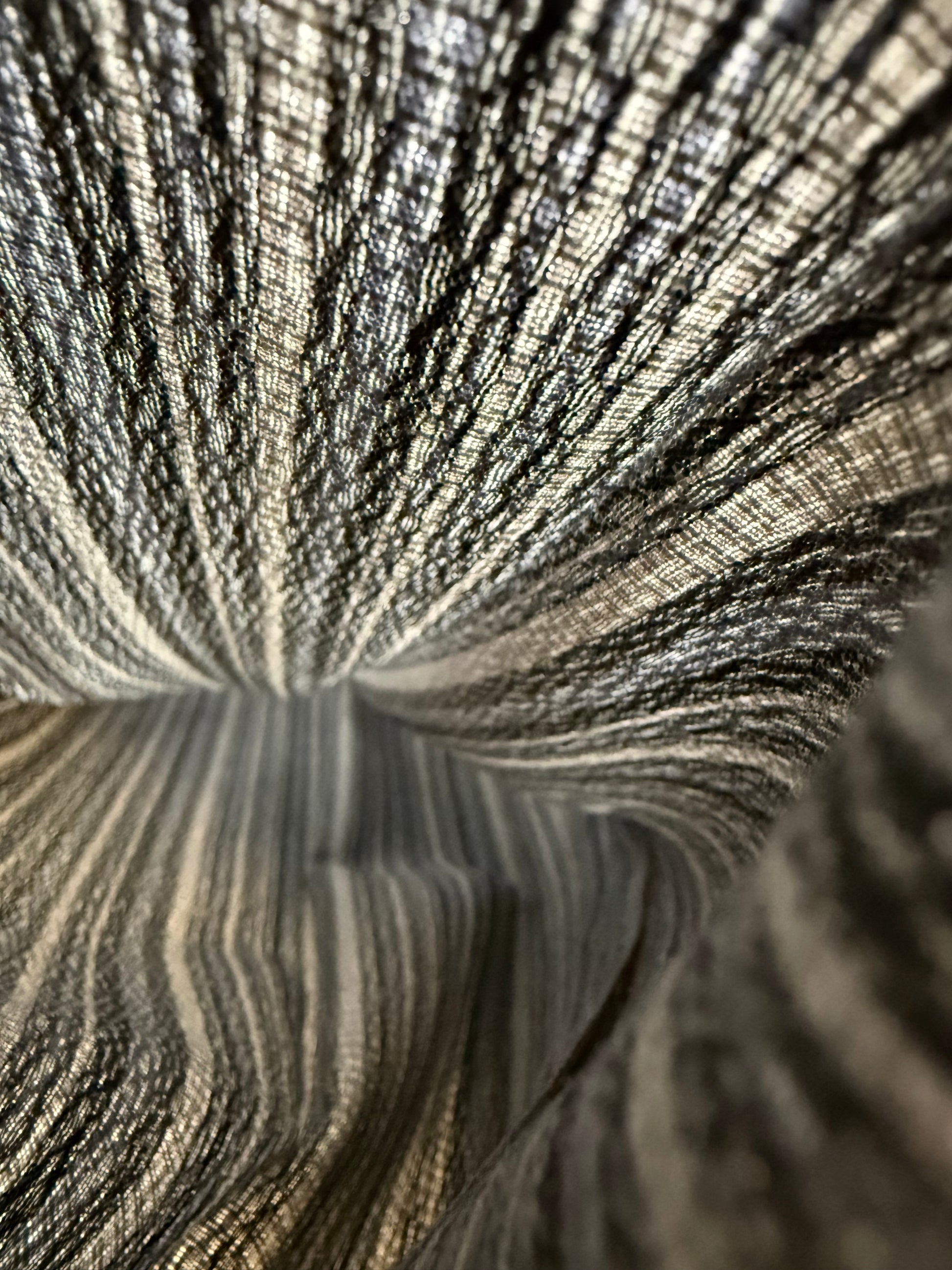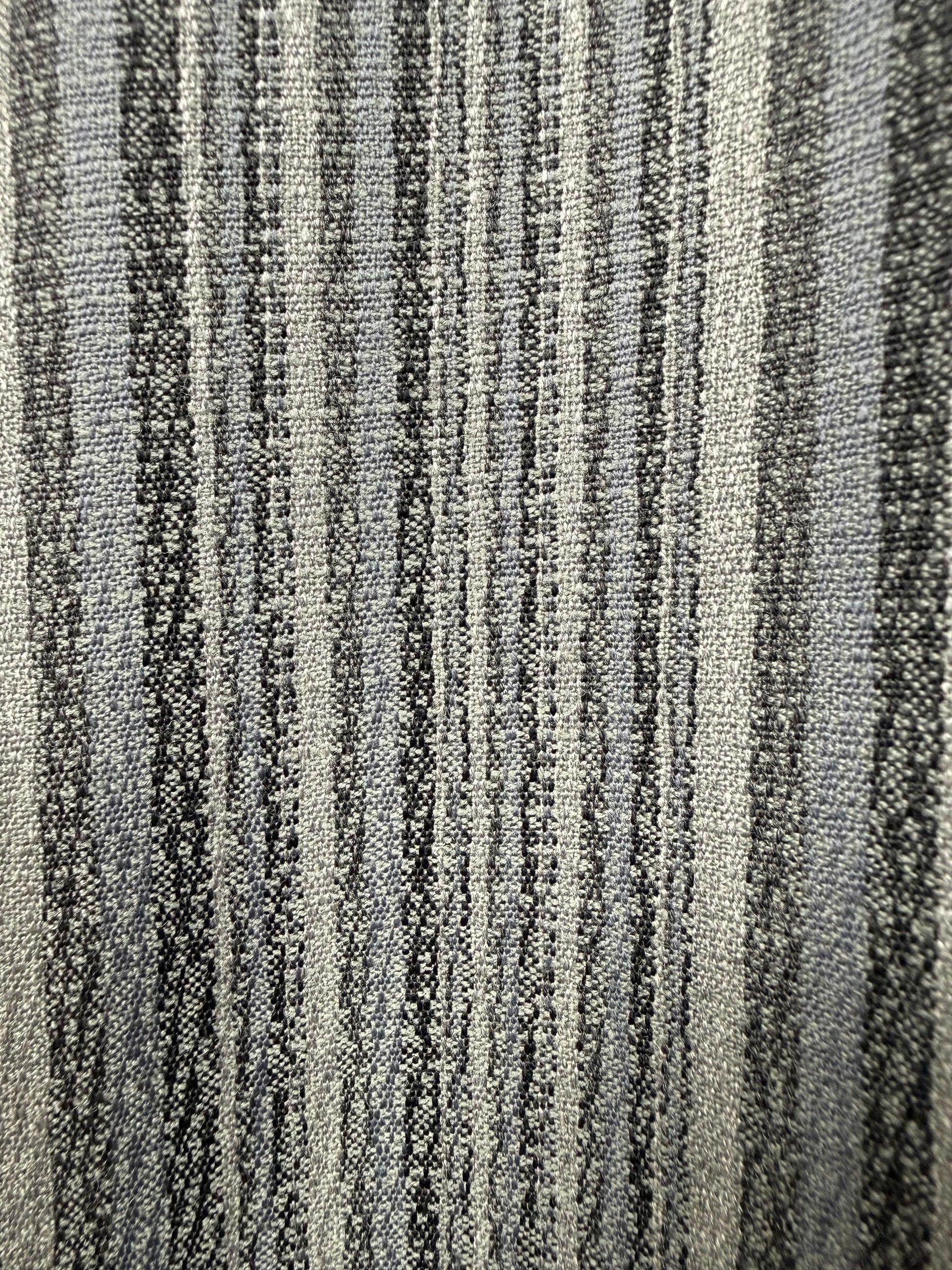 Tessuto fresco lana, 100% lana vergine, in una particolarissima fantasia con striature verticali sfumate sulle tinte del grigio.