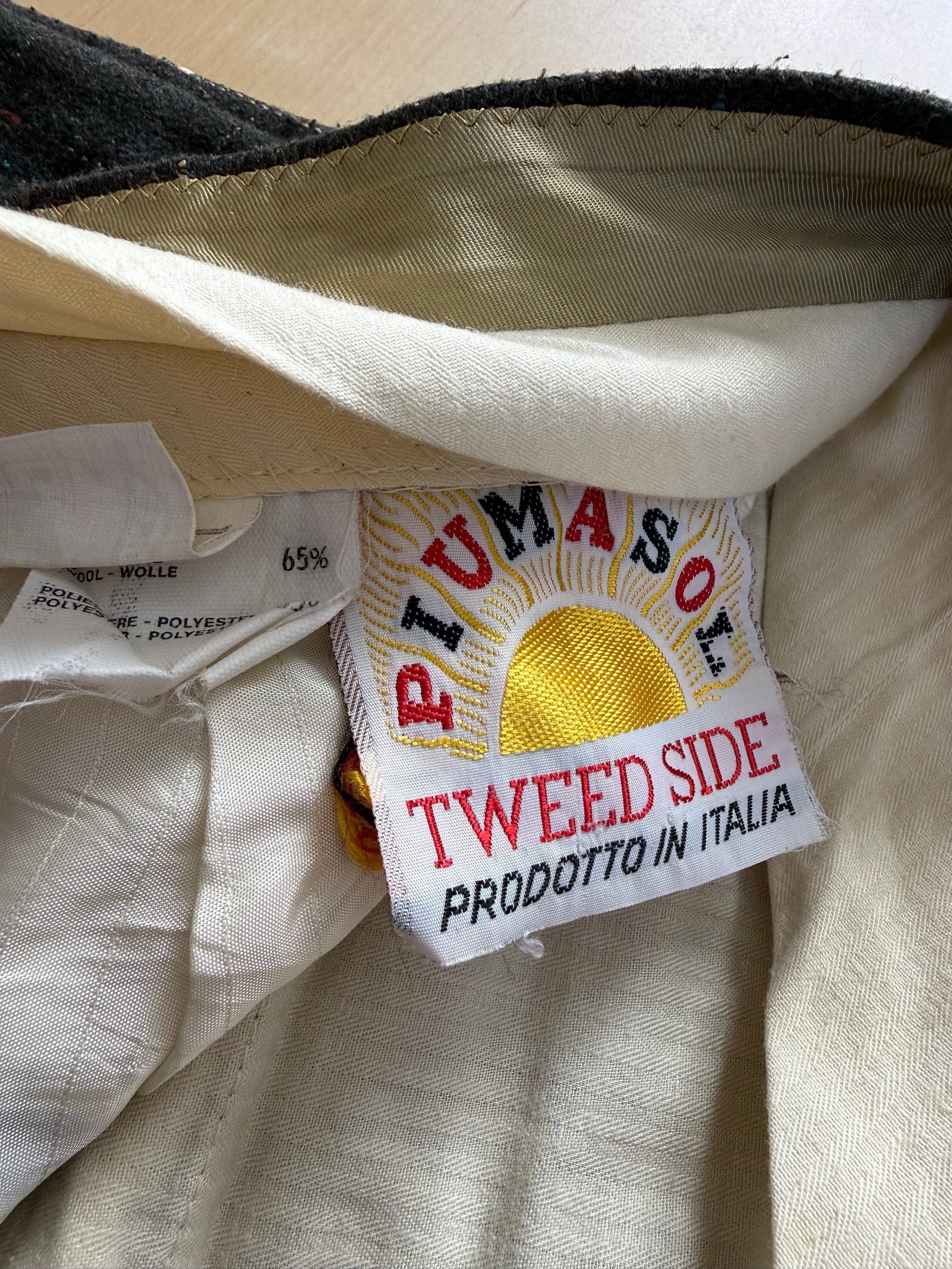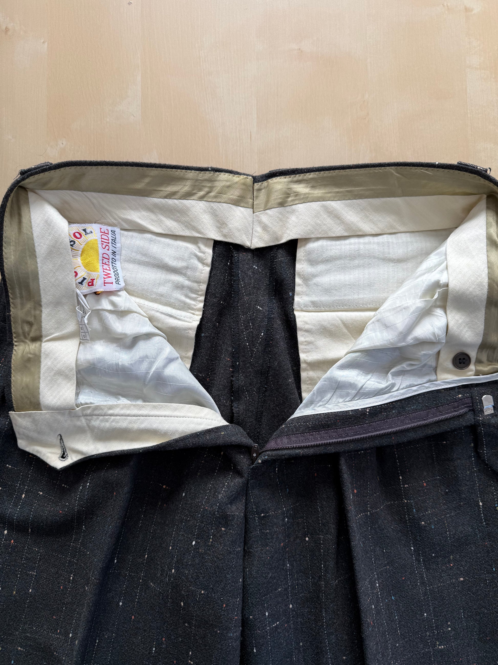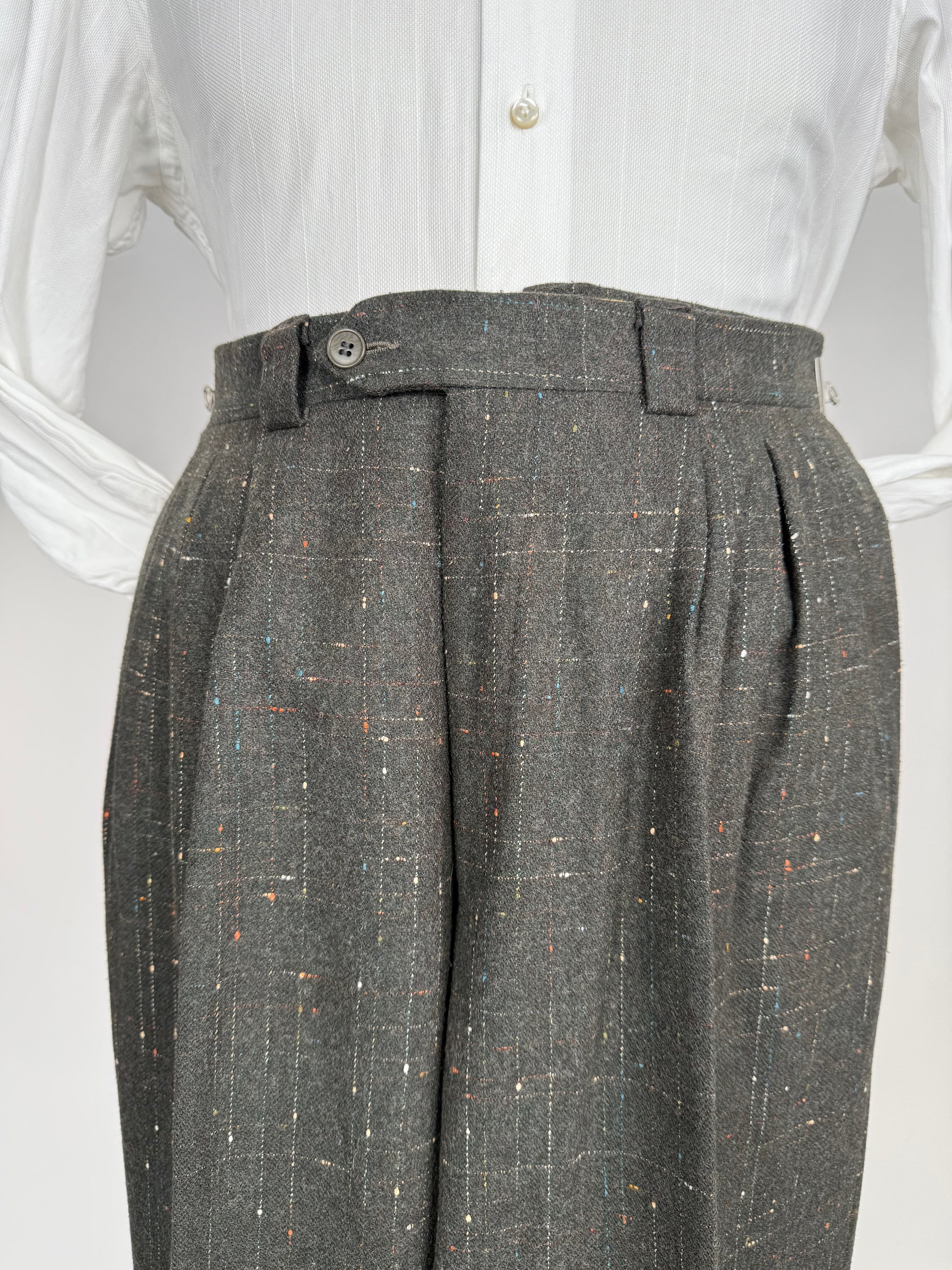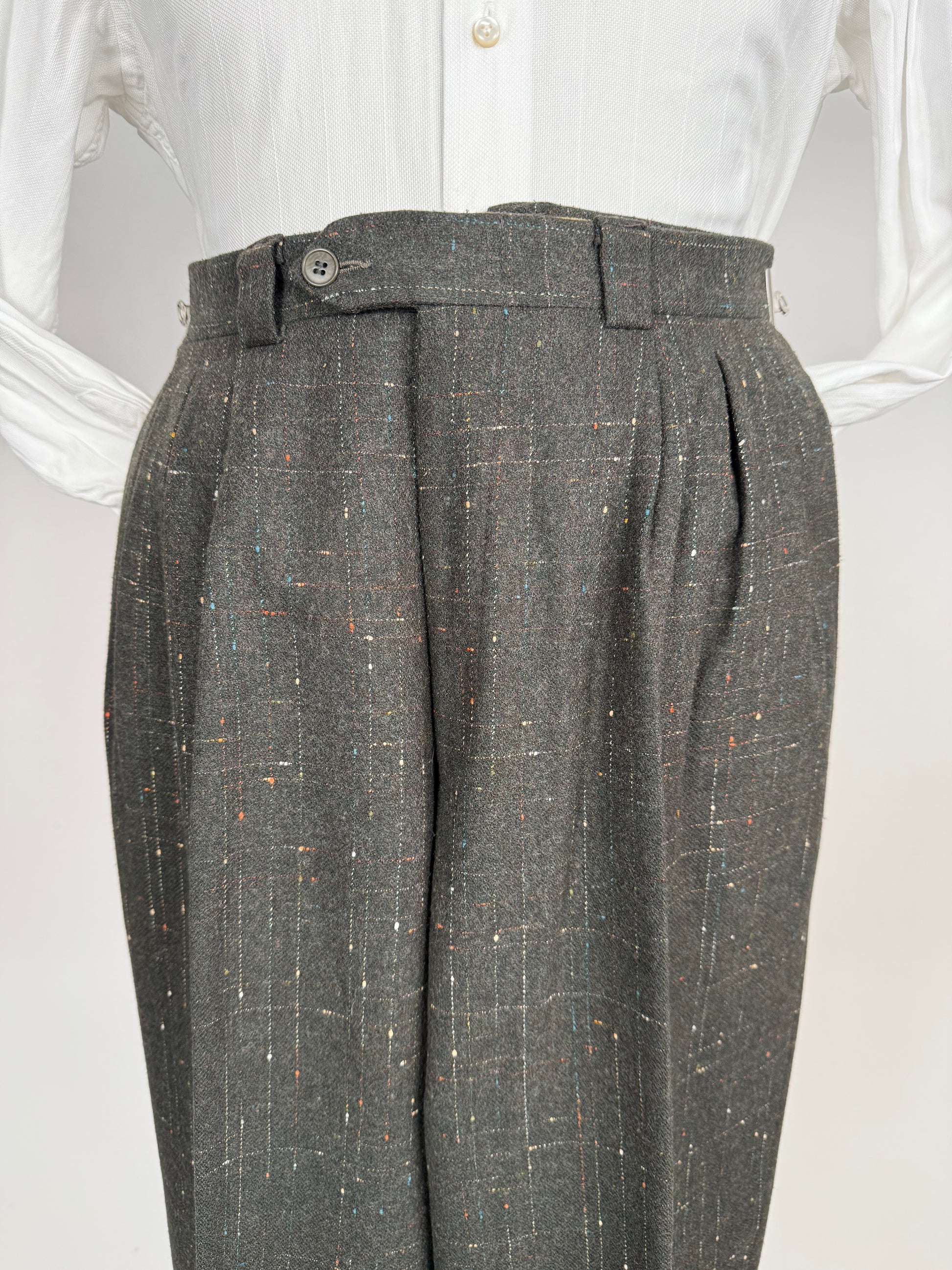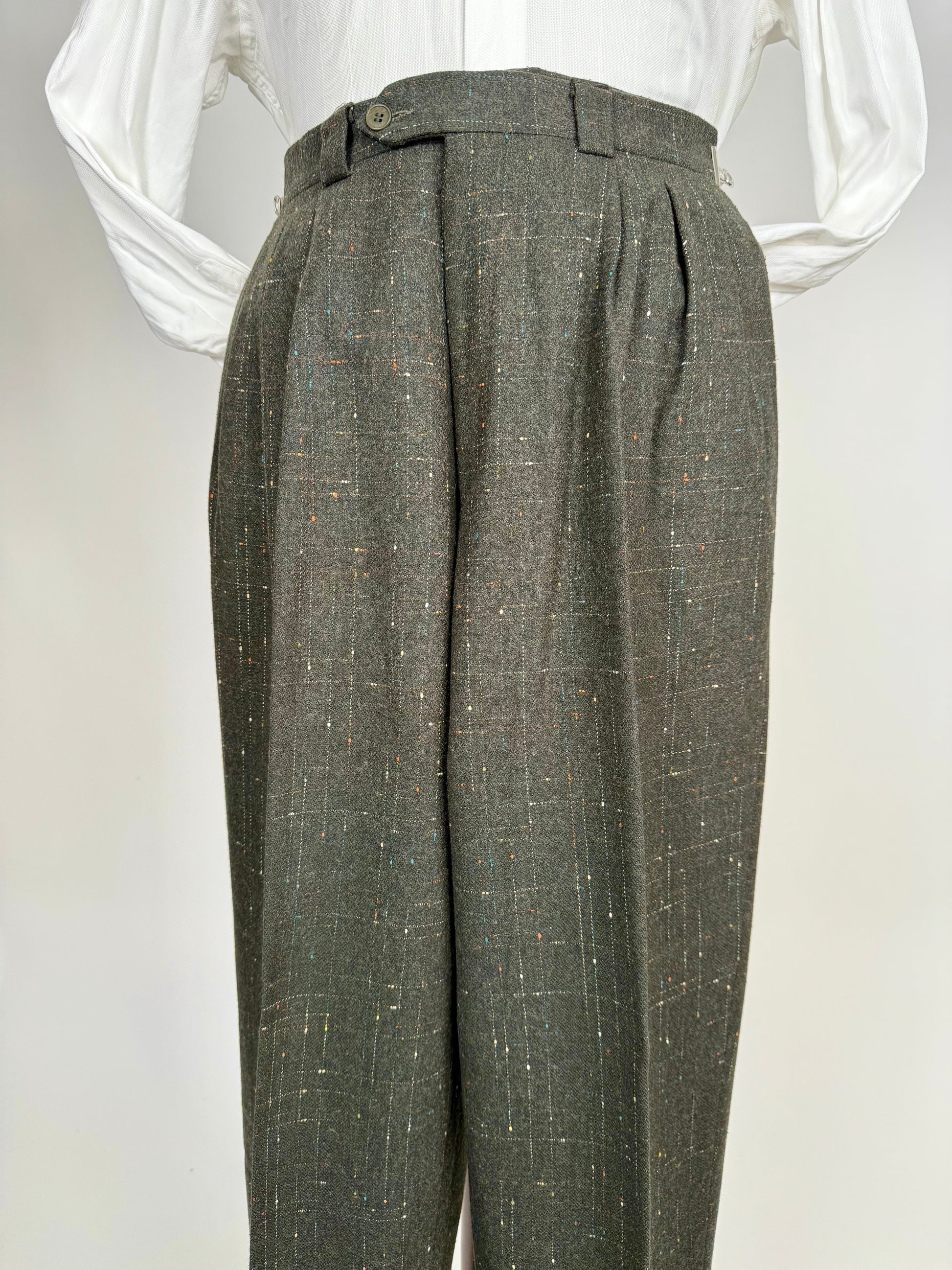 Pantaloni vintage anni ‘80 made in Italy, caratterizzati da un originale tessuto in tweed misto lana con motivo Atomic Fleck: una lavorazione bottonata multicolore simile al donegal, popolarissima in certo stile rockabilly americano a cavallo degli anni ‘50.