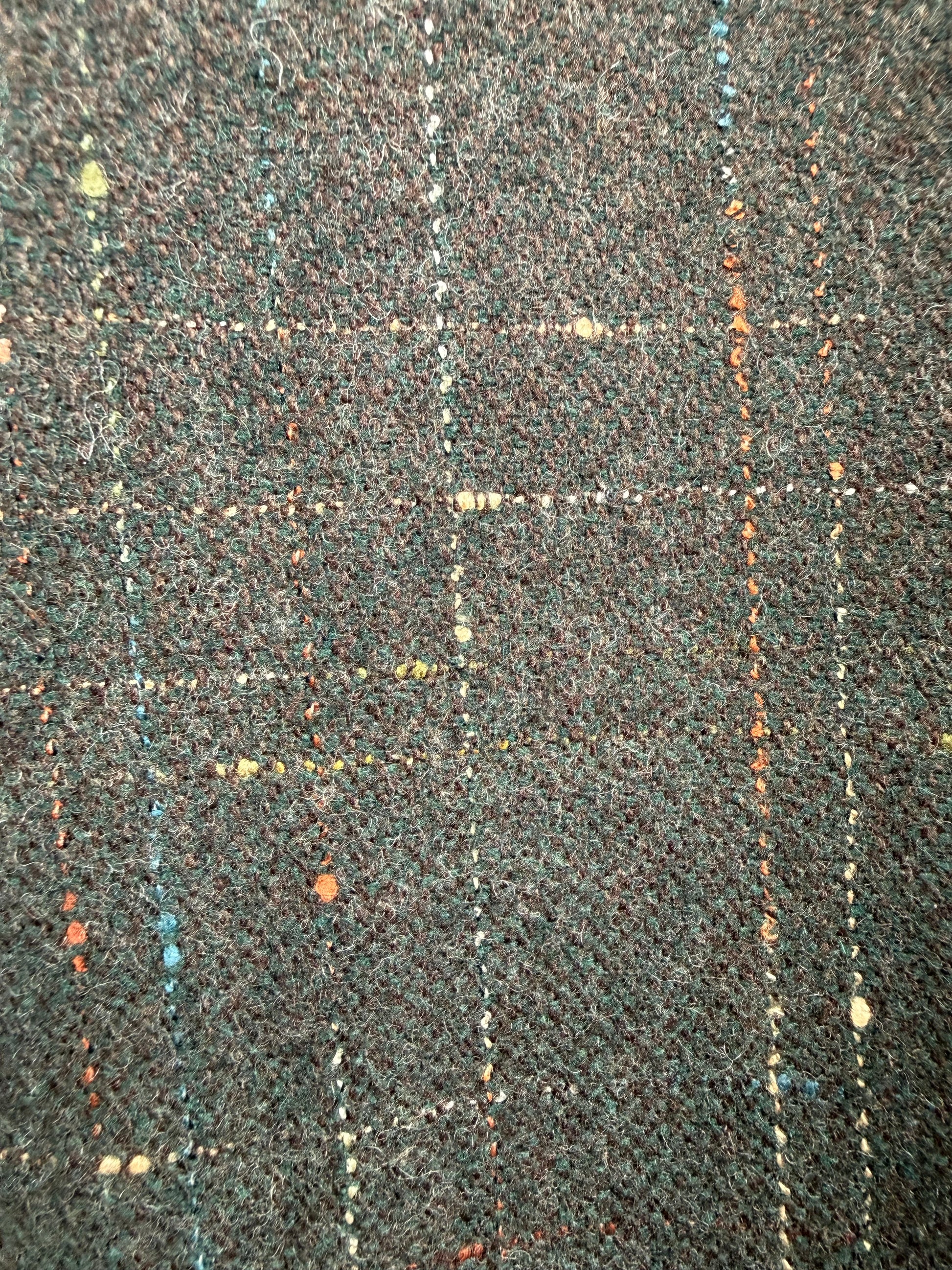 Tessuto di peso invernale in 65% lana e 35% poliestere, con punti di filato multicolore su fondo verde scuro.