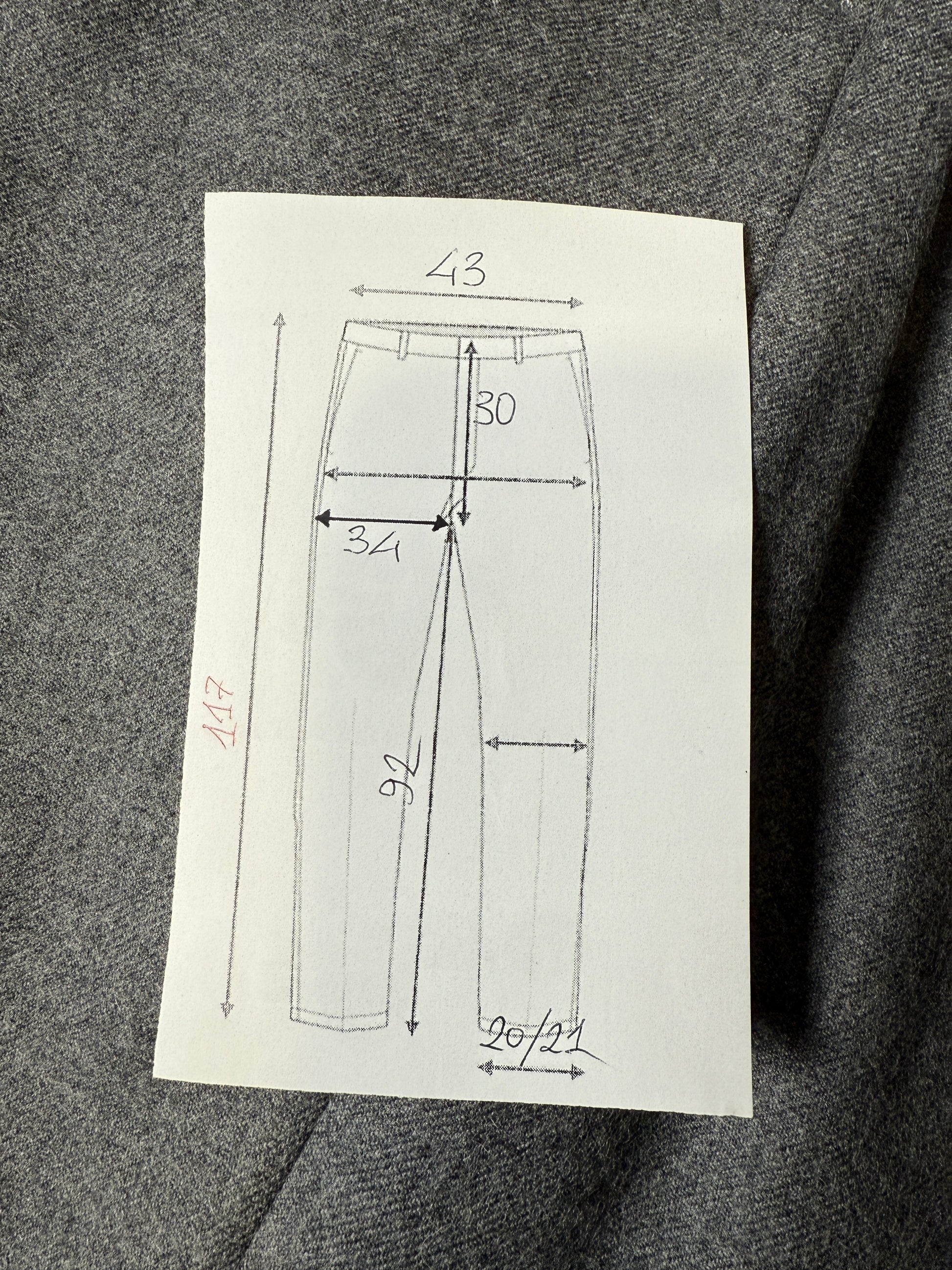 I pantaloni sono nuovi e hanno l’orlo di fondo soltanto imbastito, ma ancora da chiudere e con la lunghezza intera conservata.