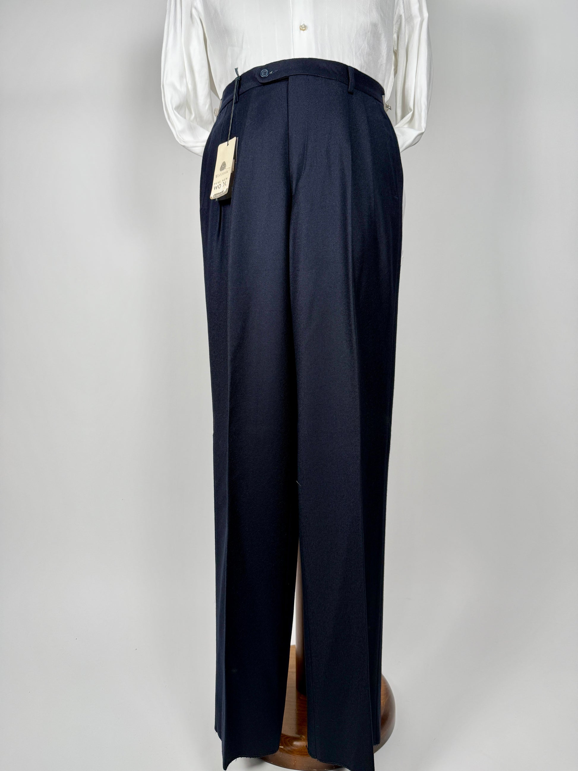Pantaloni anni ‘80 da fondo di magazzino, in condizioni di nuovo con cartellino e con fondo ancora da orlare.