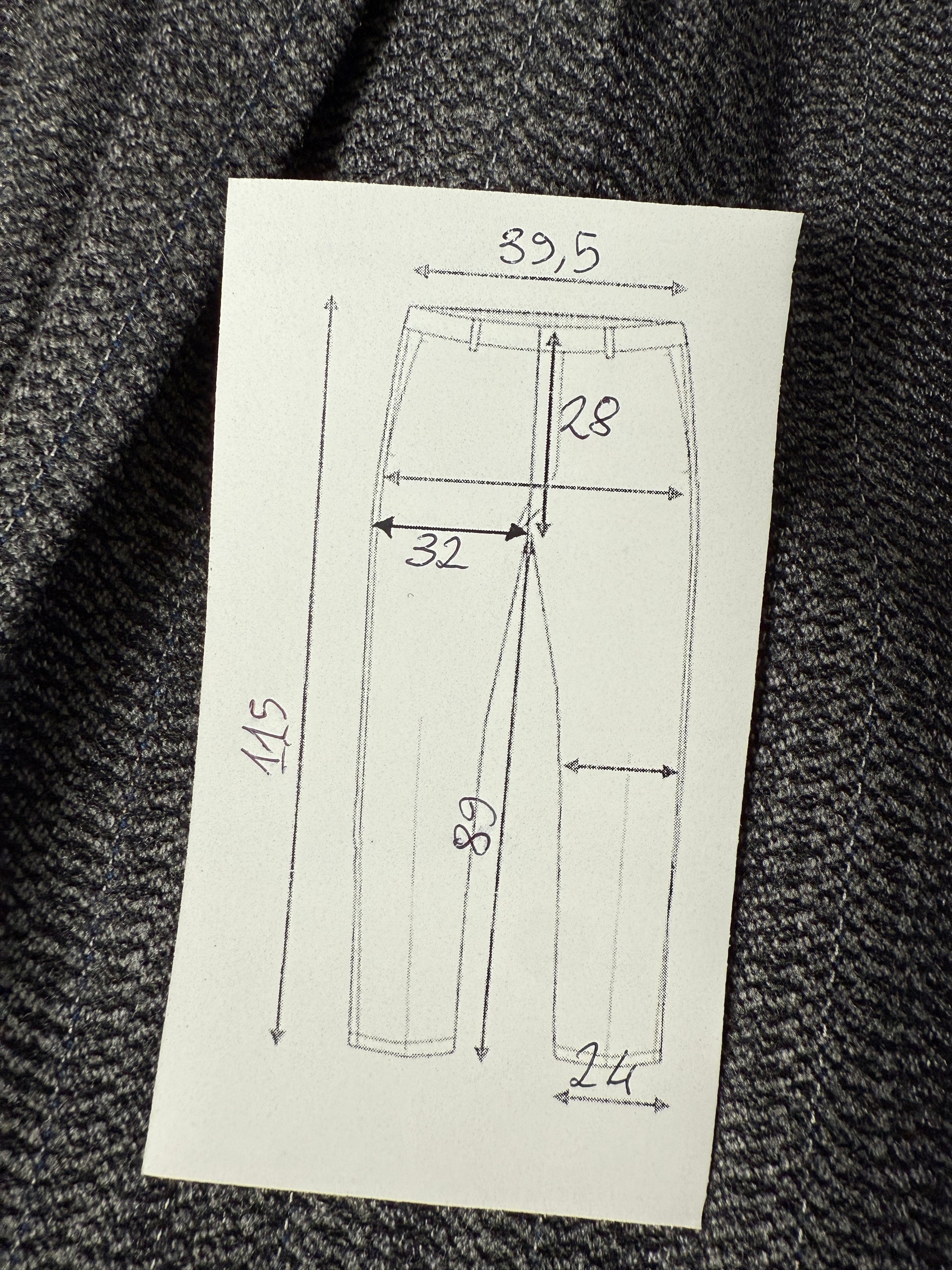 Questa misura è utile (e viene da noi riportata) solo nel caso di pantaloni dalla gamba svasata e/o con fondo a campana (tipo anni '70): serve a valutare la vestibilità del pantalone sul centro gamba e, se confrontata con la misura del fondo (G), l'entità della "zampa".
