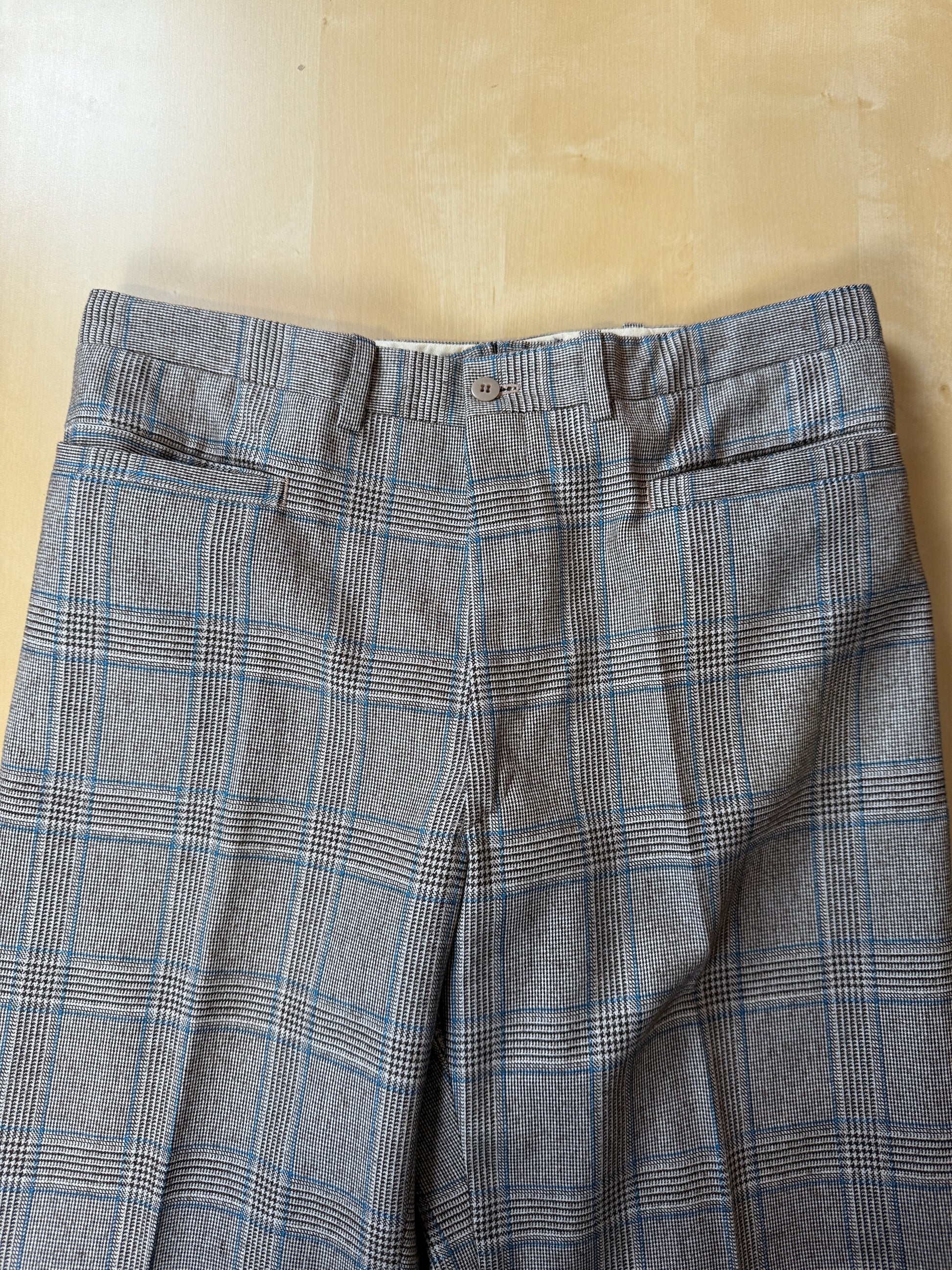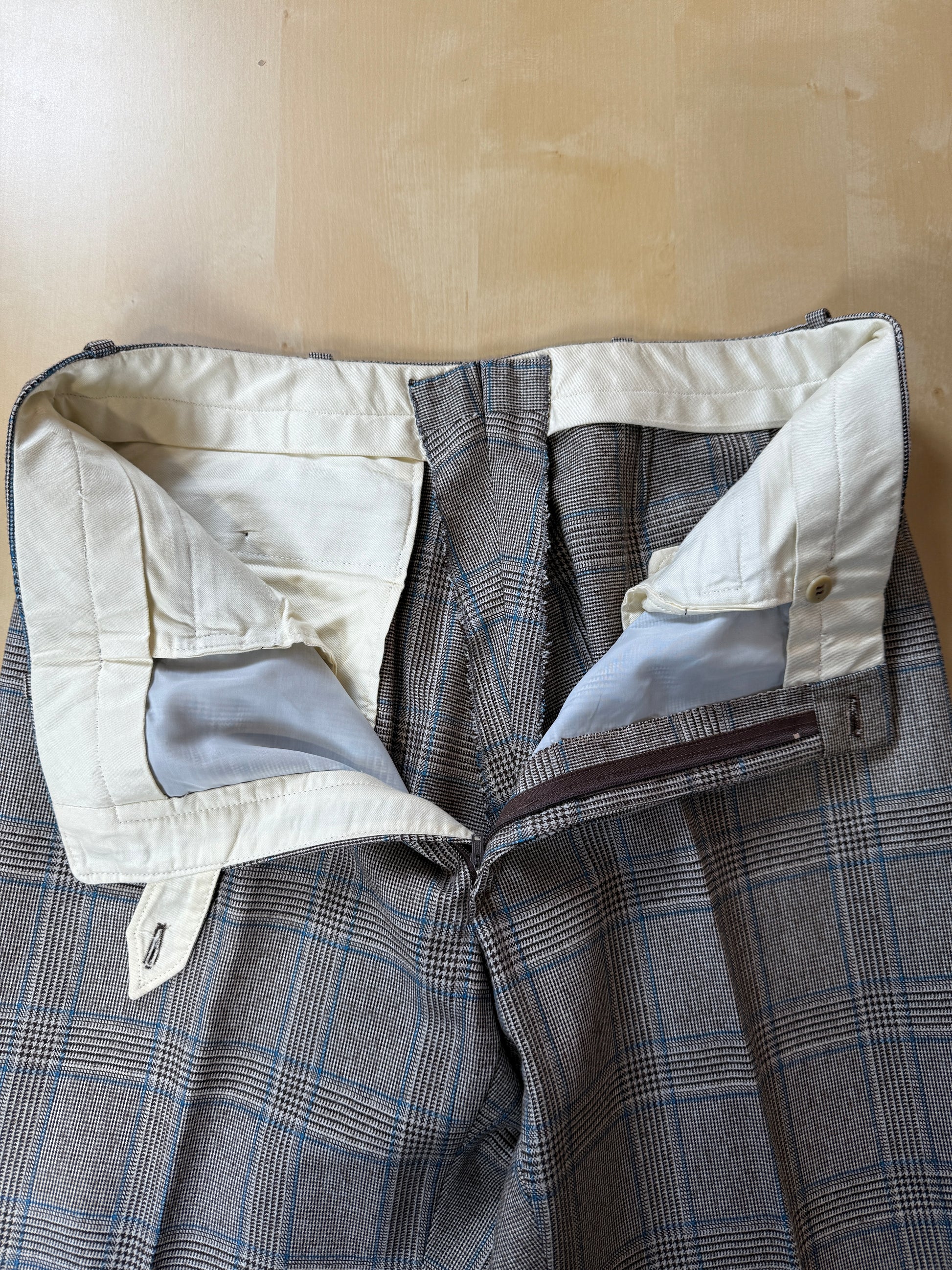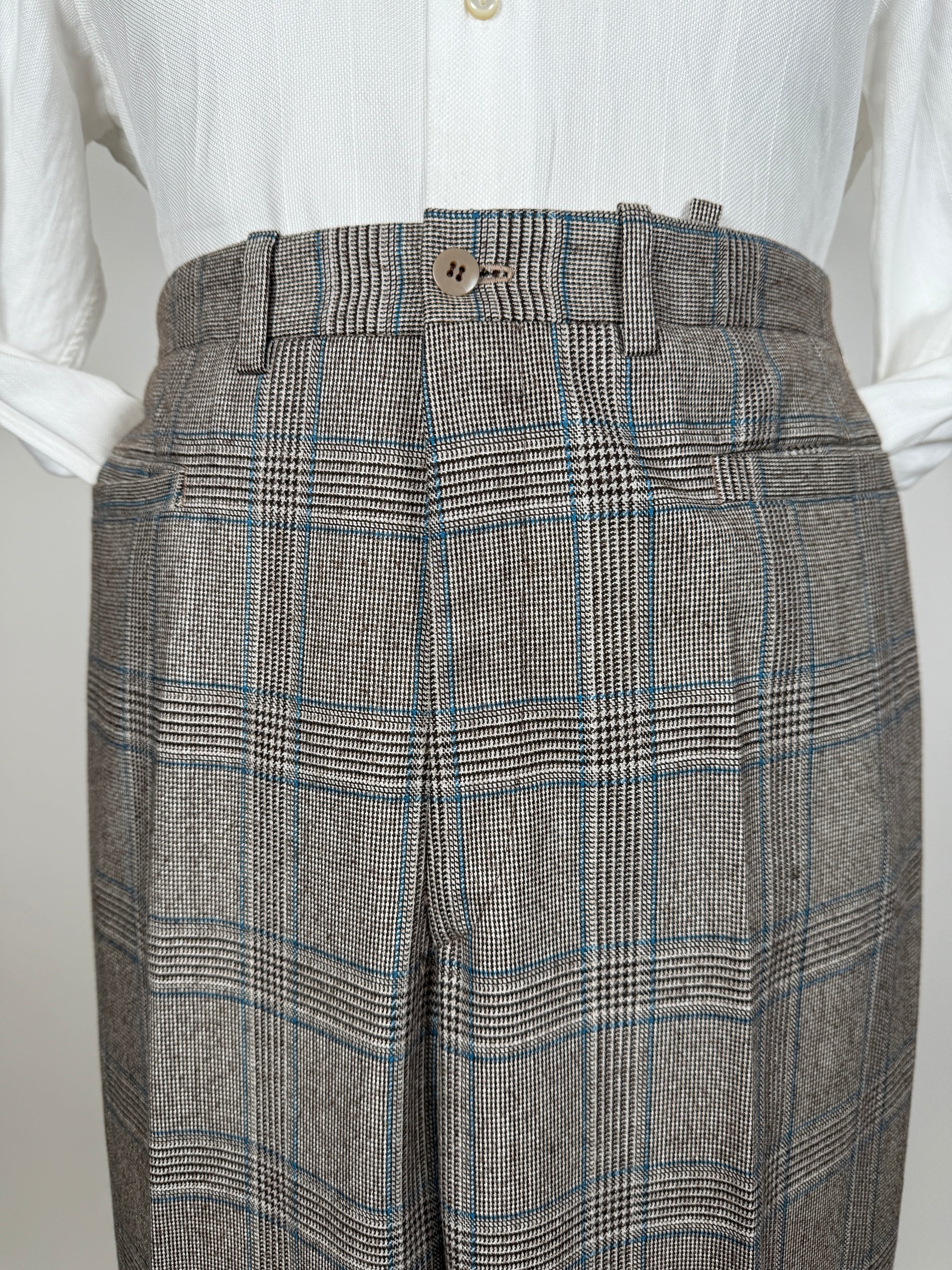 Pantaloni anni '70 di confezione sartoriale, in flanella di lana cardata con fantasia principe di Galles grigio a riga blu.