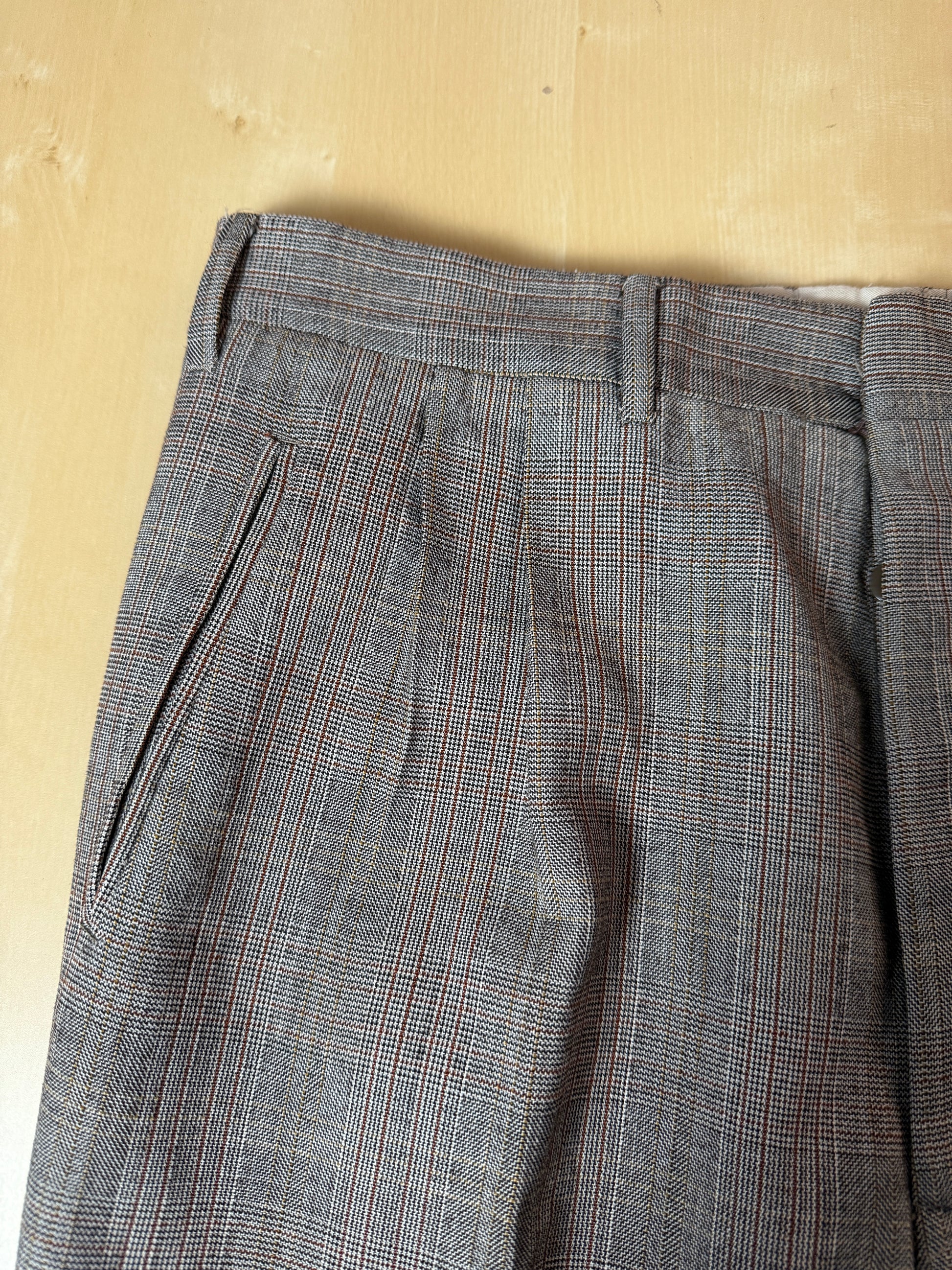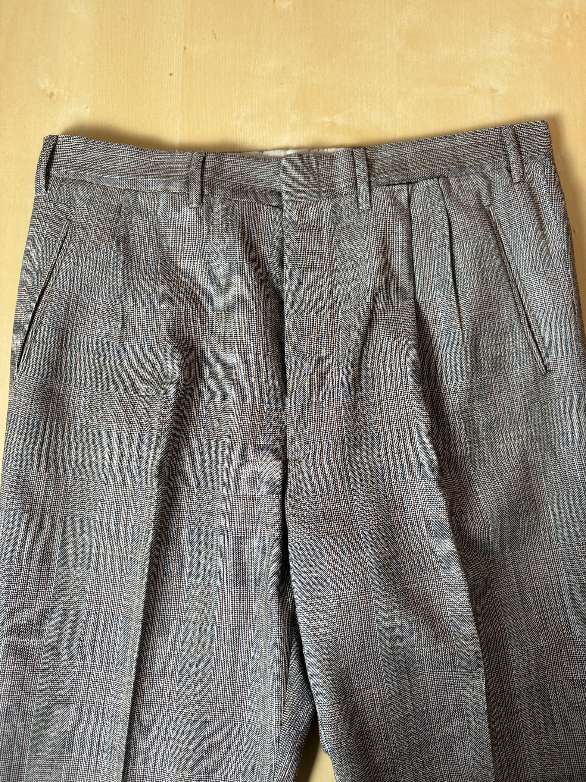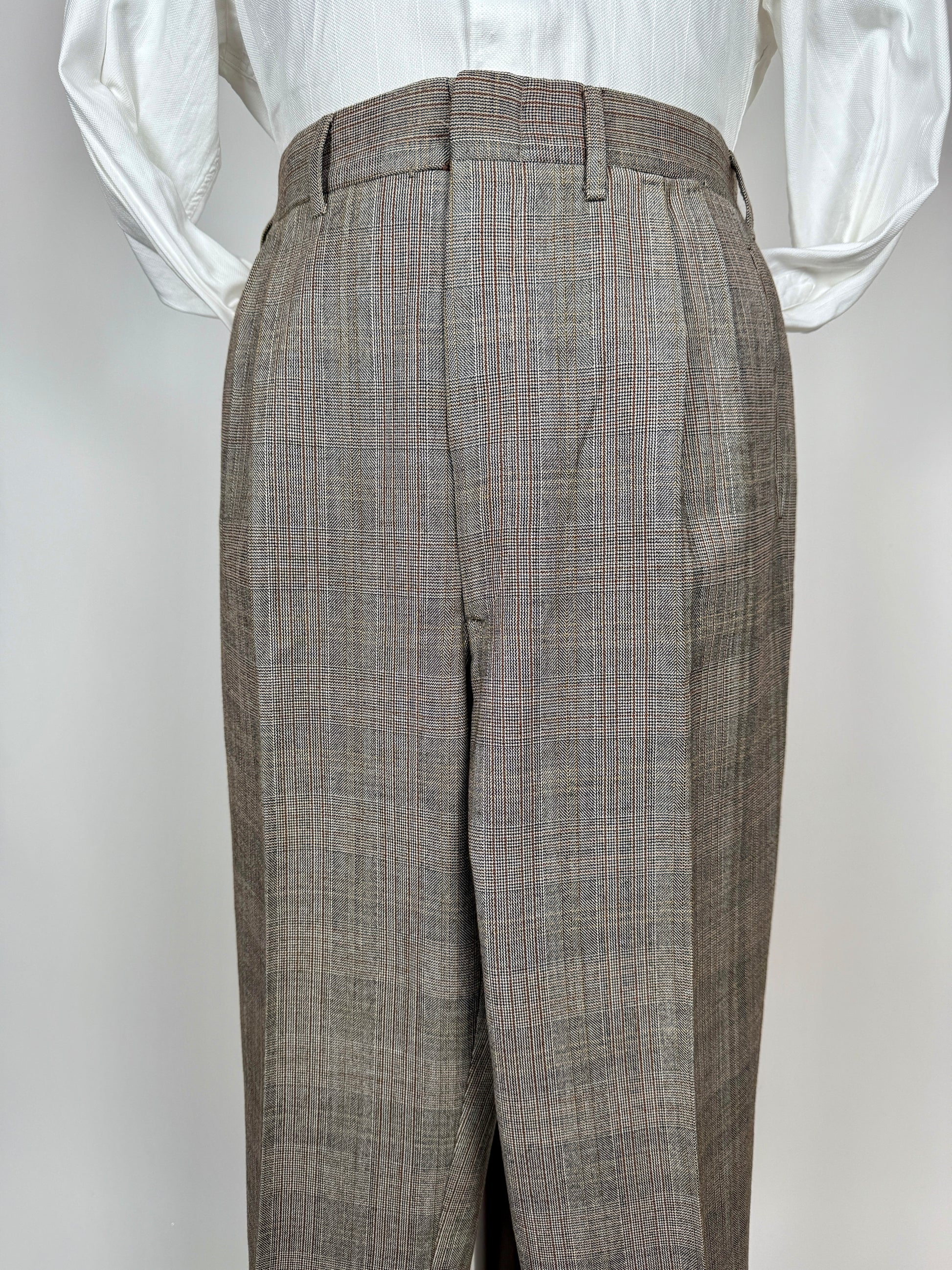 Pantaloni sartoriali degli anni '50/'60, in uno stupendo tessuto 100% lana pettinata pesante. Fantasia principe di Galles ottenuta con trama a grisaglia a fili bianchi e neri. Righe in trama colore ruggine e giallo.