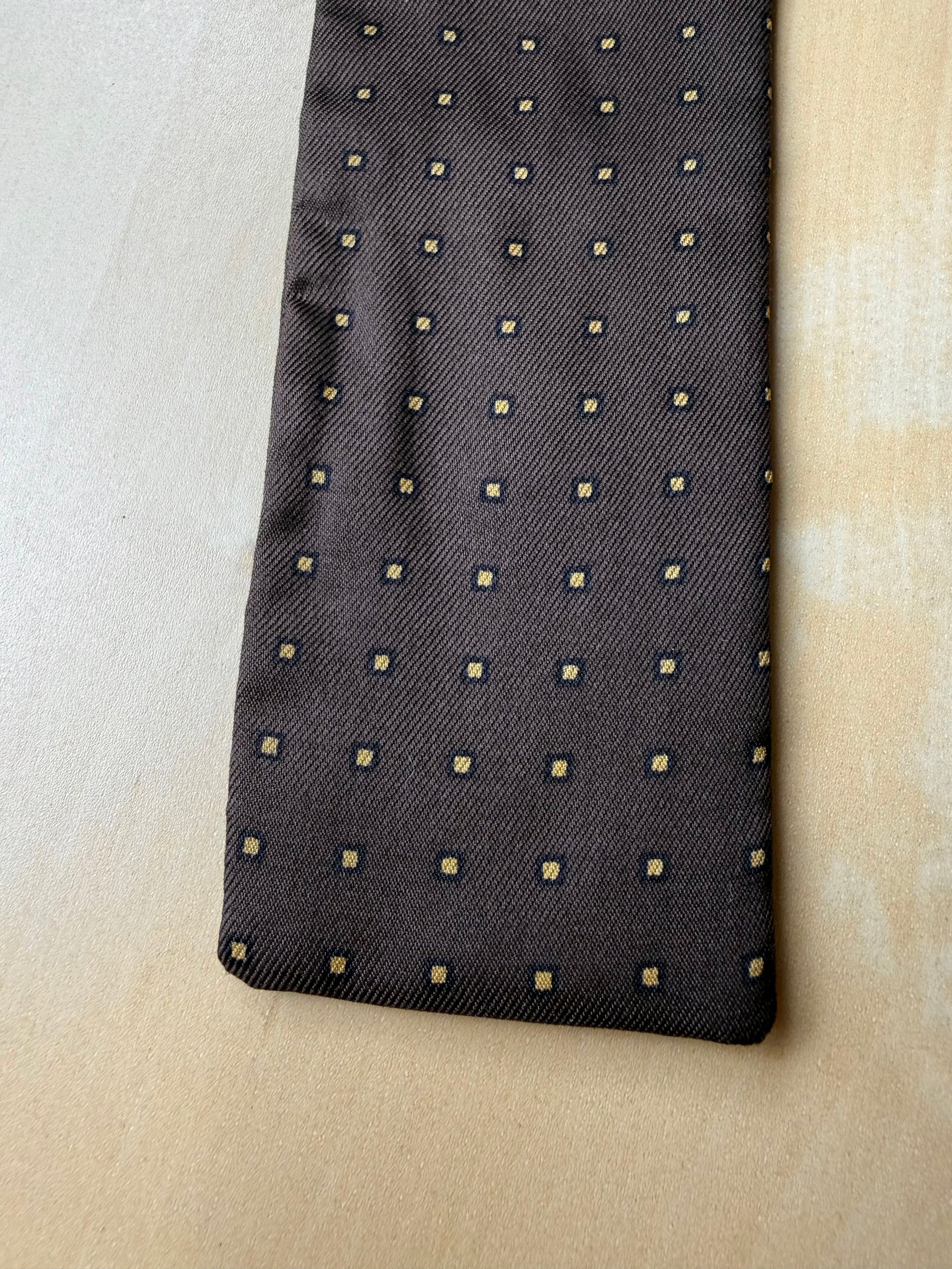 In twill 100% seta, colore marrone scuro con micro fantasia a quadratini gialli.