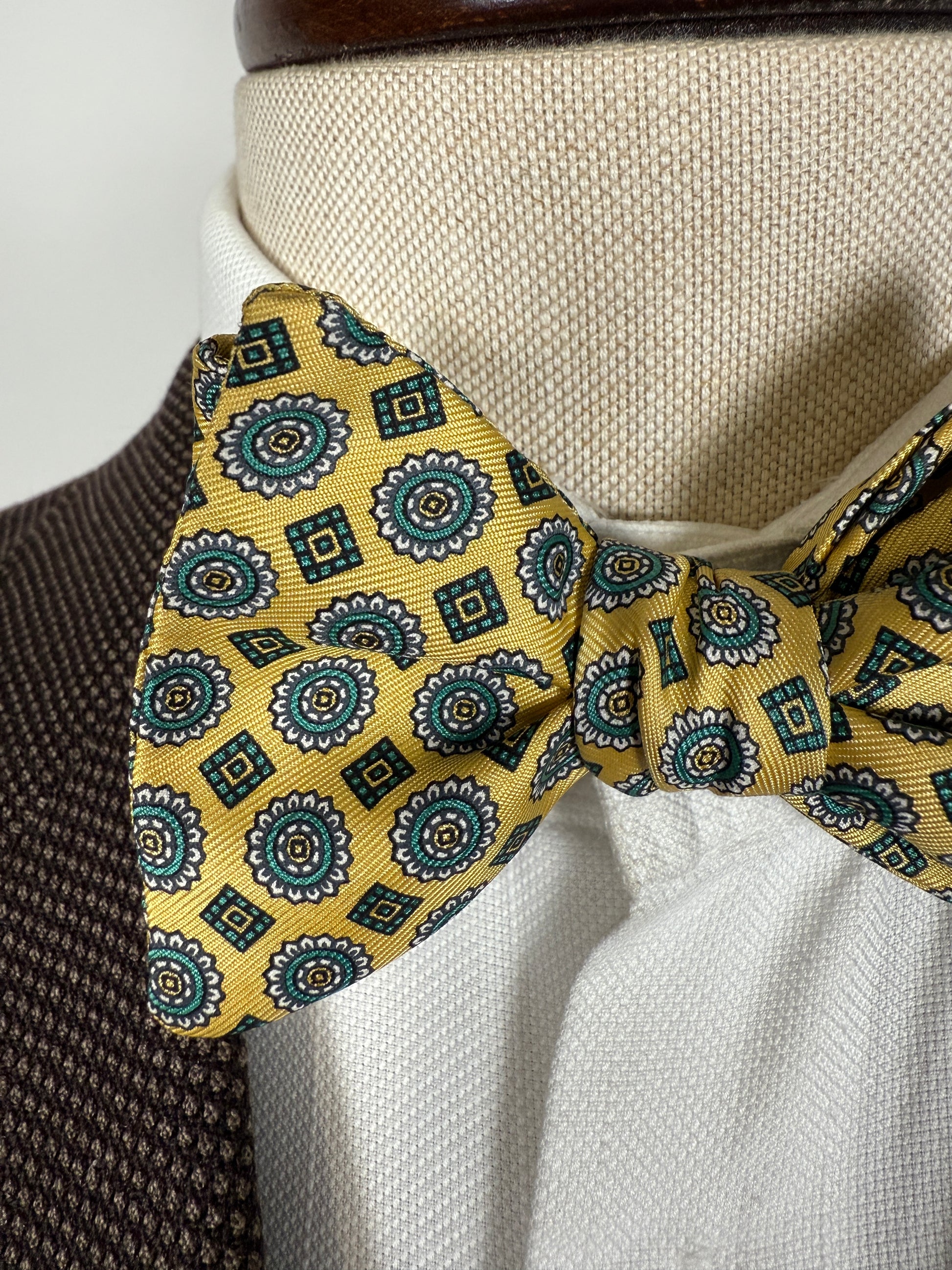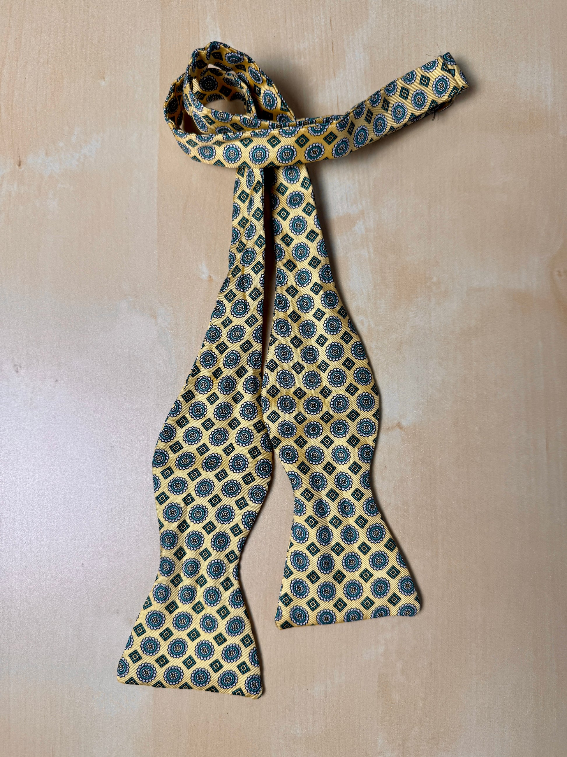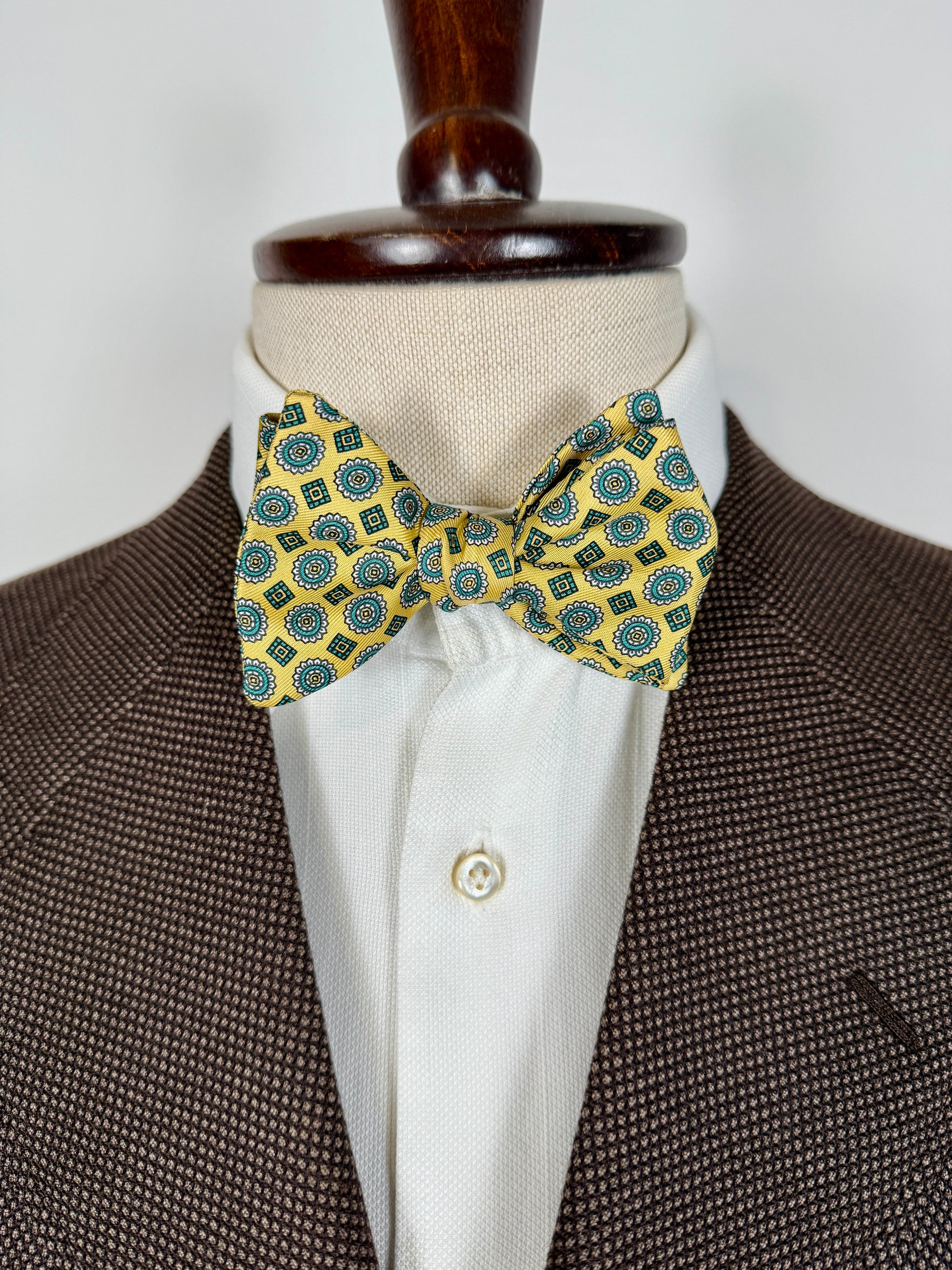 Cravatta a farfalla classica da annodare, in twill 100% seta colore giallo pastello con fantasia geometrica a rosette e rombi sui toni del blu e verde.