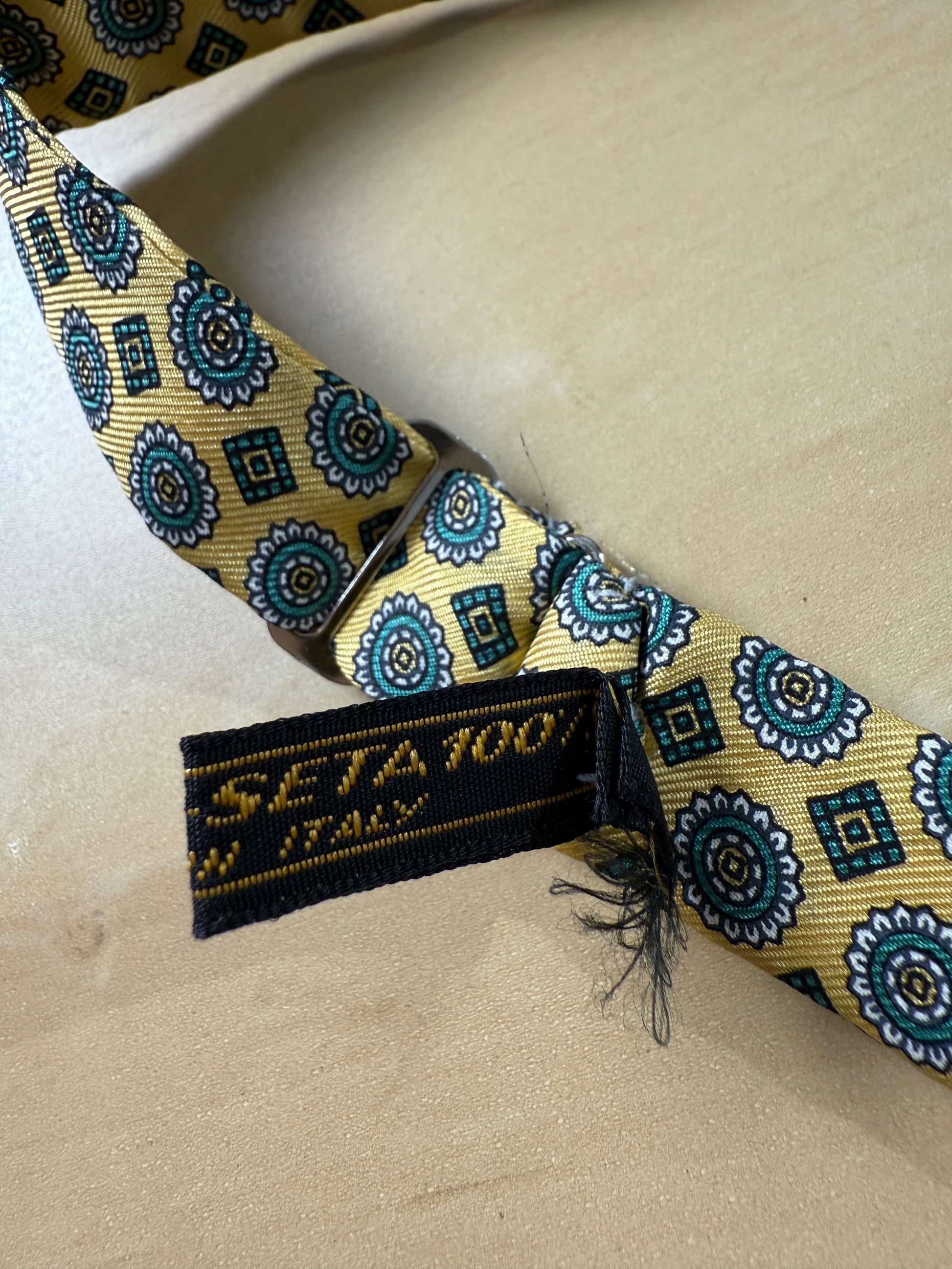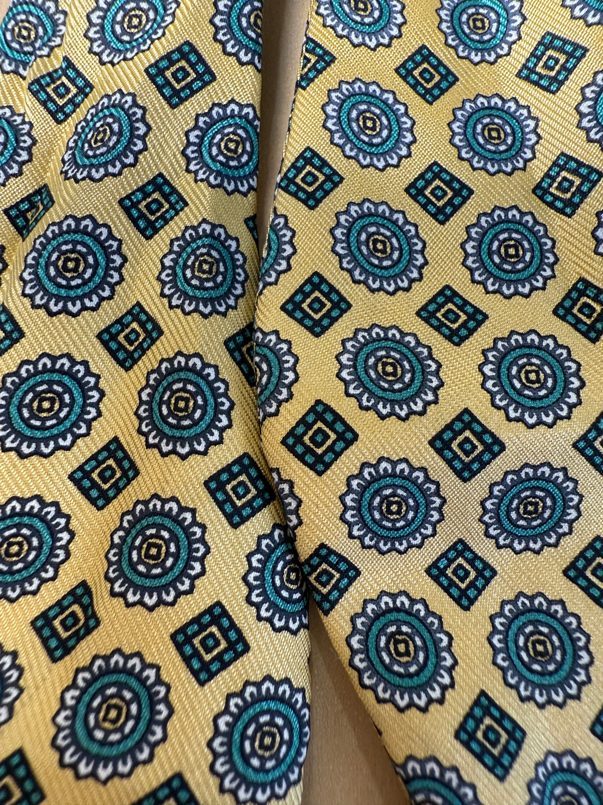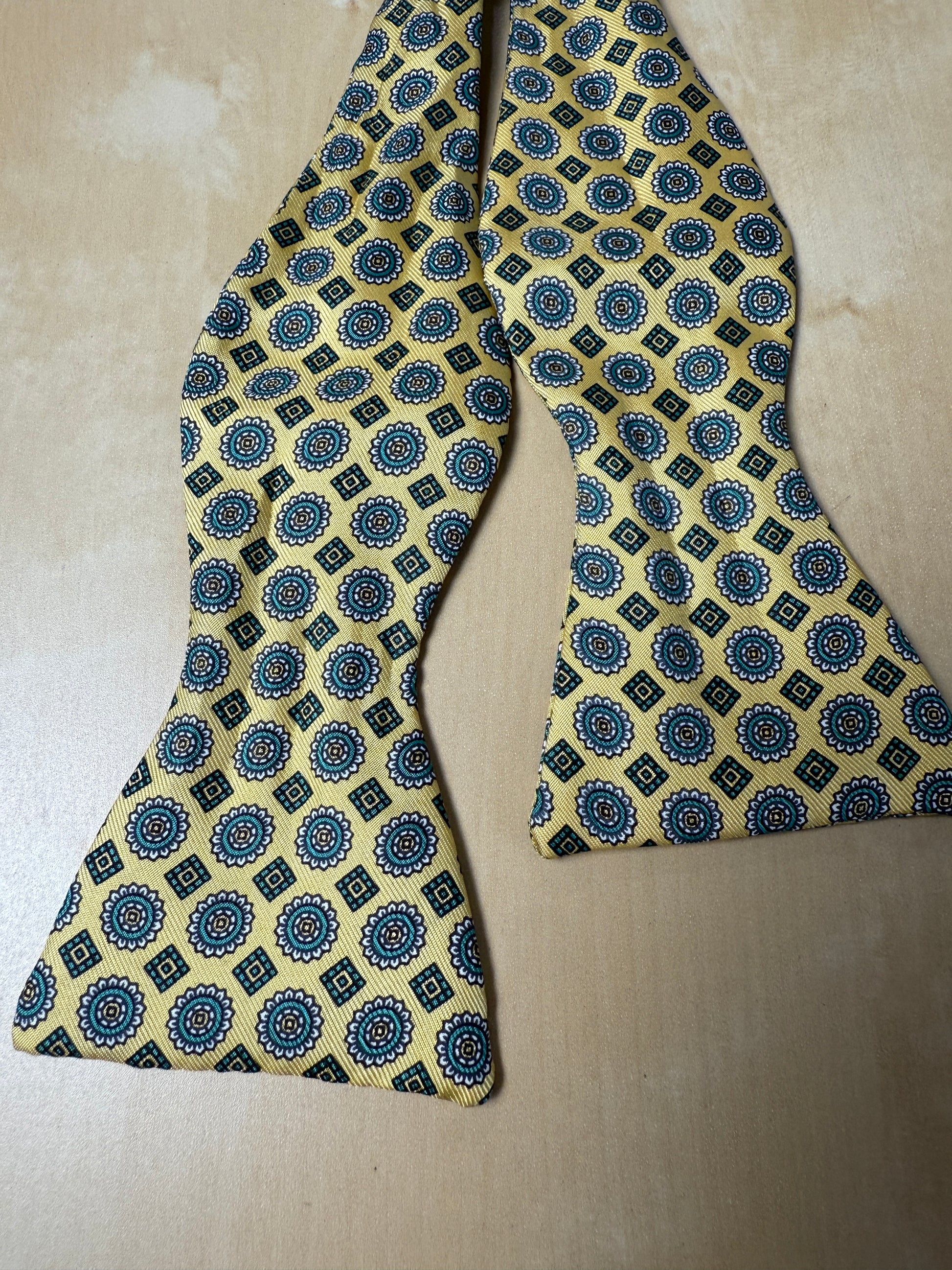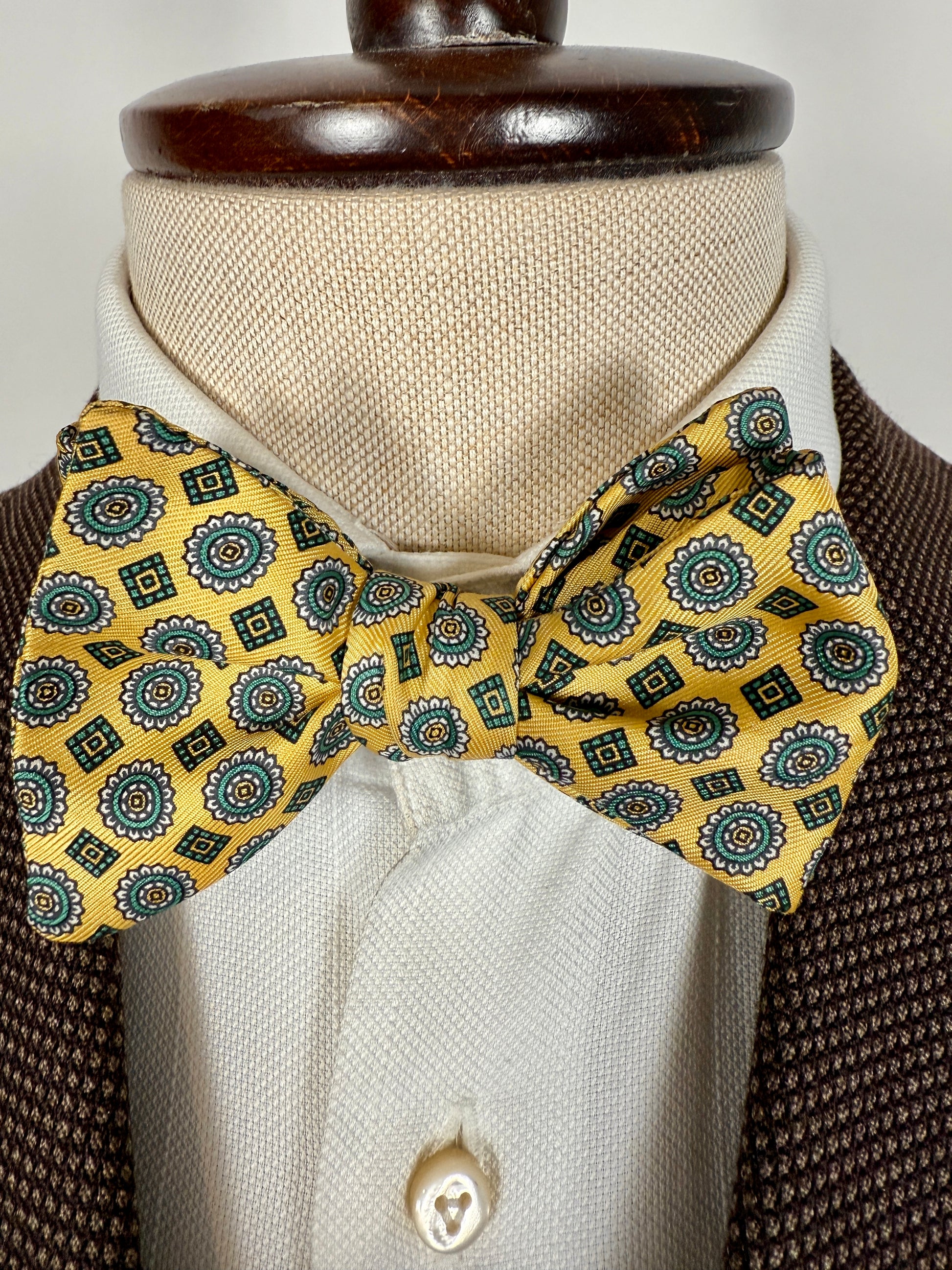 Cravatta a farfalla classica da annodare, in twill 100% seta colore giallo pastello con fantasia geometrica a rosette e rombi sui toni del blu e verde.