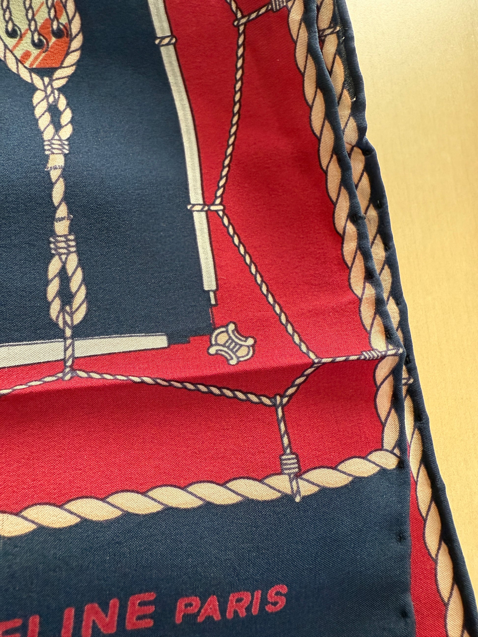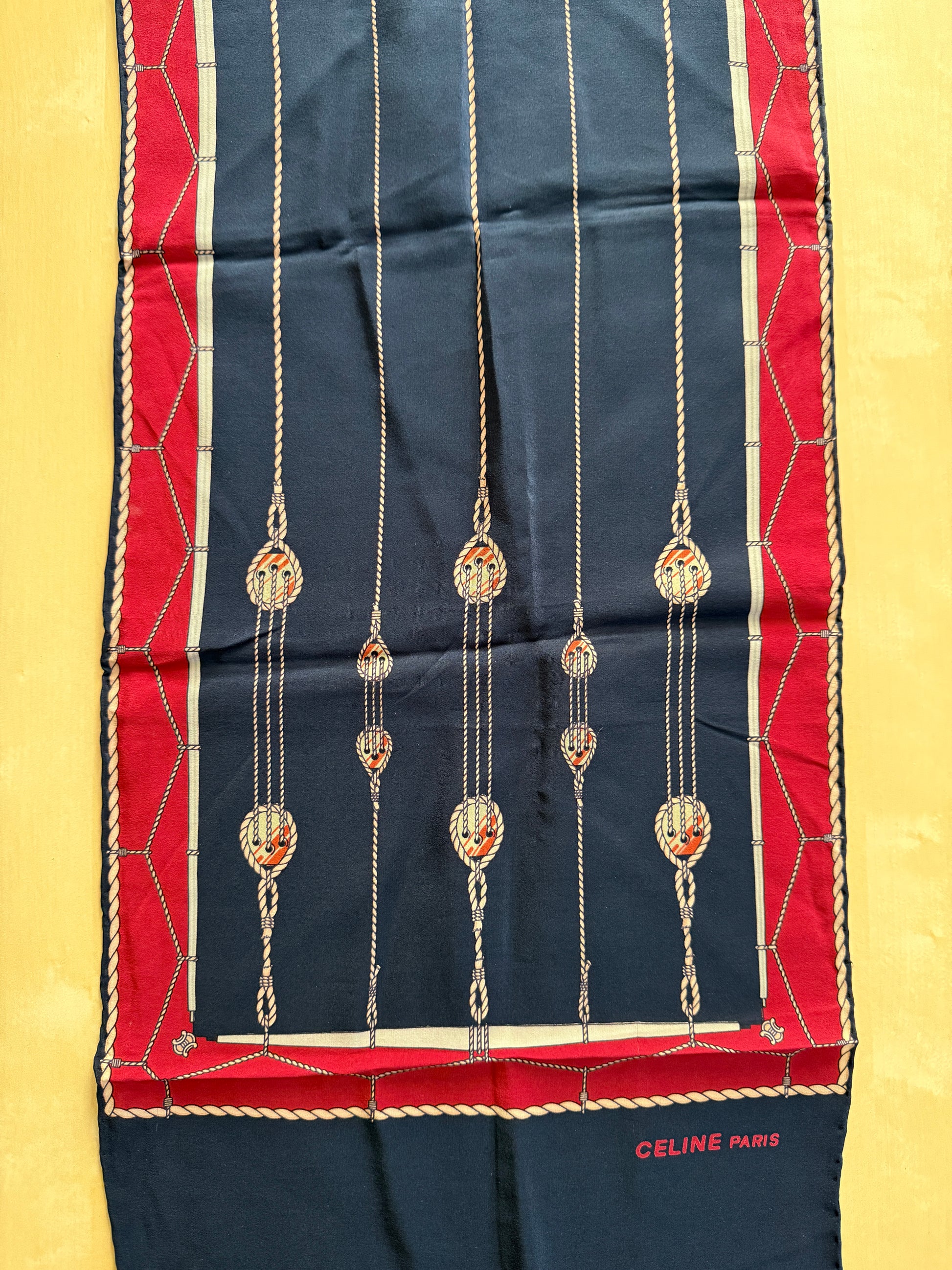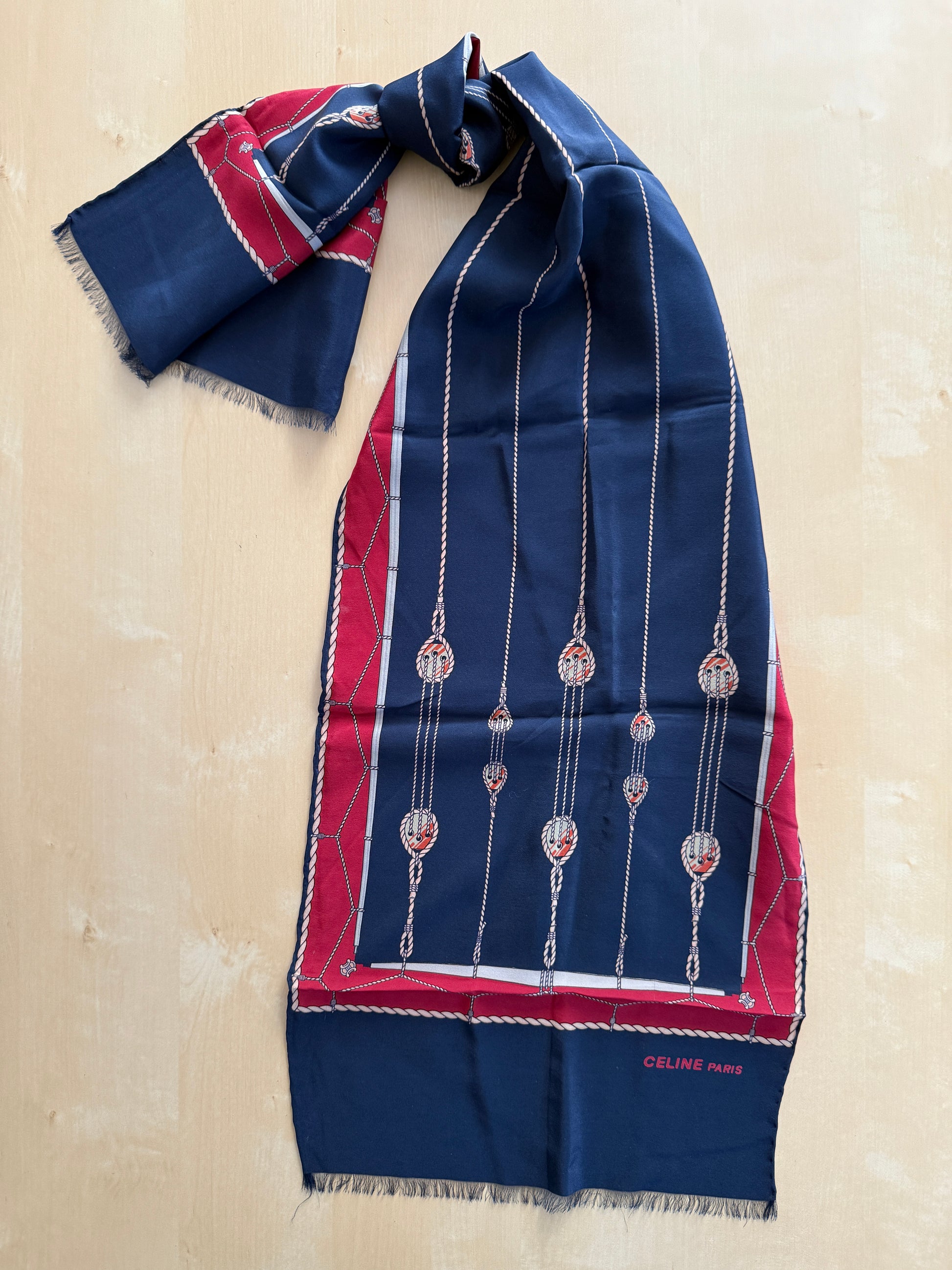 Sciarpa vintage Céline (anni ‘70 ca.) in pura seta crêpe, colori rosso e blu navy con stampa disegno a corde e occhielli tipico del marchio.