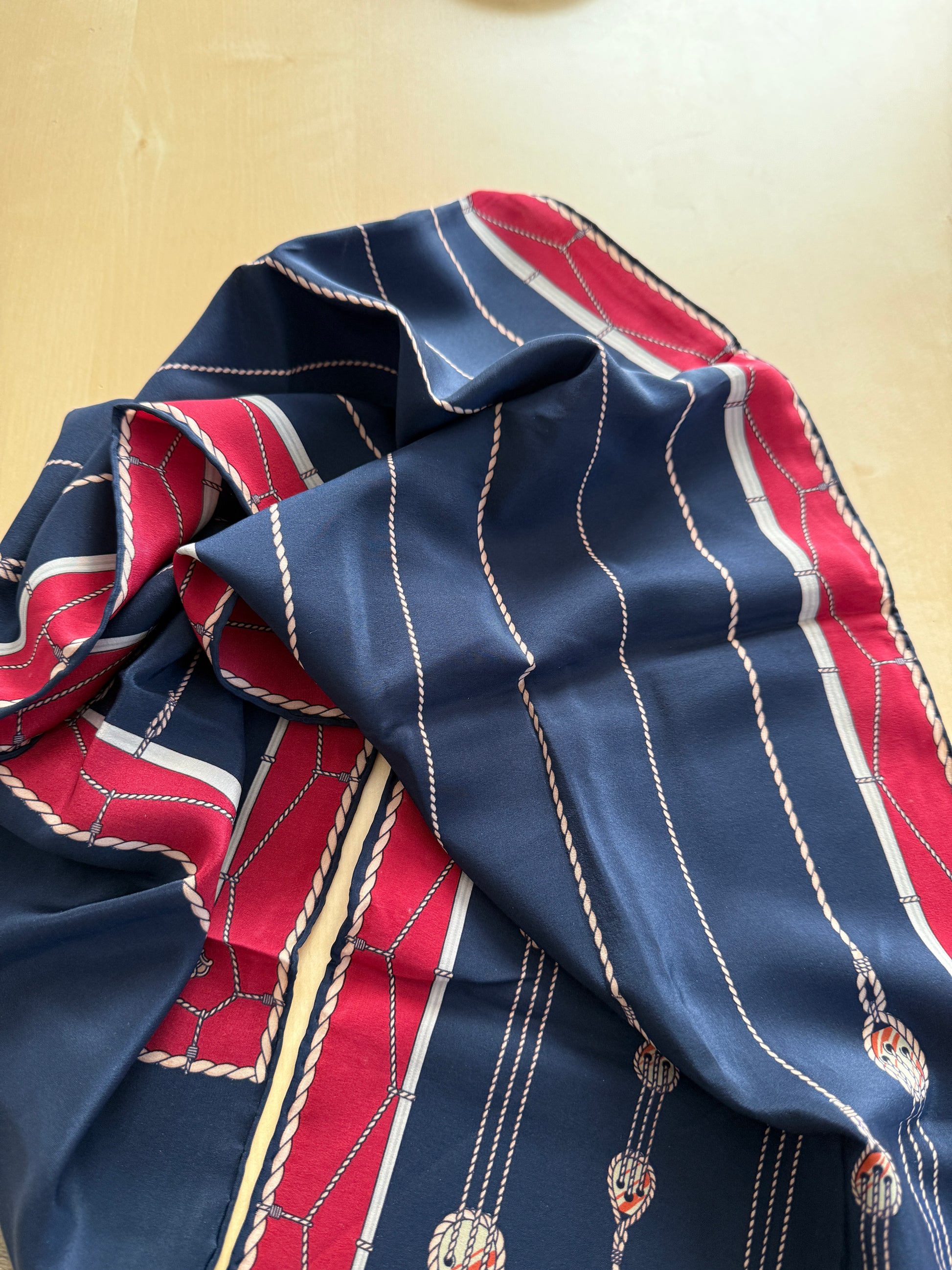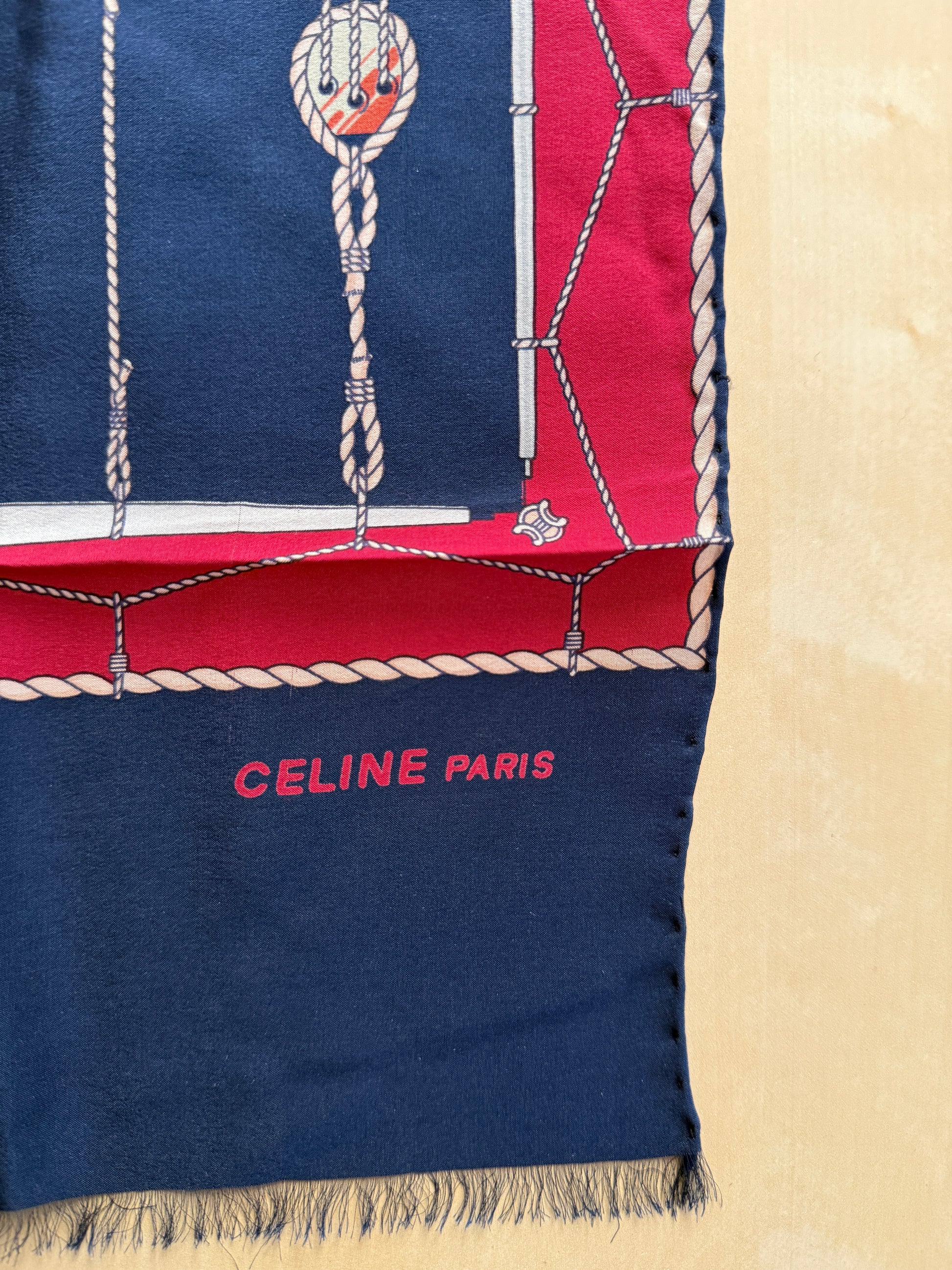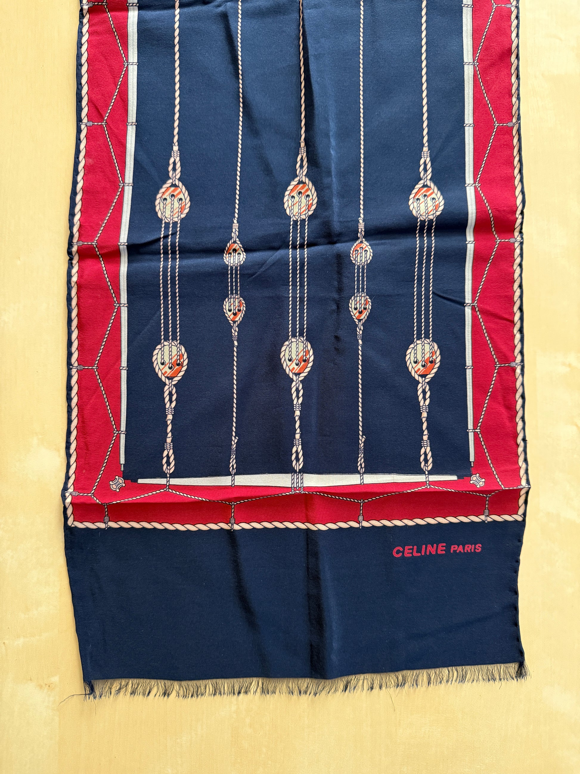 Sciarpa vintage Céline (anni ‘70 ca.) in pura seta crêpe, colori rosso e blu navy con stampa disegno a corde e occhielli tipico del marchio.