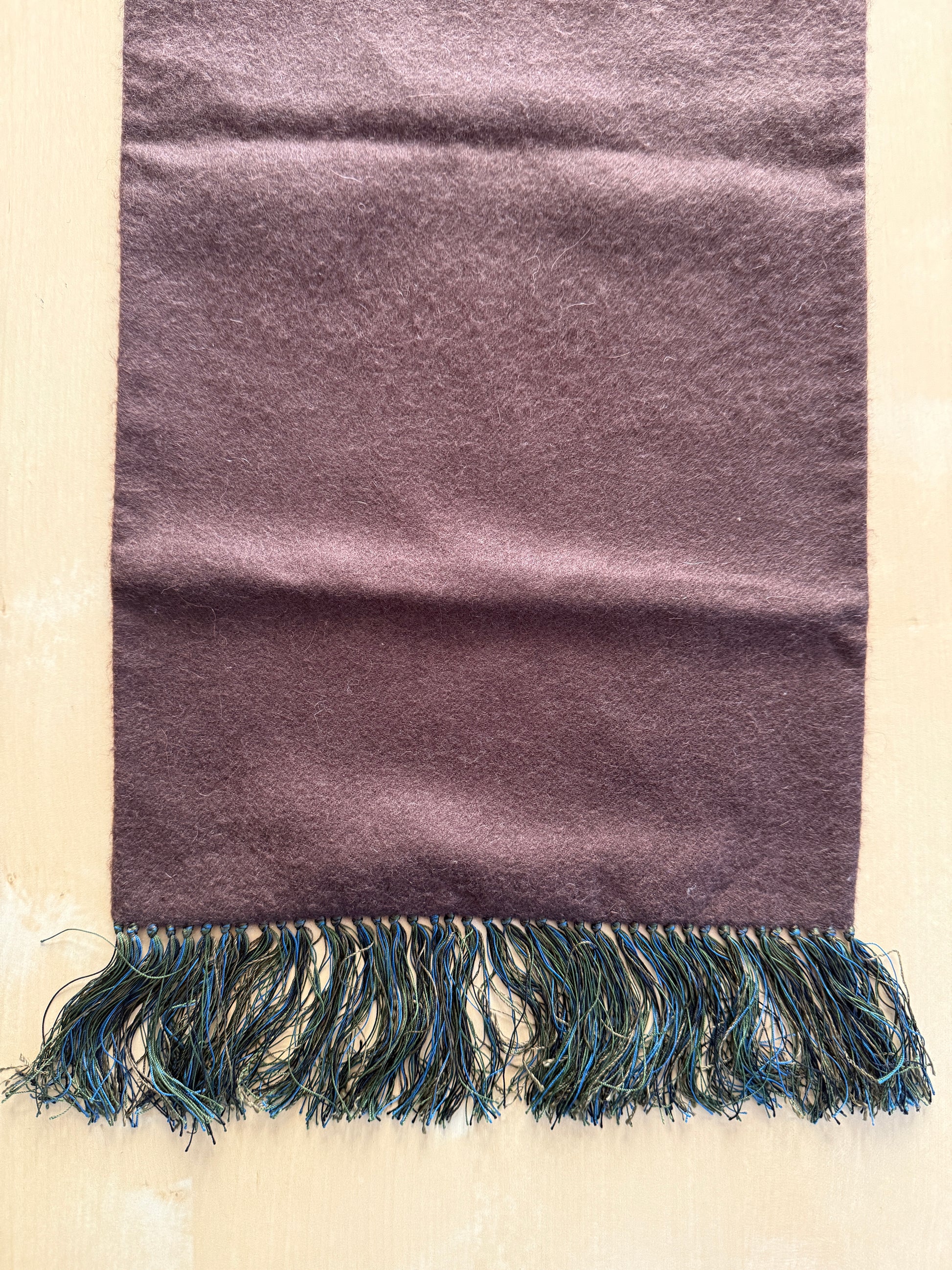 Da un lato un twill 100% seta con stampa paisley in verde e blu su fondo marrone. Dall’altro lato, una bella flanella scozzese in 70% cashmere e 30% lana, di buon peso e dalla mano molto sostenuta, colore marrone a tinta unita.