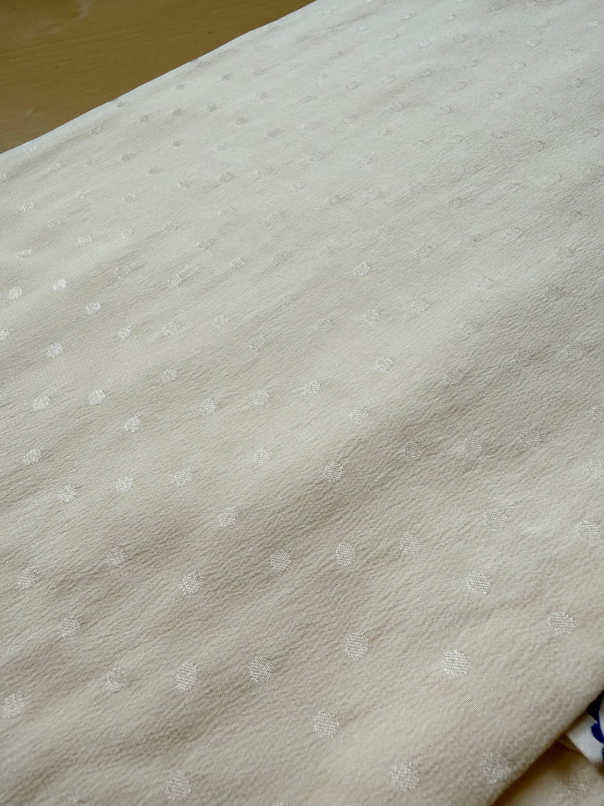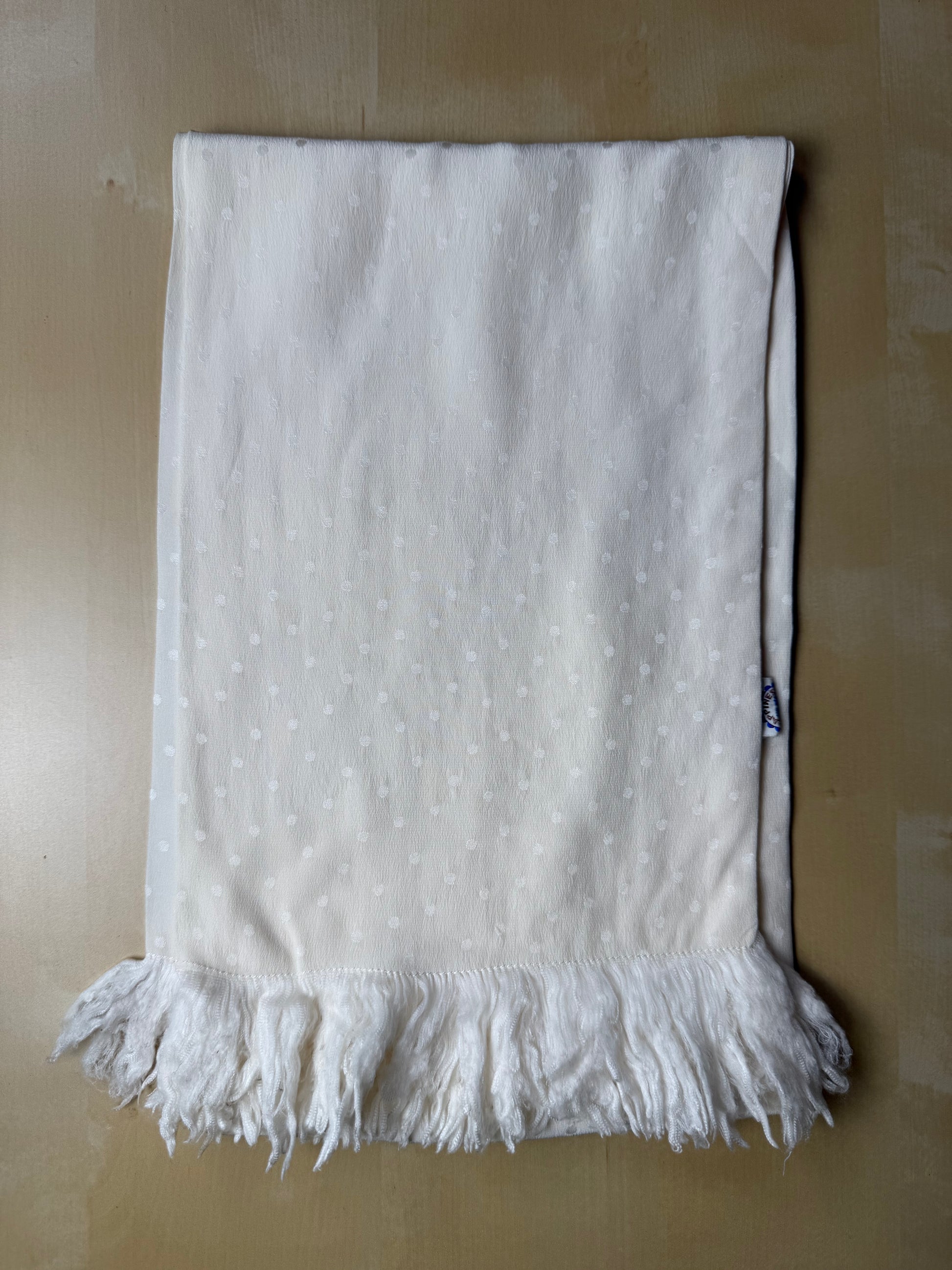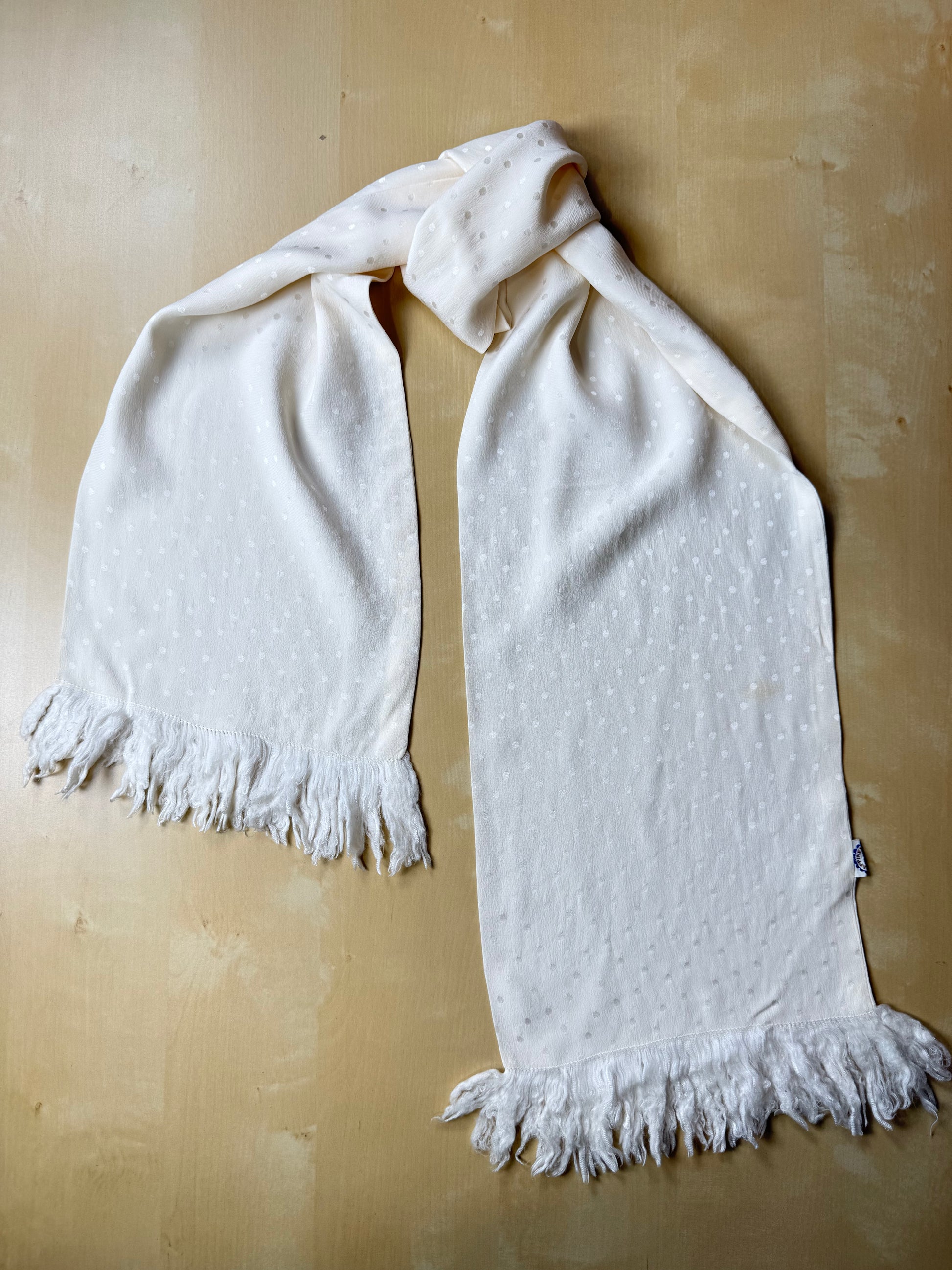 100% seta crêpe de Chine, con lavorazione a pois jacquard, e ampie frange in seta sulle estremità.