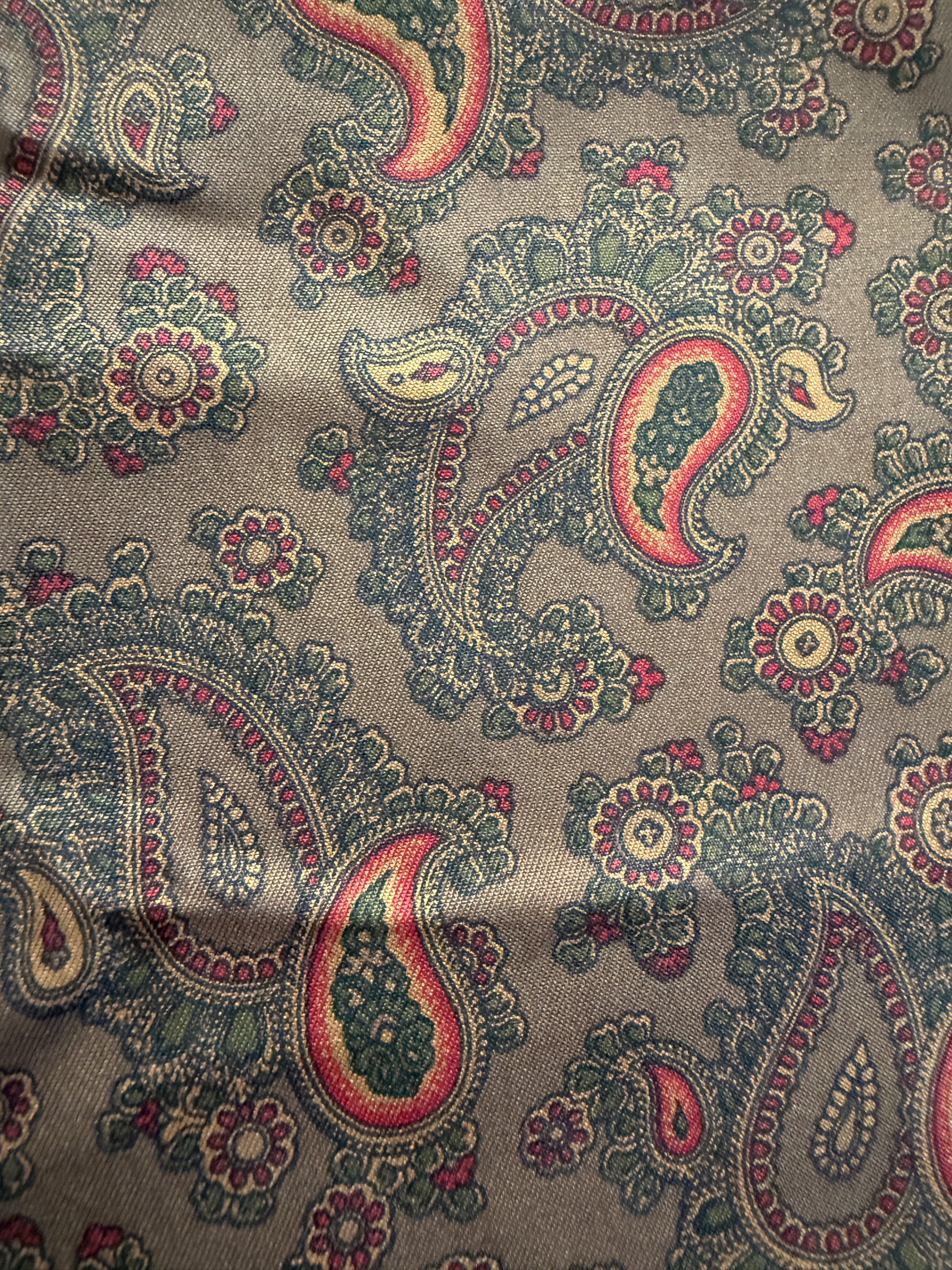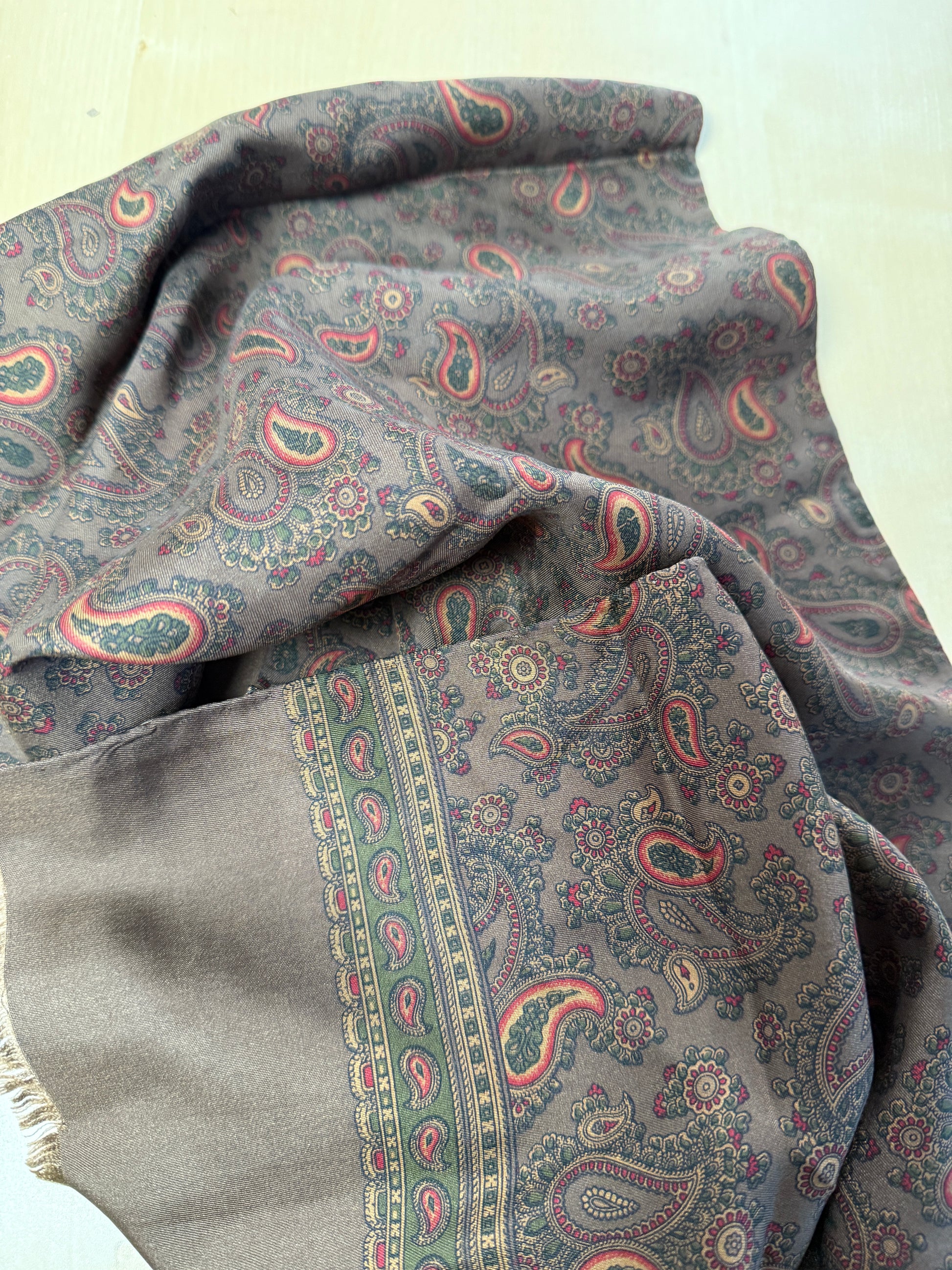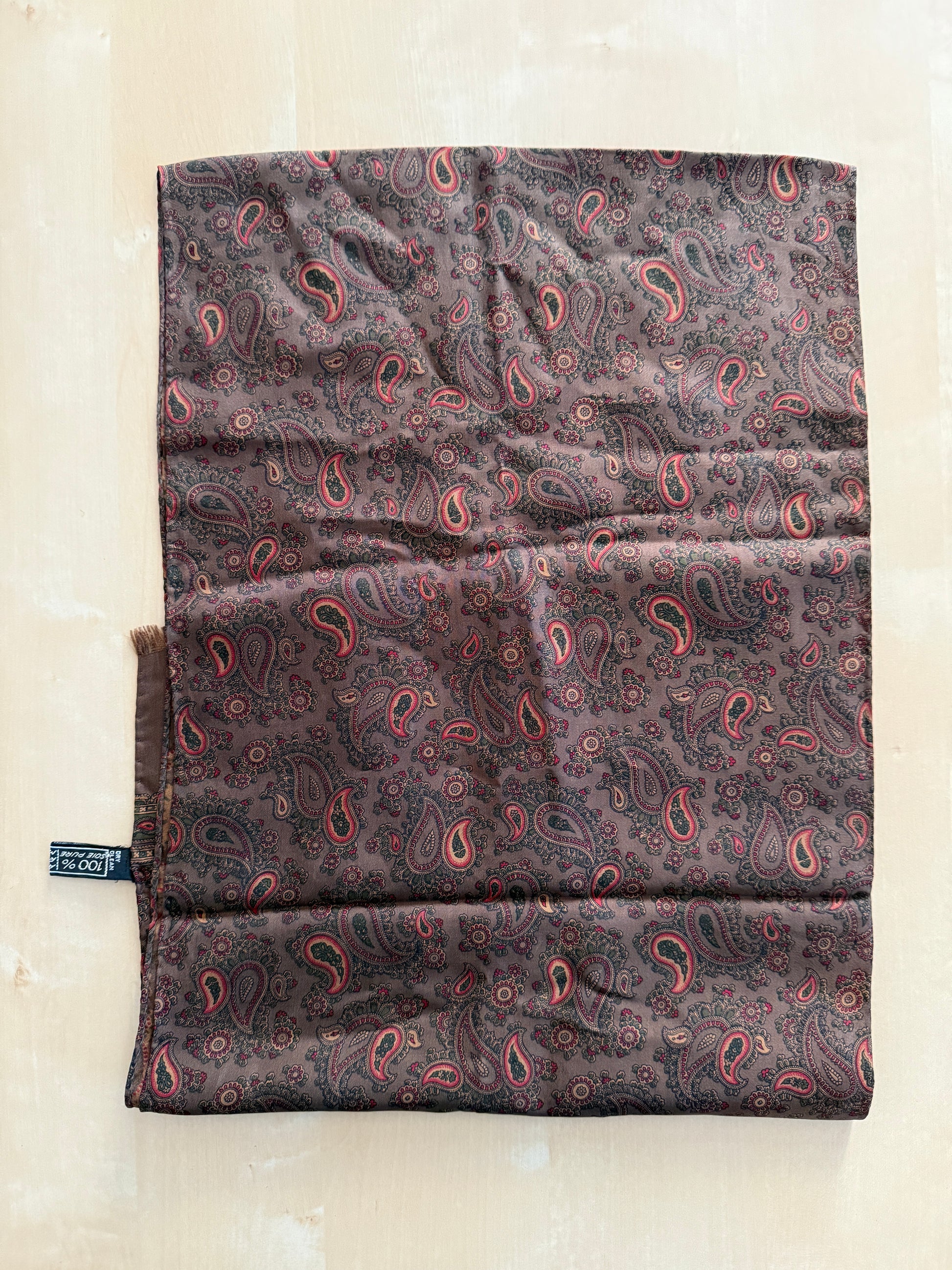 Stampa paisley cachi e bordeaux su fondo cachi/marrone, con firma ripetuta su una estremità e piccole frange agli orli.