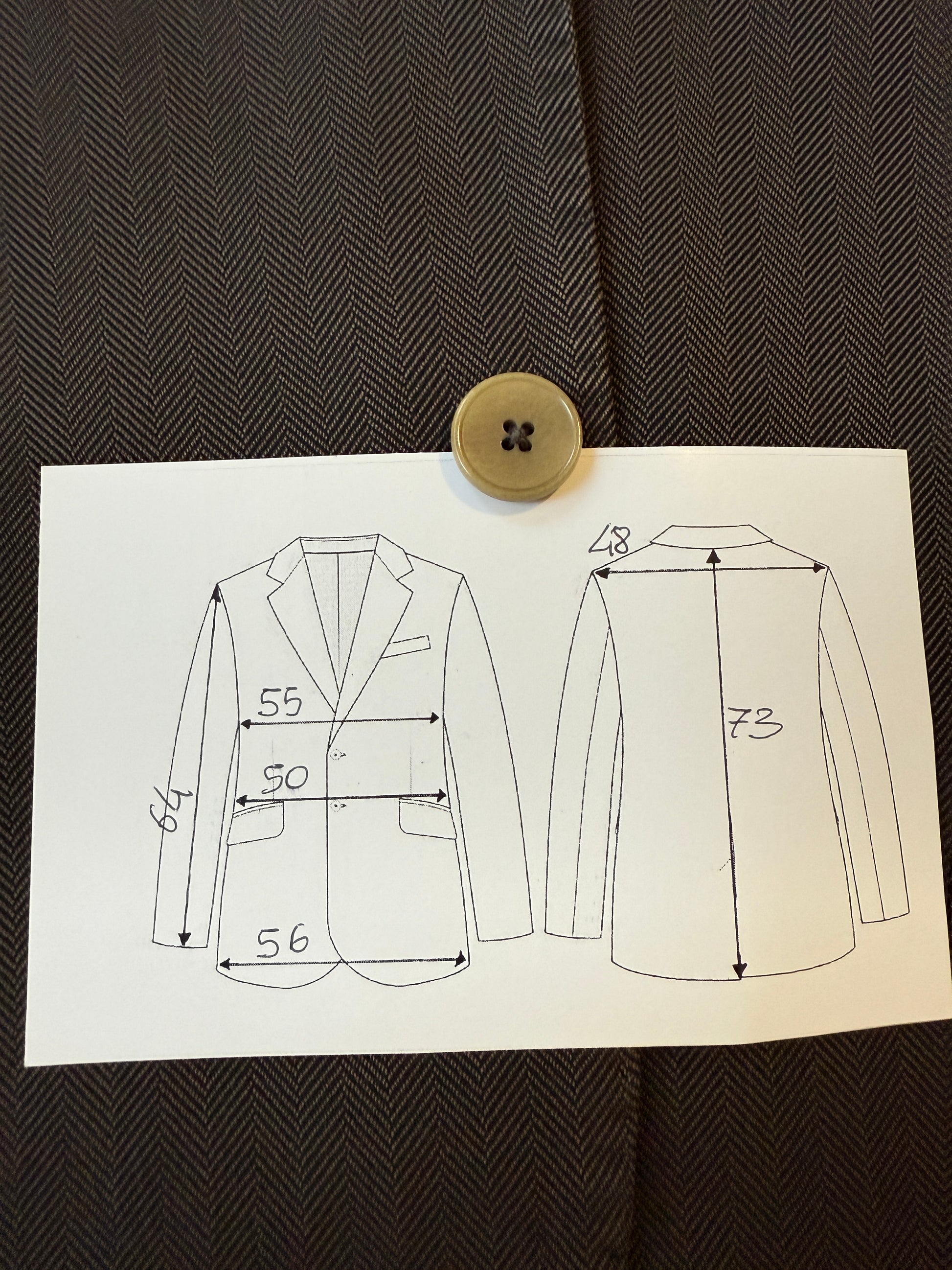 🔎Esempio pratico: la giacca usata come modello in questa guida (v. foto) ha una misura torace di 54 cm. Si tratta della giacca di un abito anni '90 dal taglio generale abbastanza morbido; inoltre, l'abito è un 3 pezzi e va quindi considerato un po' più di margine di vestibilità della giacca per poter indossare comodamente il gilet. Perciò, come da nostra prassi enunciata sopra consideriamo un margine di vestibilità di 6-7 cm: la taglia della giacca sarà quindi 54-6 o 7 = 47 o 48, che corrisponde a una tg. 46/48.