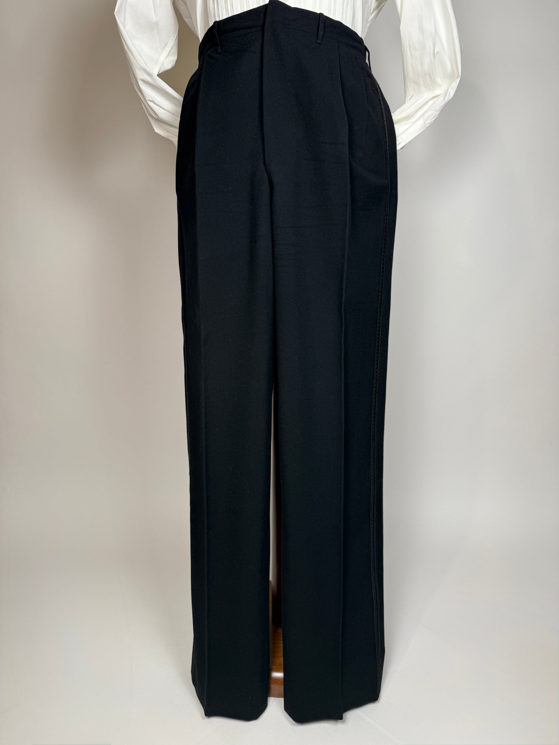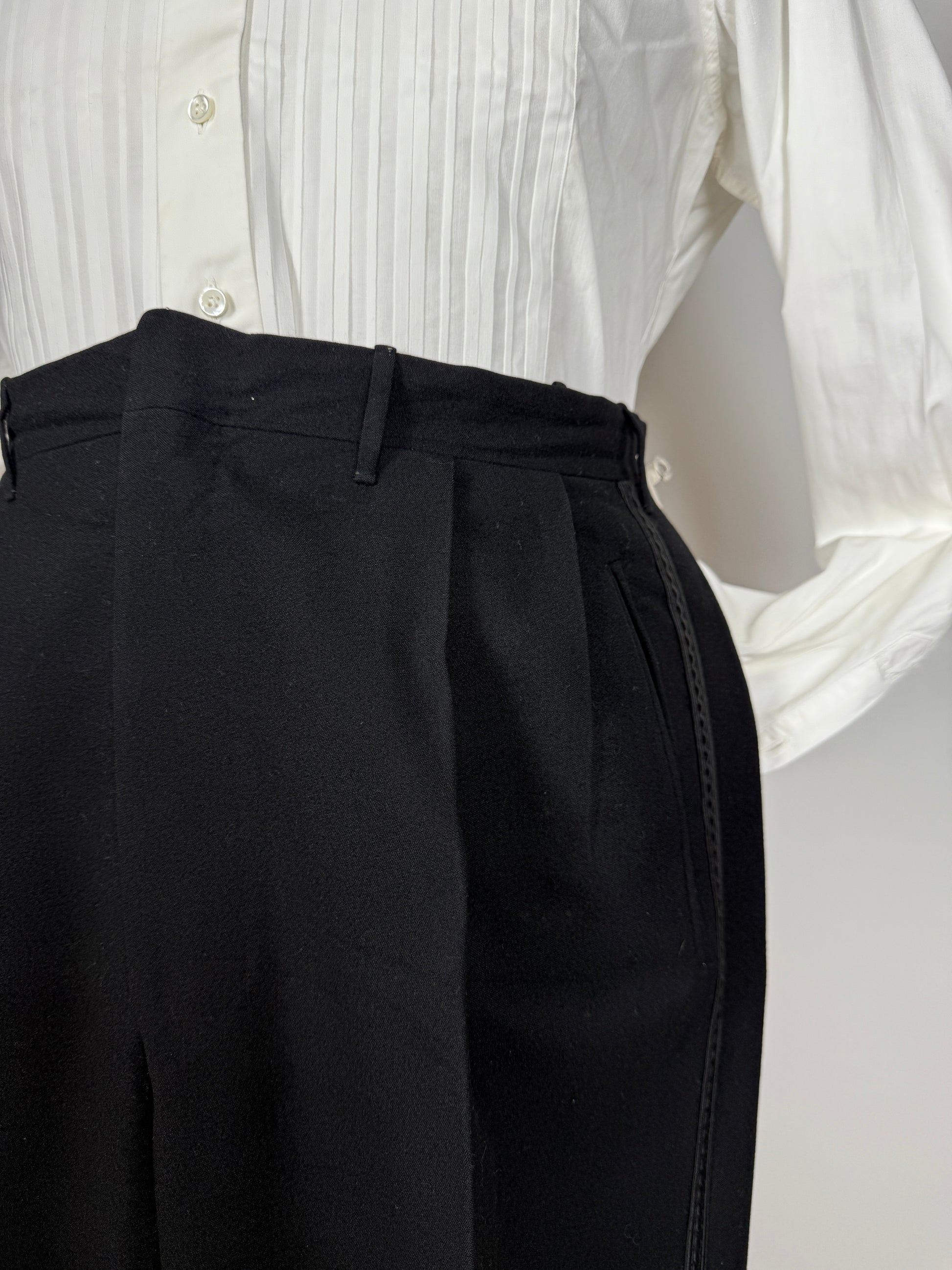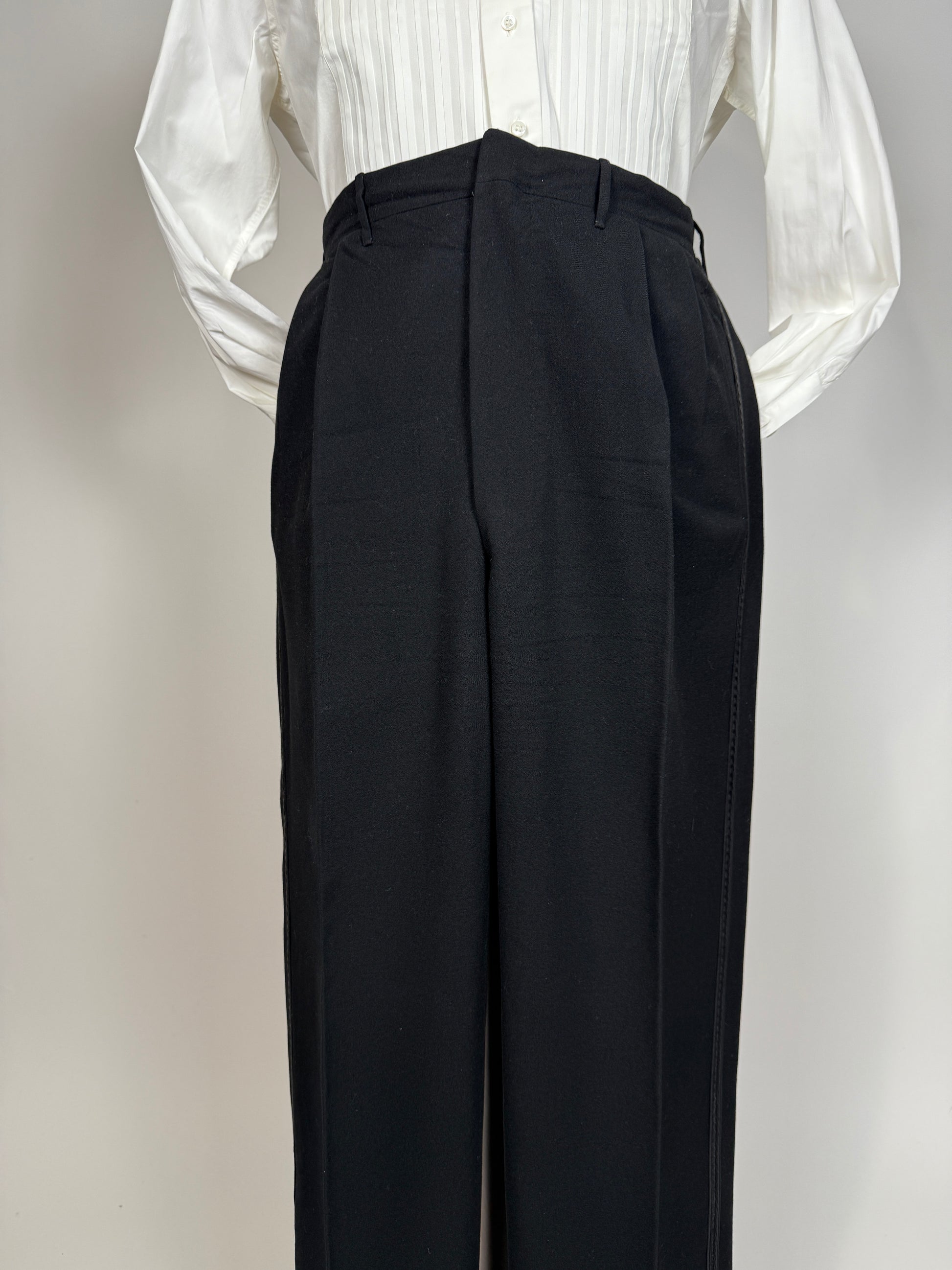 I pantaloni sono a vita molto alta, con doppie pinces, gallone singolo decorato e chiusura integrale a bottoni.