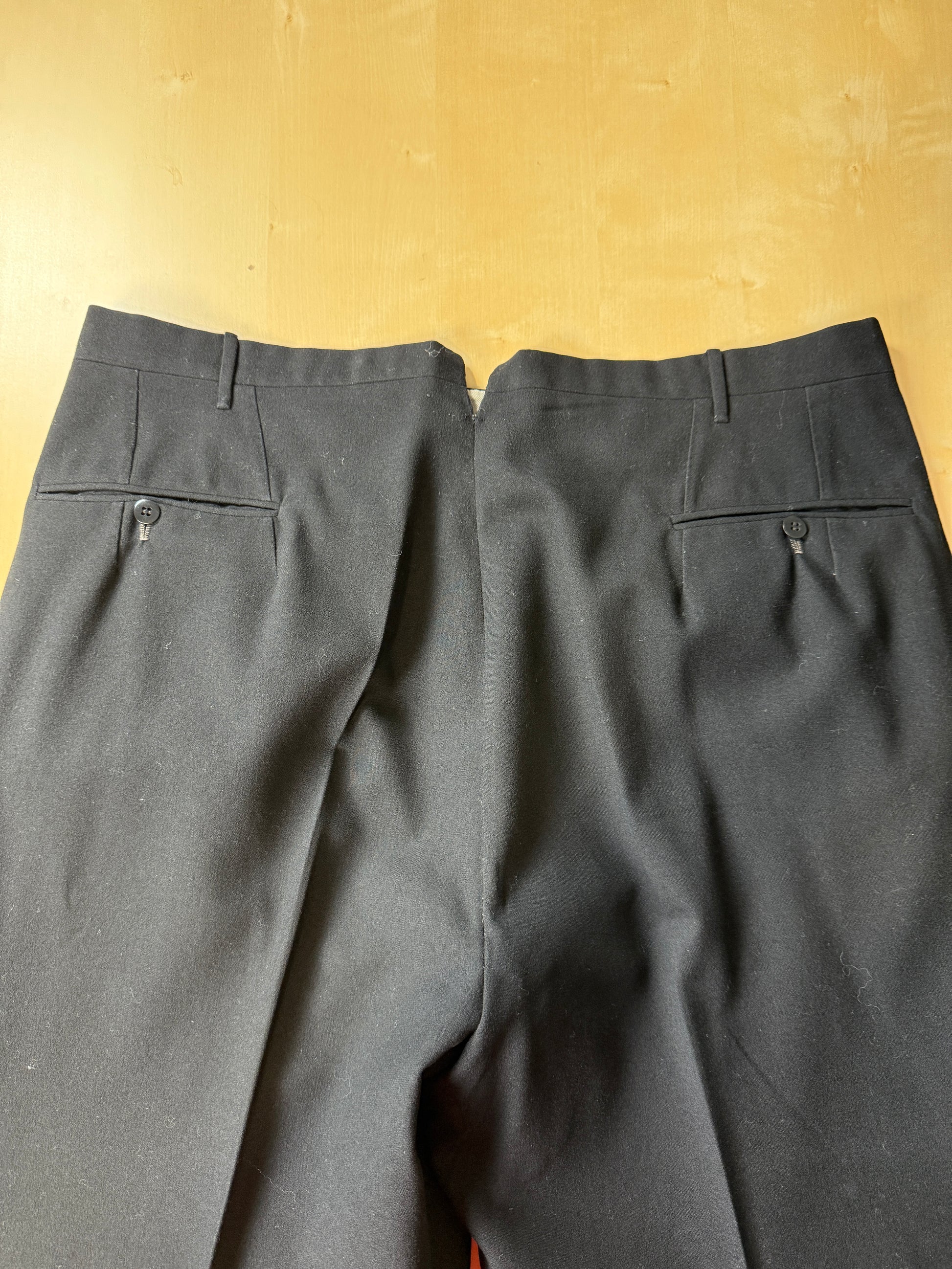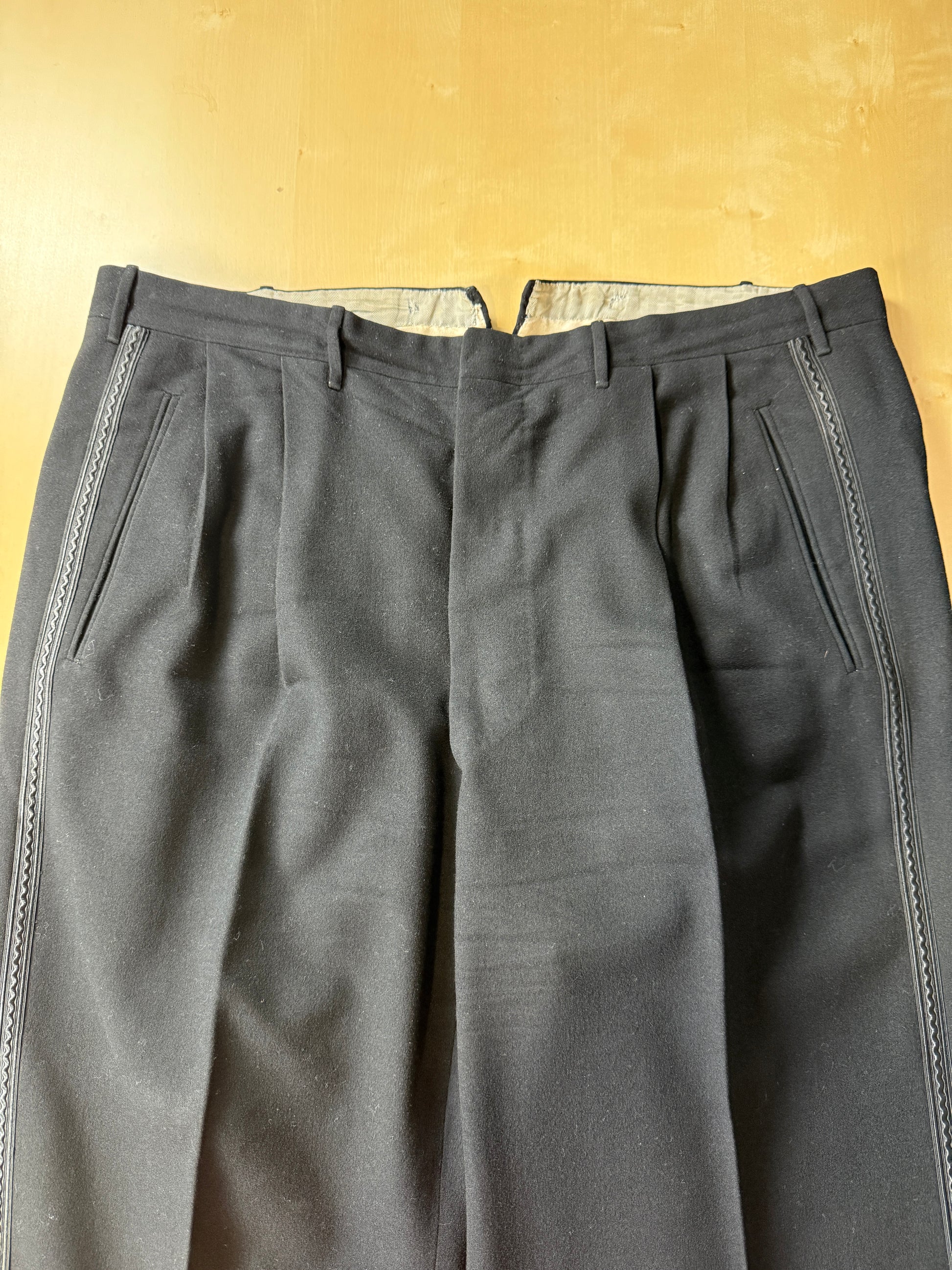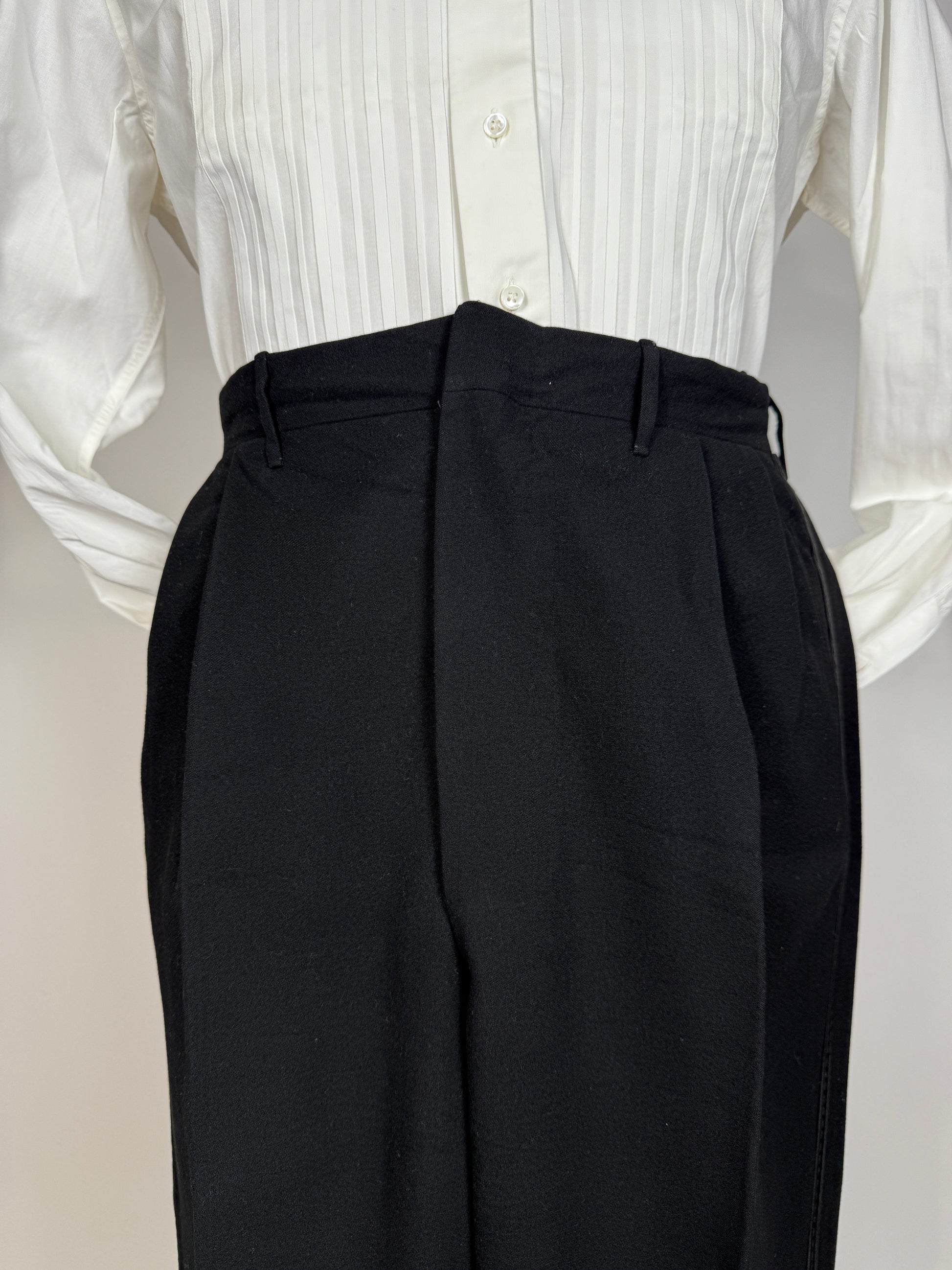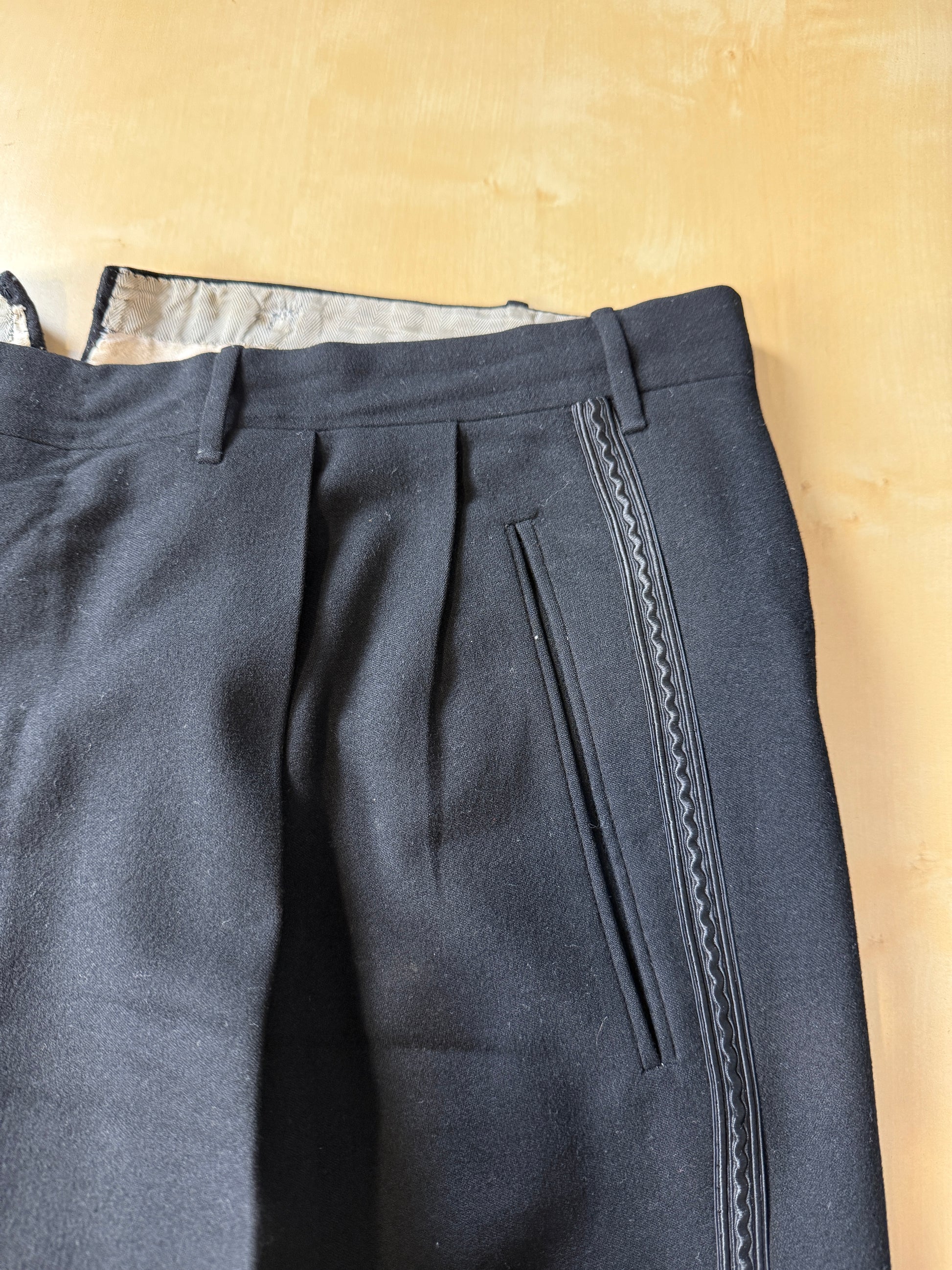 I pantaloni sono a vita molto alta, con doppie pinces, gallone singolo decorato e chiusura integrale a bottoni.
