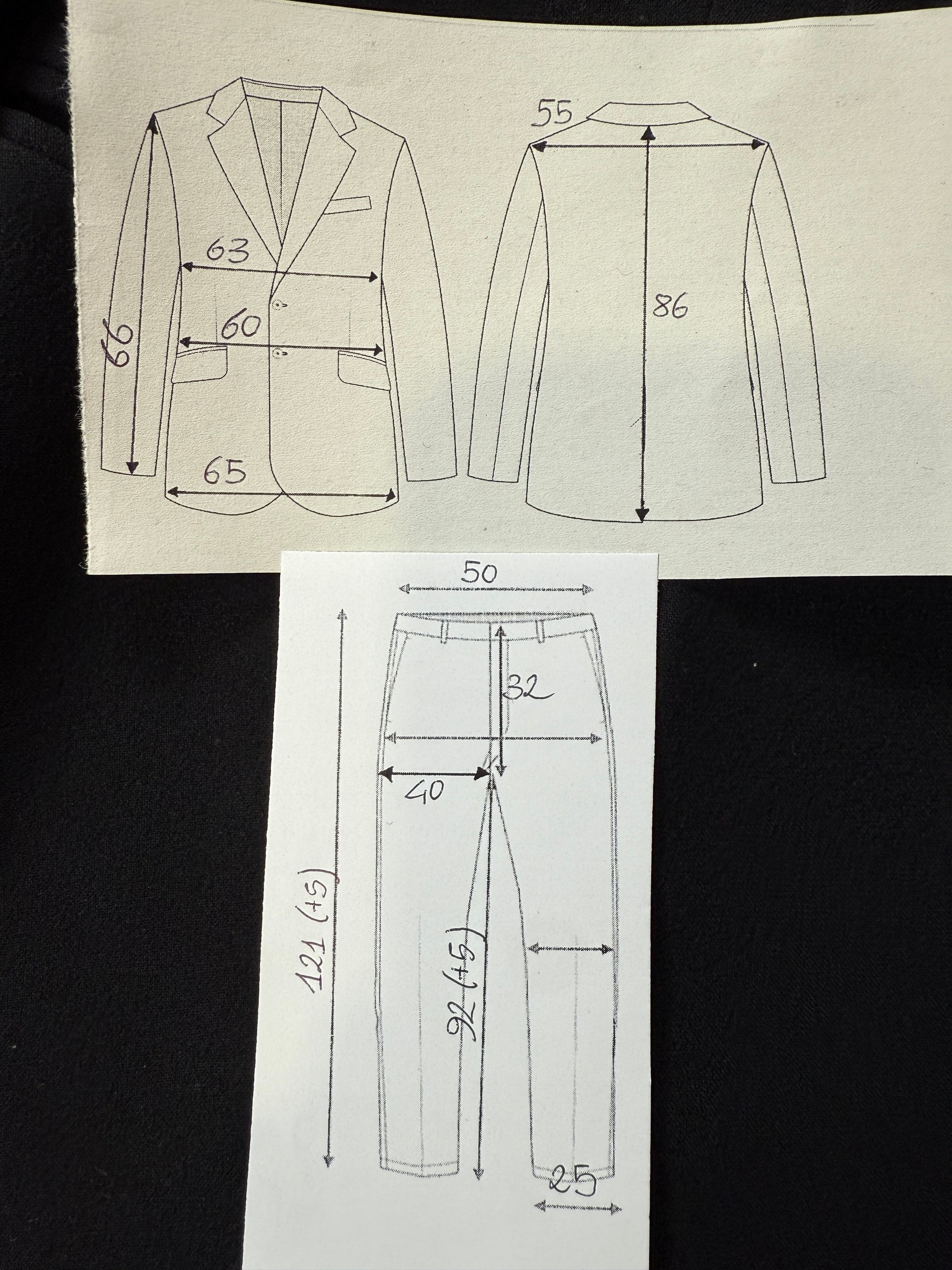 Le misure riflettono una taglia 56/58 per quanto riguarda la giacca e 56 per i pantaloni, con conformazione molto lunga (abito adatto perciò a stature alte): vedere lo schema completo con le misure in cm nell'ultima foto.