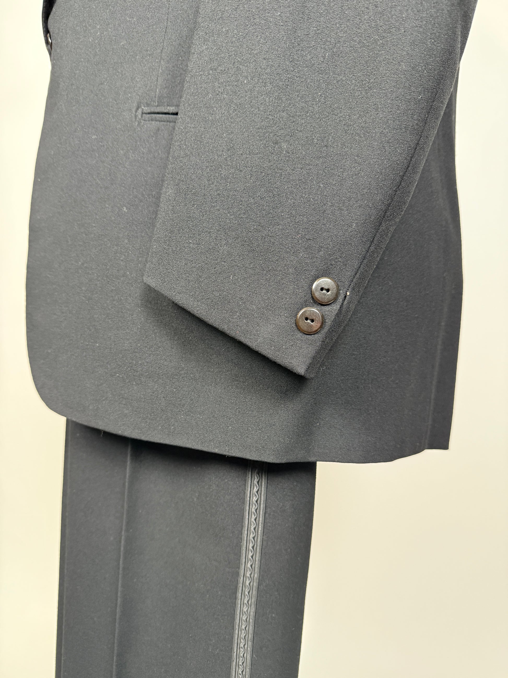 Giacca tutta intelata con la struttura sostenuta tipica della sartoria dell'epoca, tessuto in barathea di lana colore nero, taglio monopetto con revers a scialle in raso.