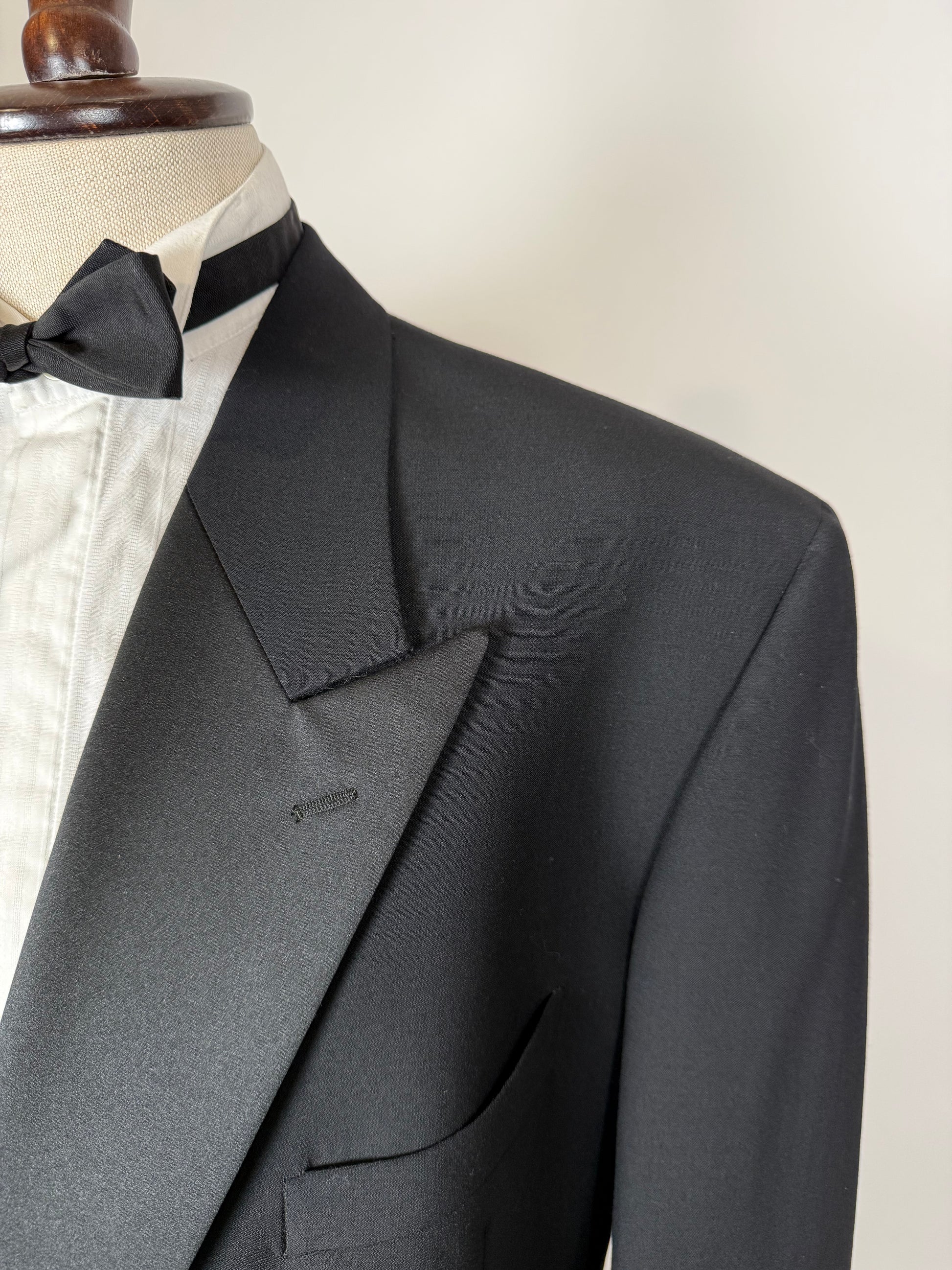 Smoking doppiopetto Emporio Armani, un bel vintage anni '80/primi '90 di confezione Gft in condizioni di nuovo: mai indossato e con ancora parte del cartellino.