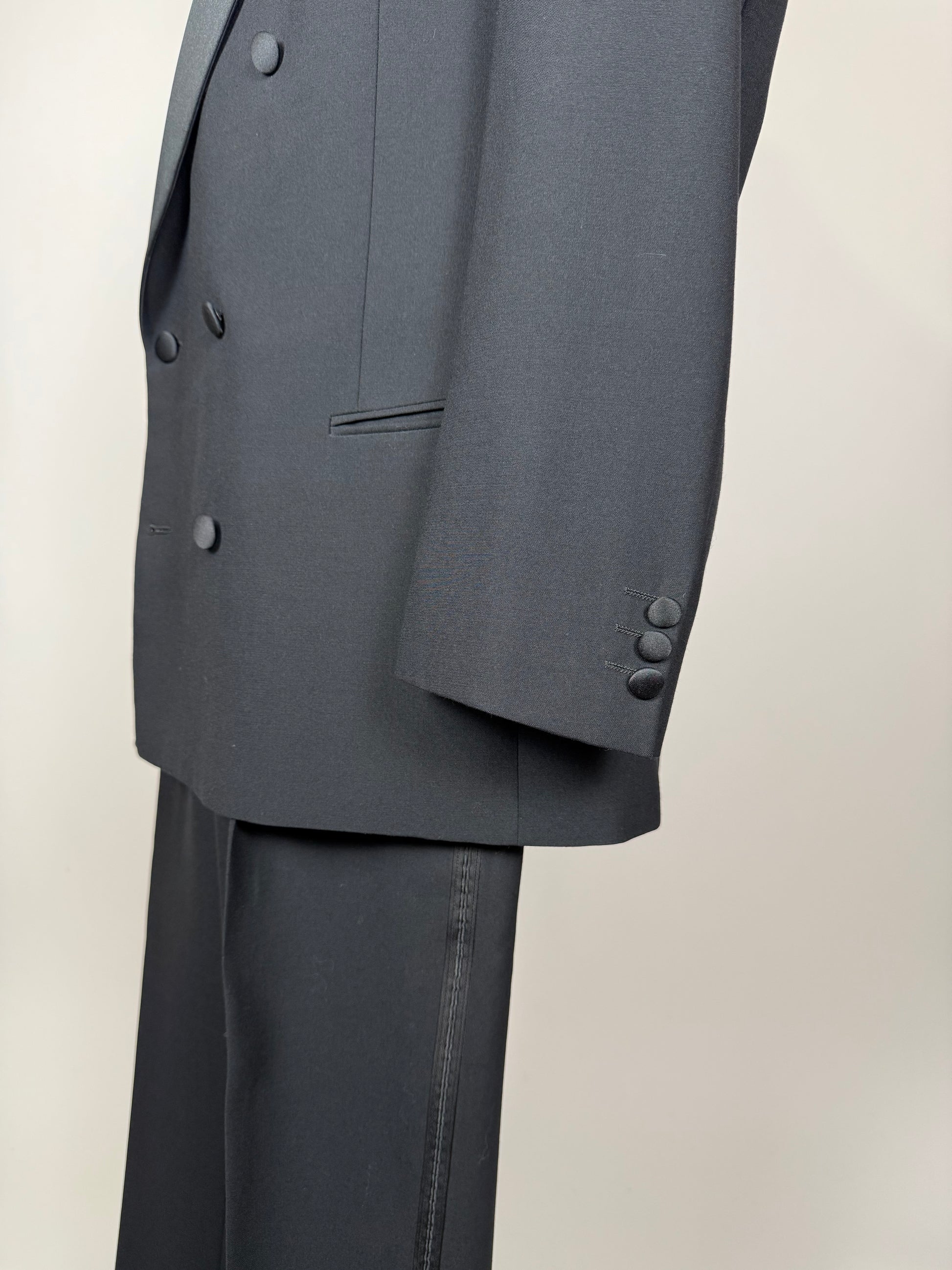 La giacca è un bel doppiopetto 6x2, con revers a lancia in raso, bottoni anch'essi foderati in raso, e taglio tipico anni '80 con spalle strutturate. Ovviamente senza spacchi e con tasche a filetto.