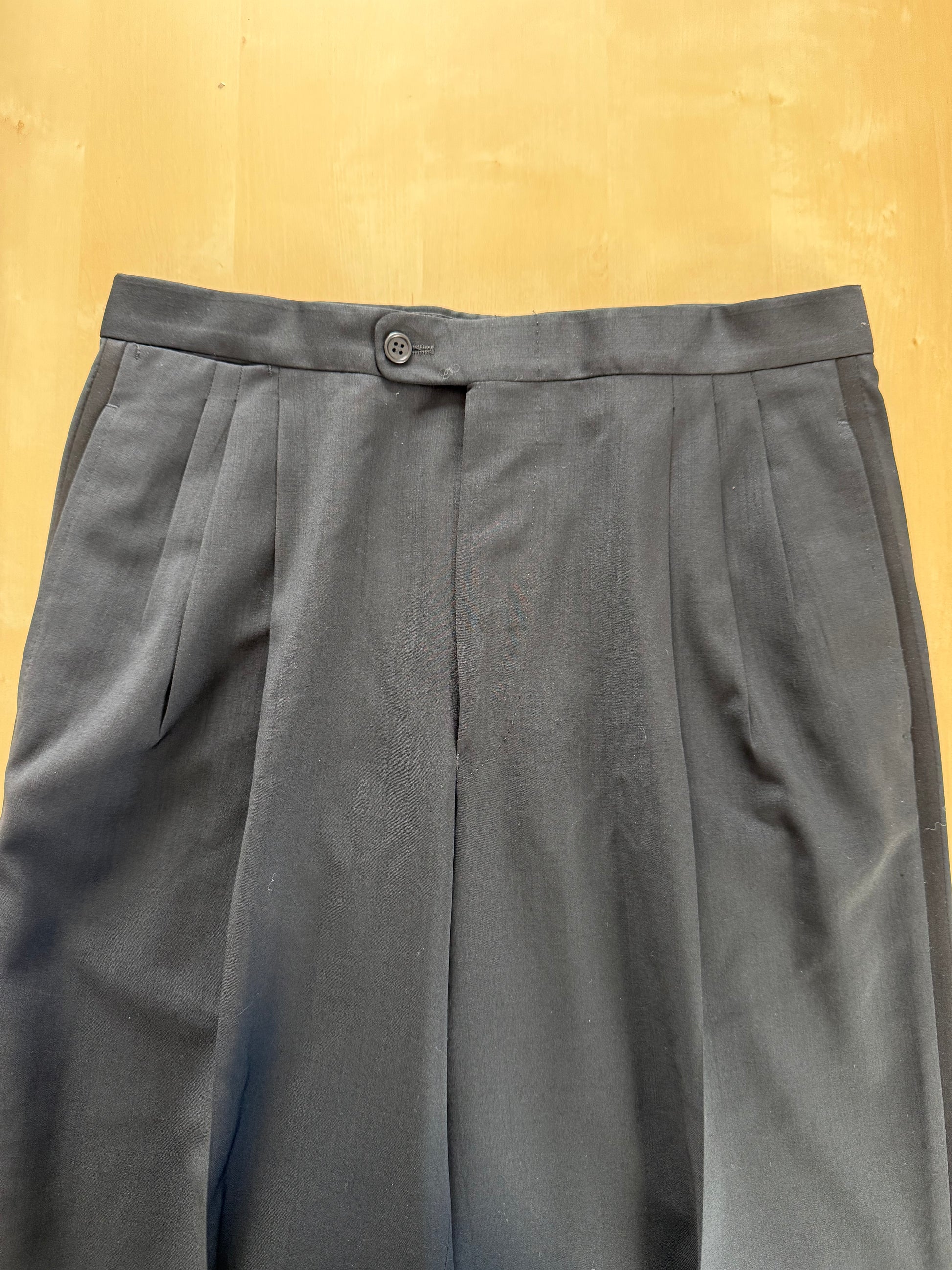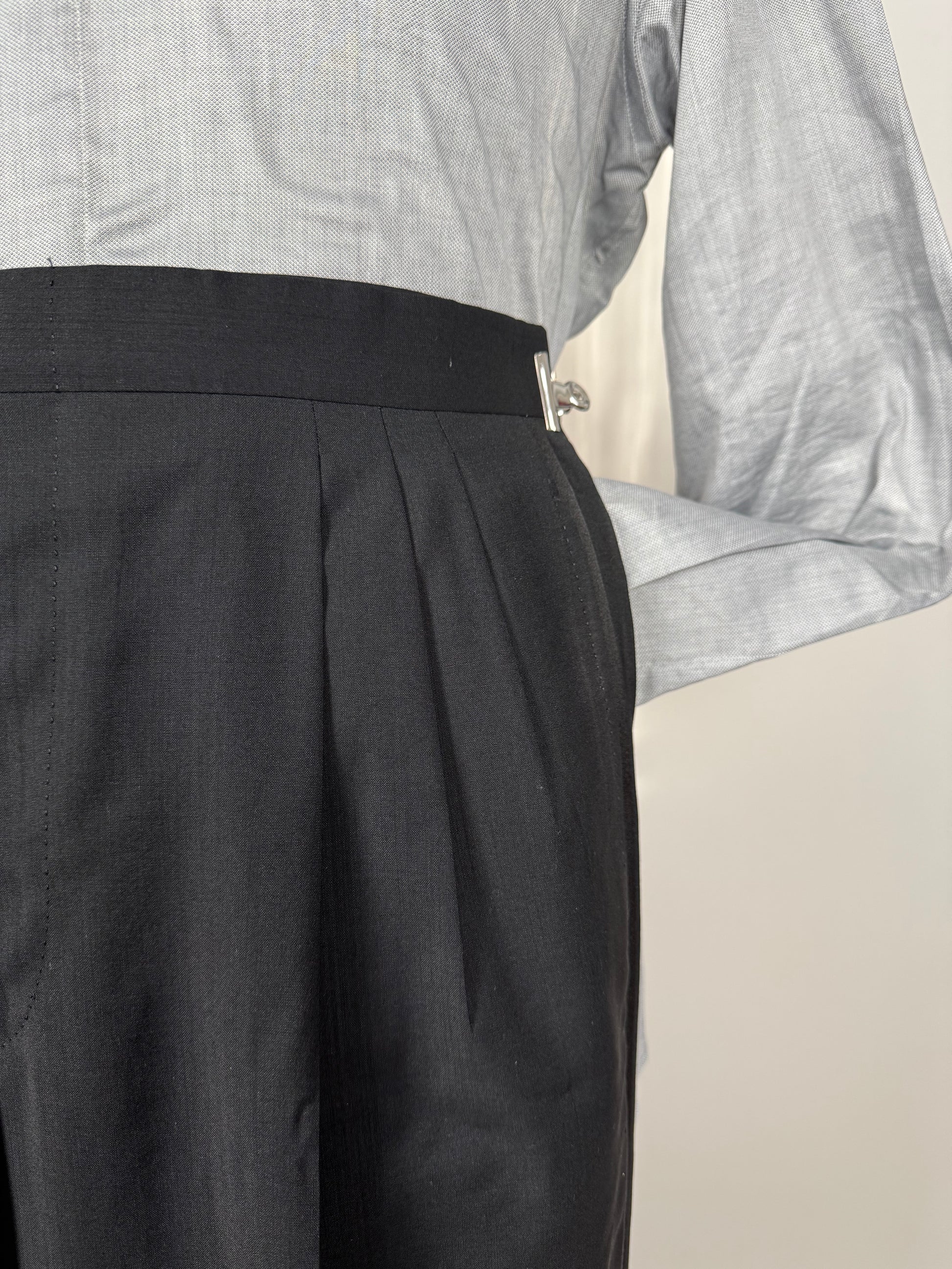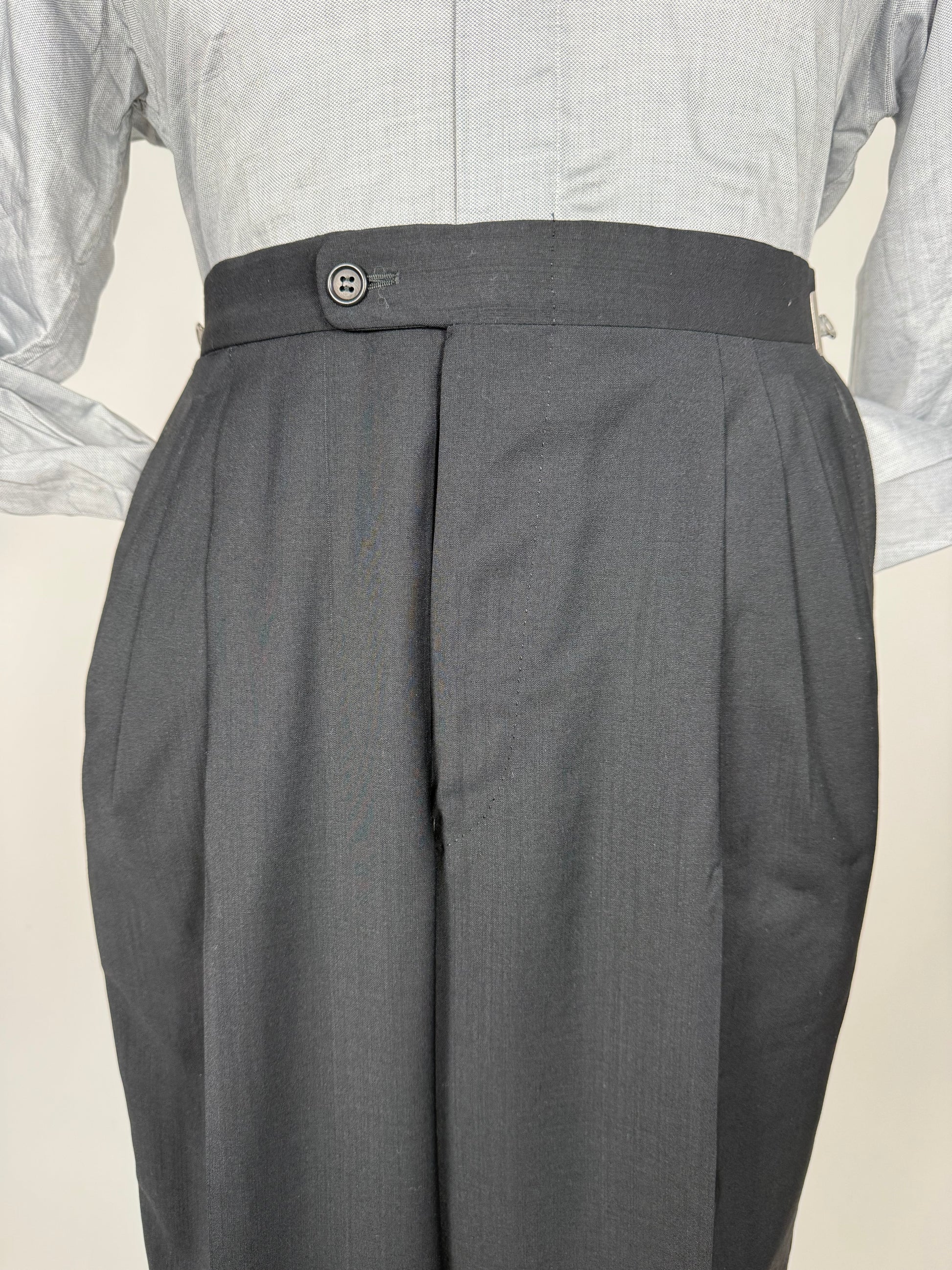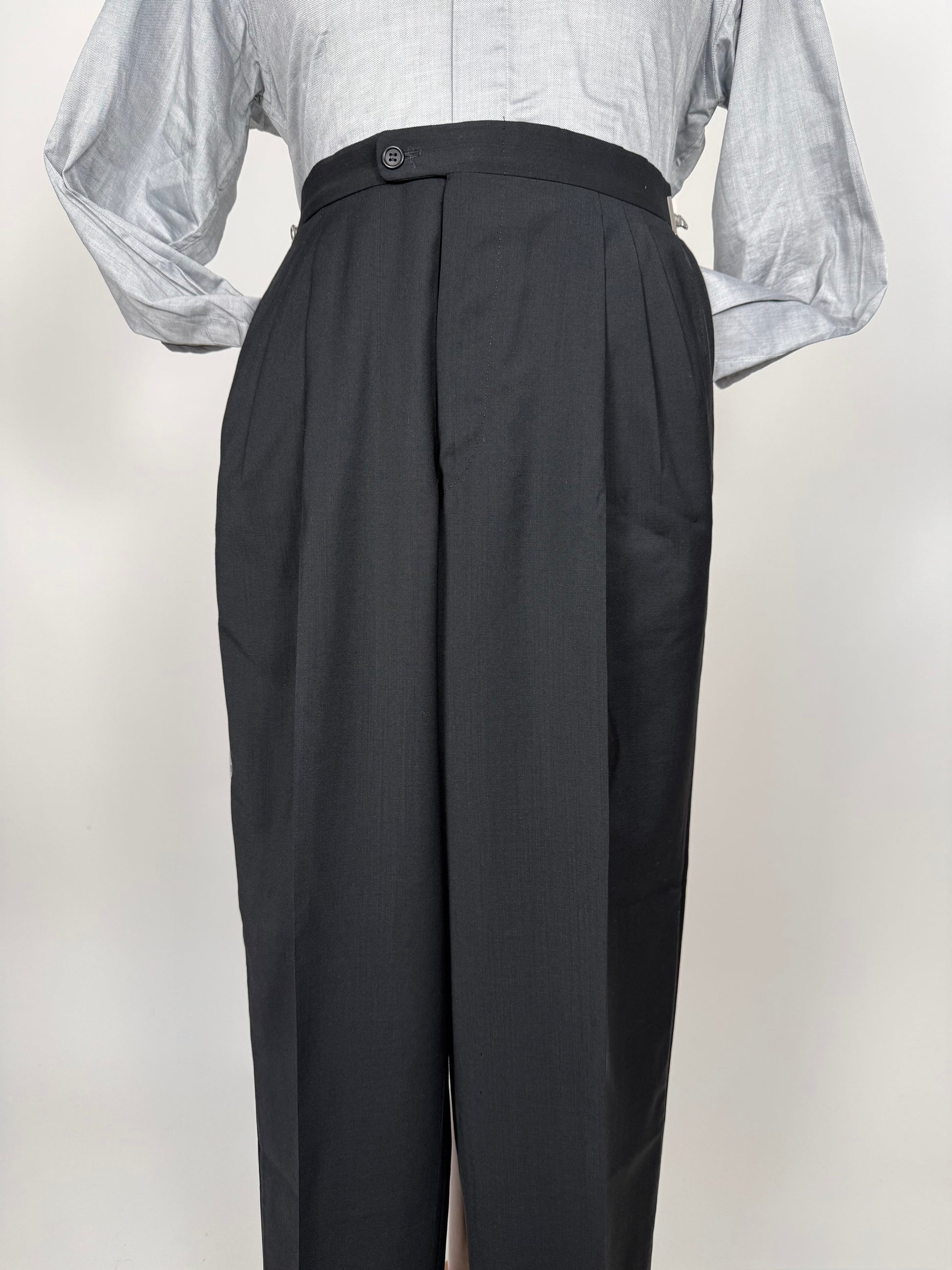 Pantaloni a vita molto alta, con bellissima configurazione a triple pinces, gallone laterale singolo in raso, ampio fondo da 23 cm.