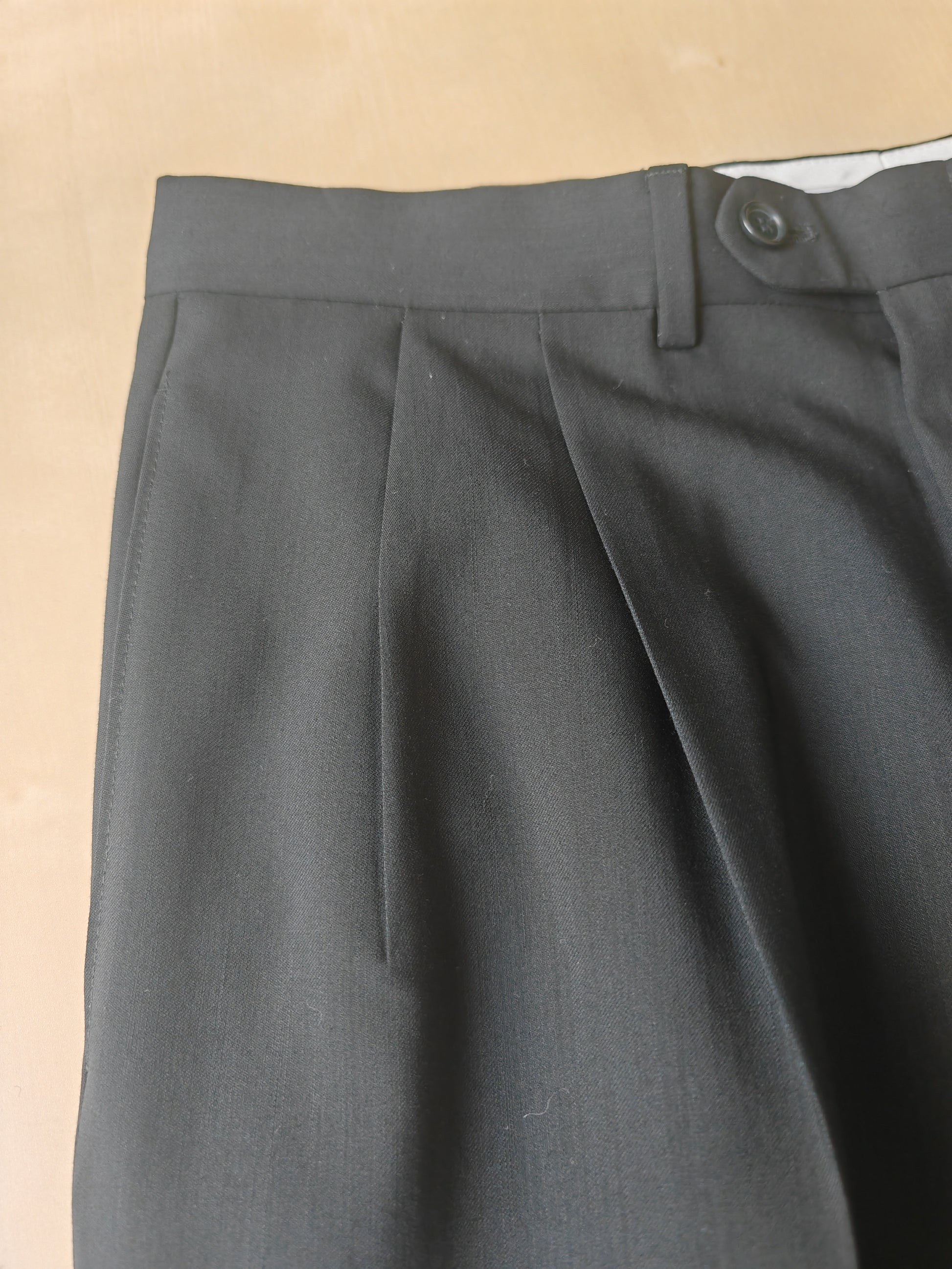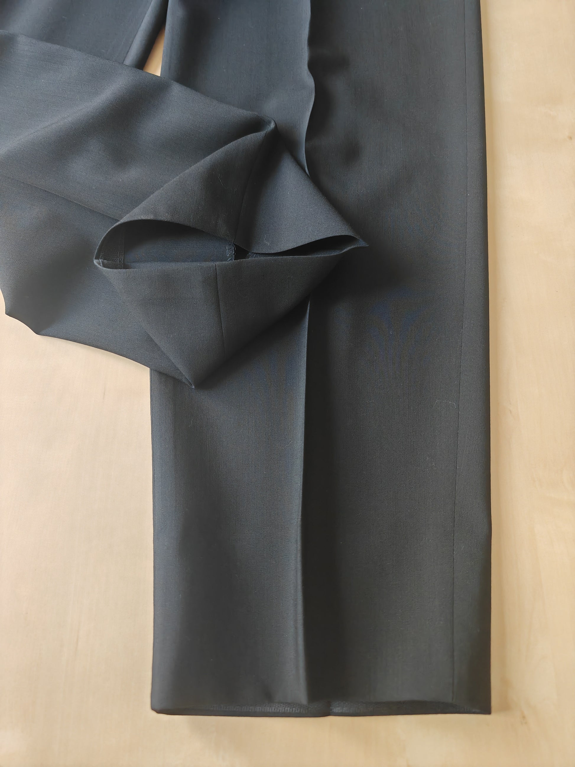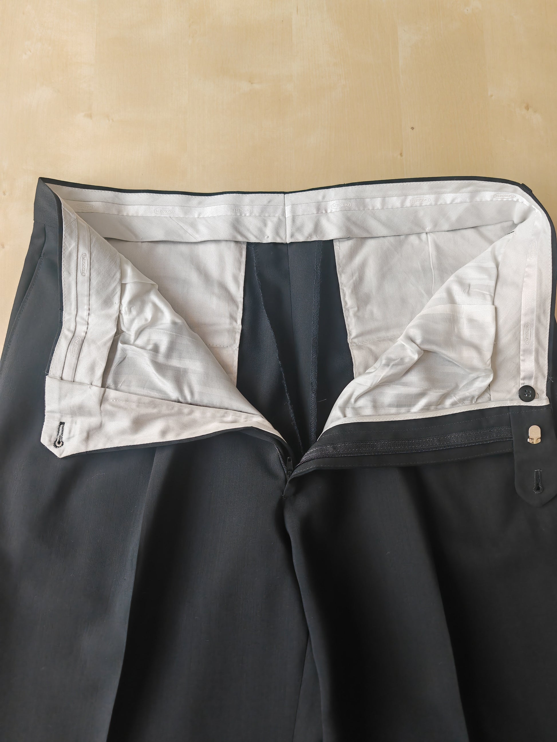 Il pantalone ha un normale taglio classico, senza i galloni laterali in raso, e con in più i passanti per la cintura. È quindi perfetto per essere usato anche spezzato, come un normale pantalone da giorno. Il taglio è comunque piuttosto formale, con tasche a filo, vita alta e doppie pinces.