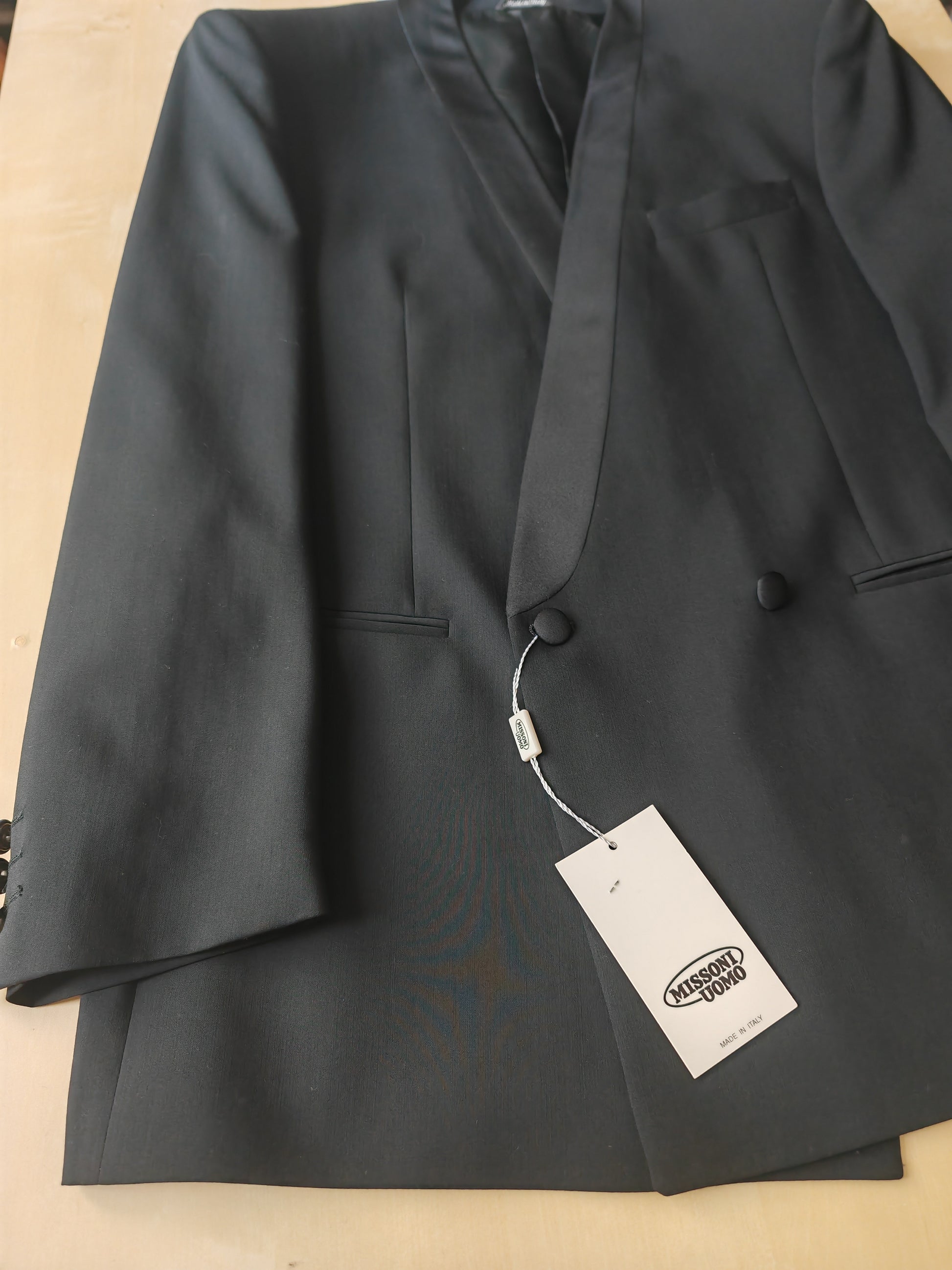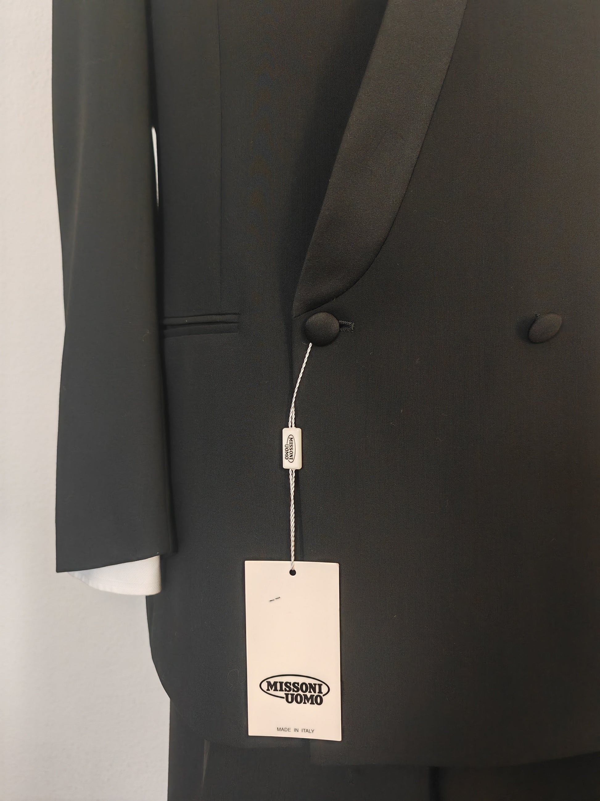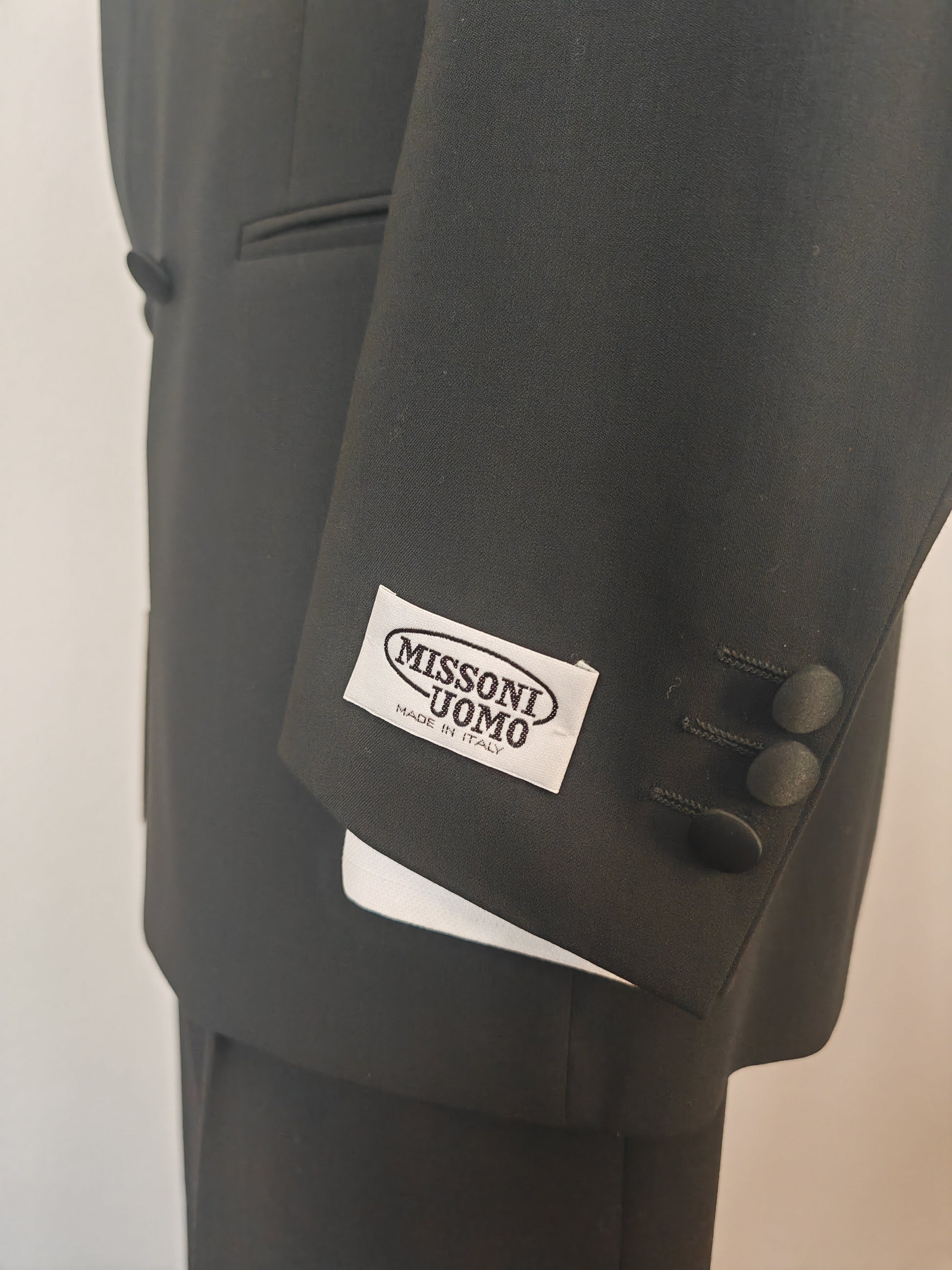 Splendido abito da sera "mezzo smoking" di Missoni, vintage anni '80 in condizioni di NOS: nuovo, mai utilizzato, con il suo cartellino e il suo vecchio prezzo in lire (1.080.000).