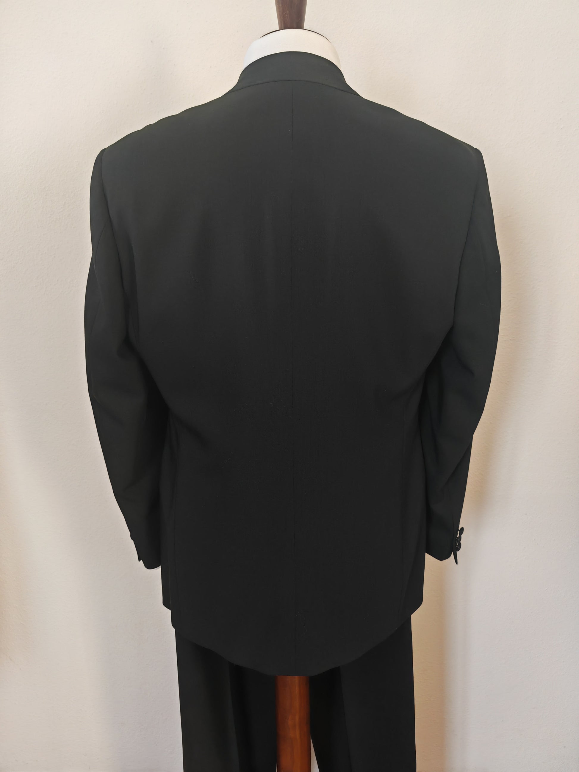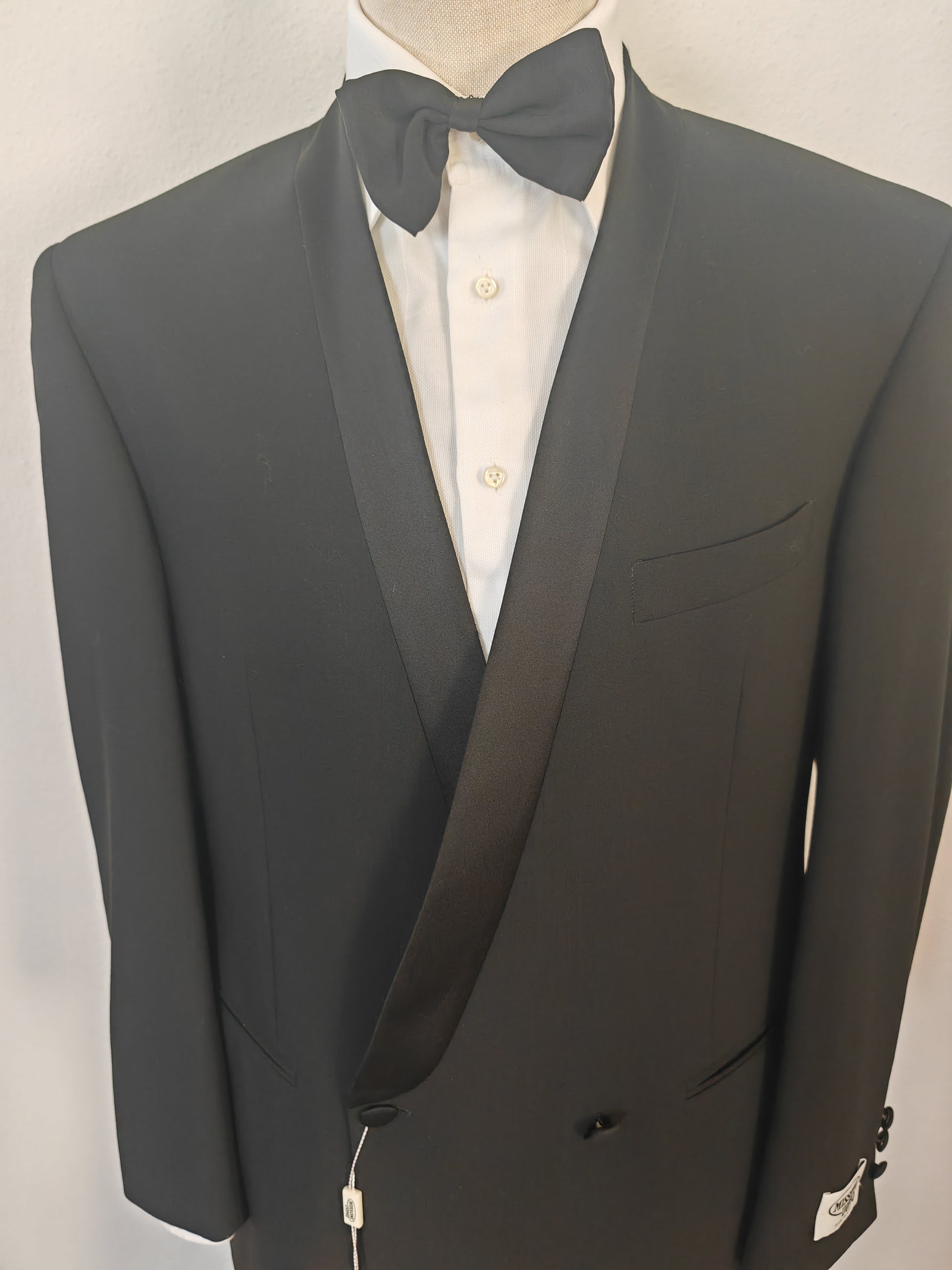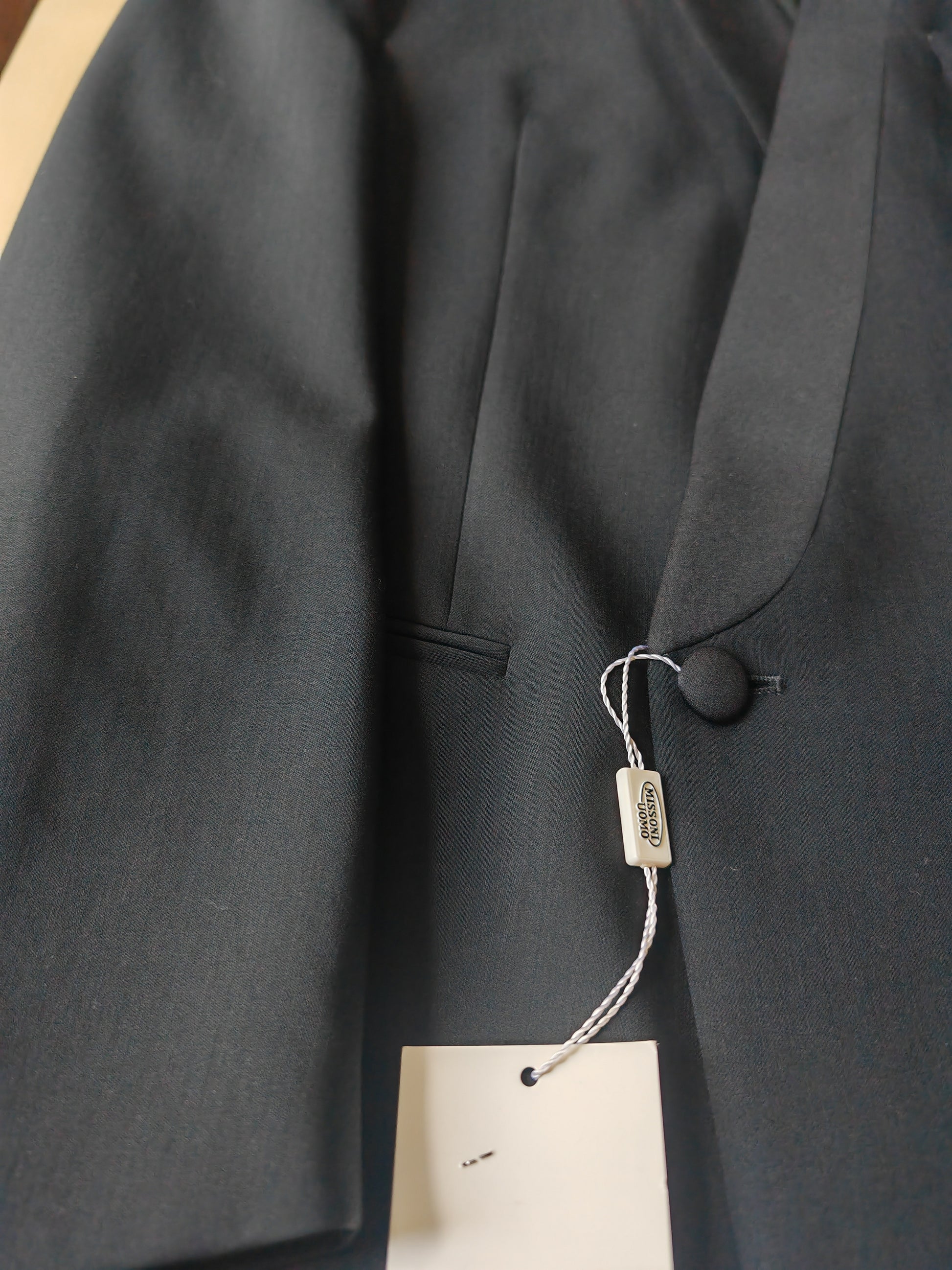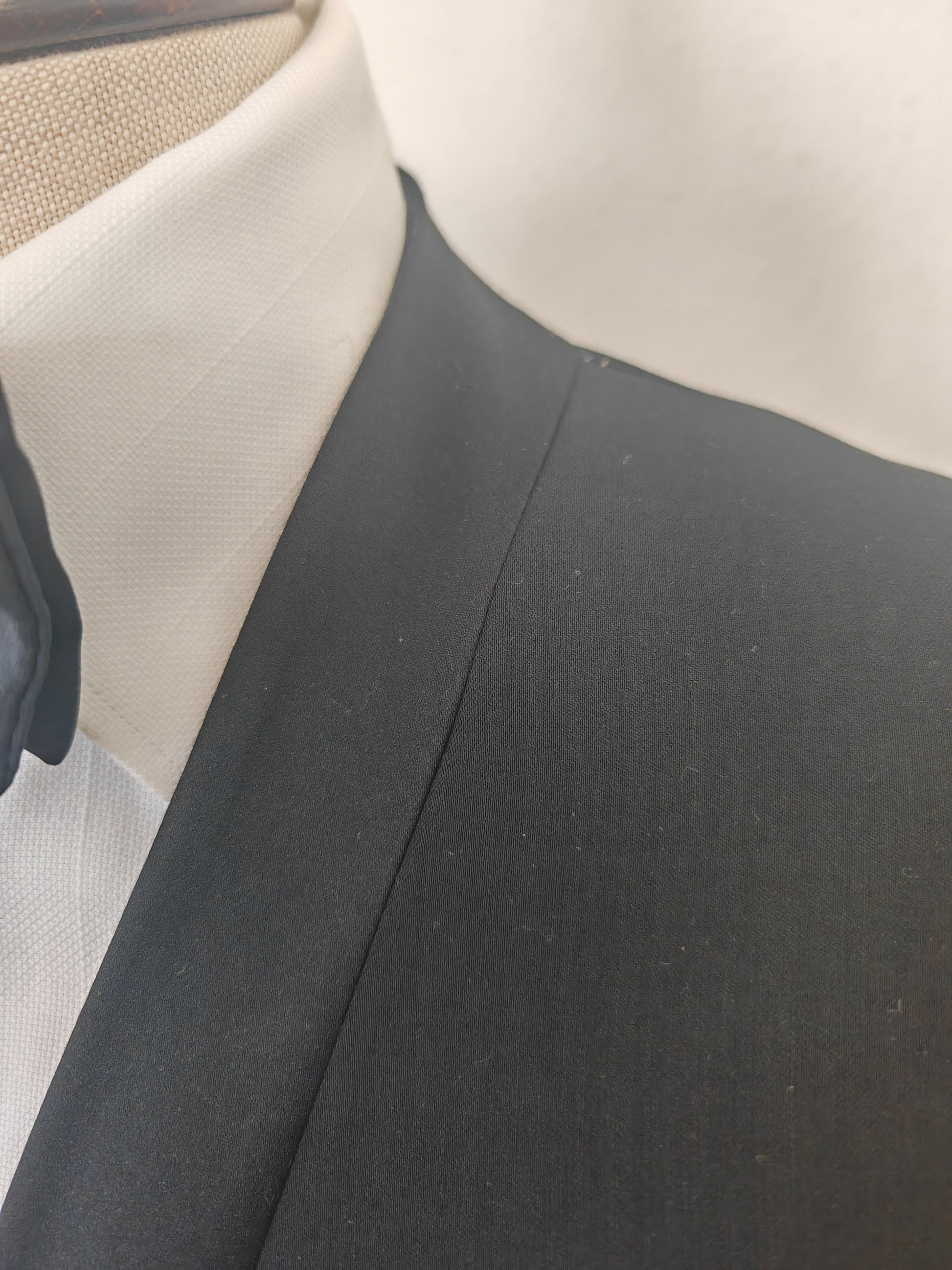 La giacca è infatti un bel doppiopetto monobottone (2×1), con revers a scialle in raso larghi 4 cm, tasche a filetto e nessuno spacco come da prassi. Tutti i bottoni sono foderati in raso.