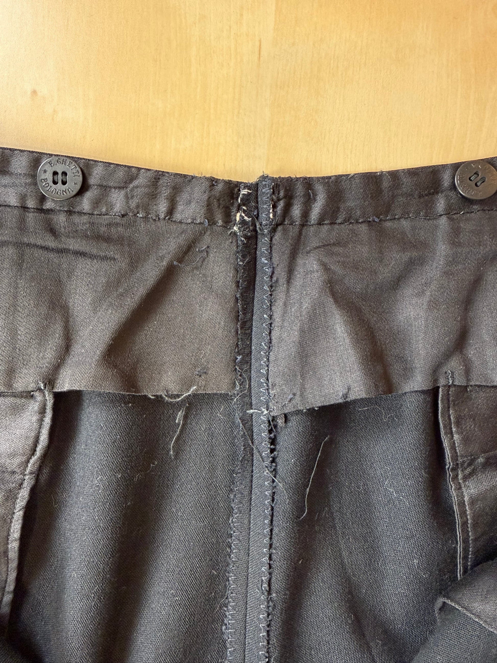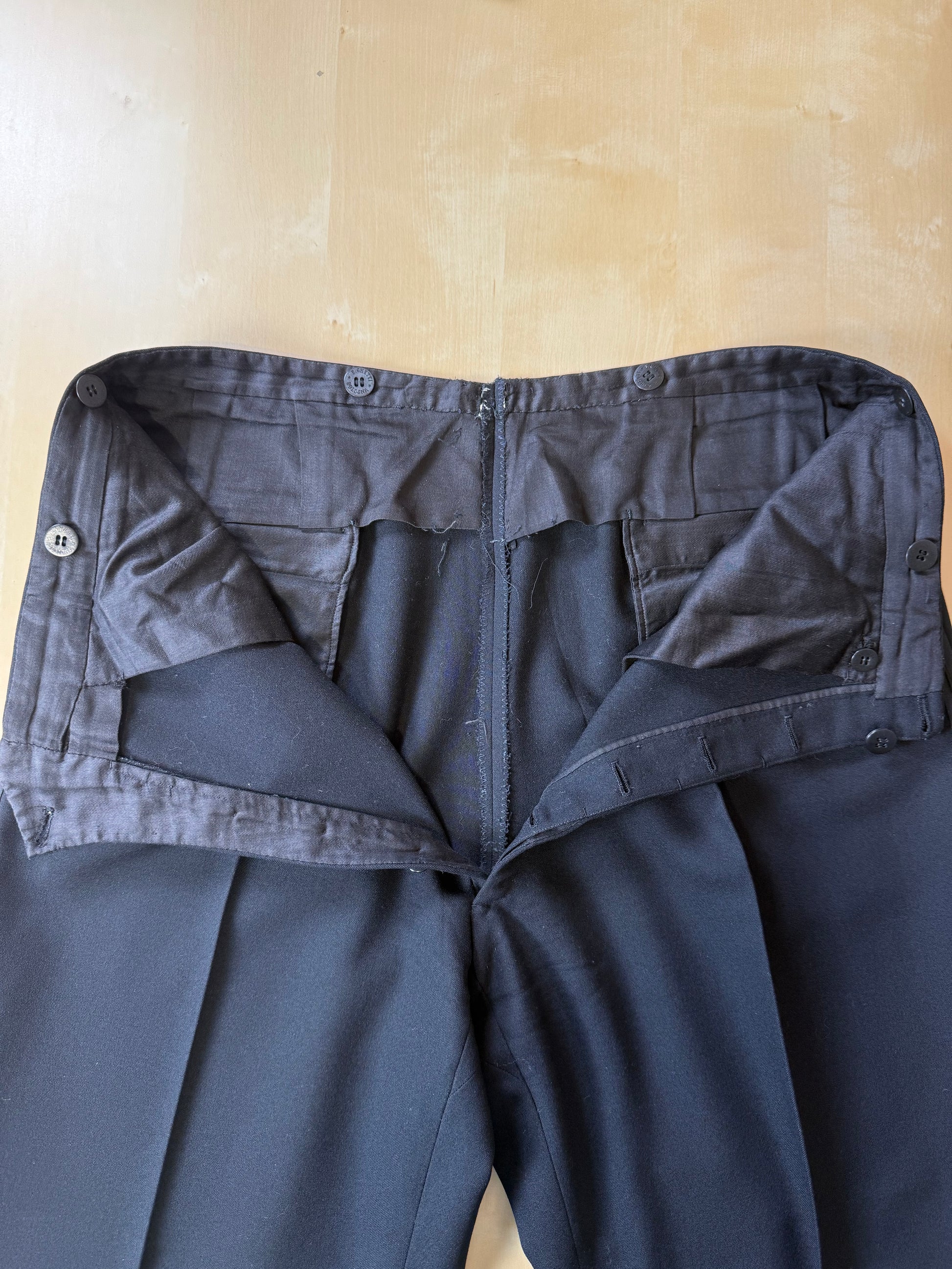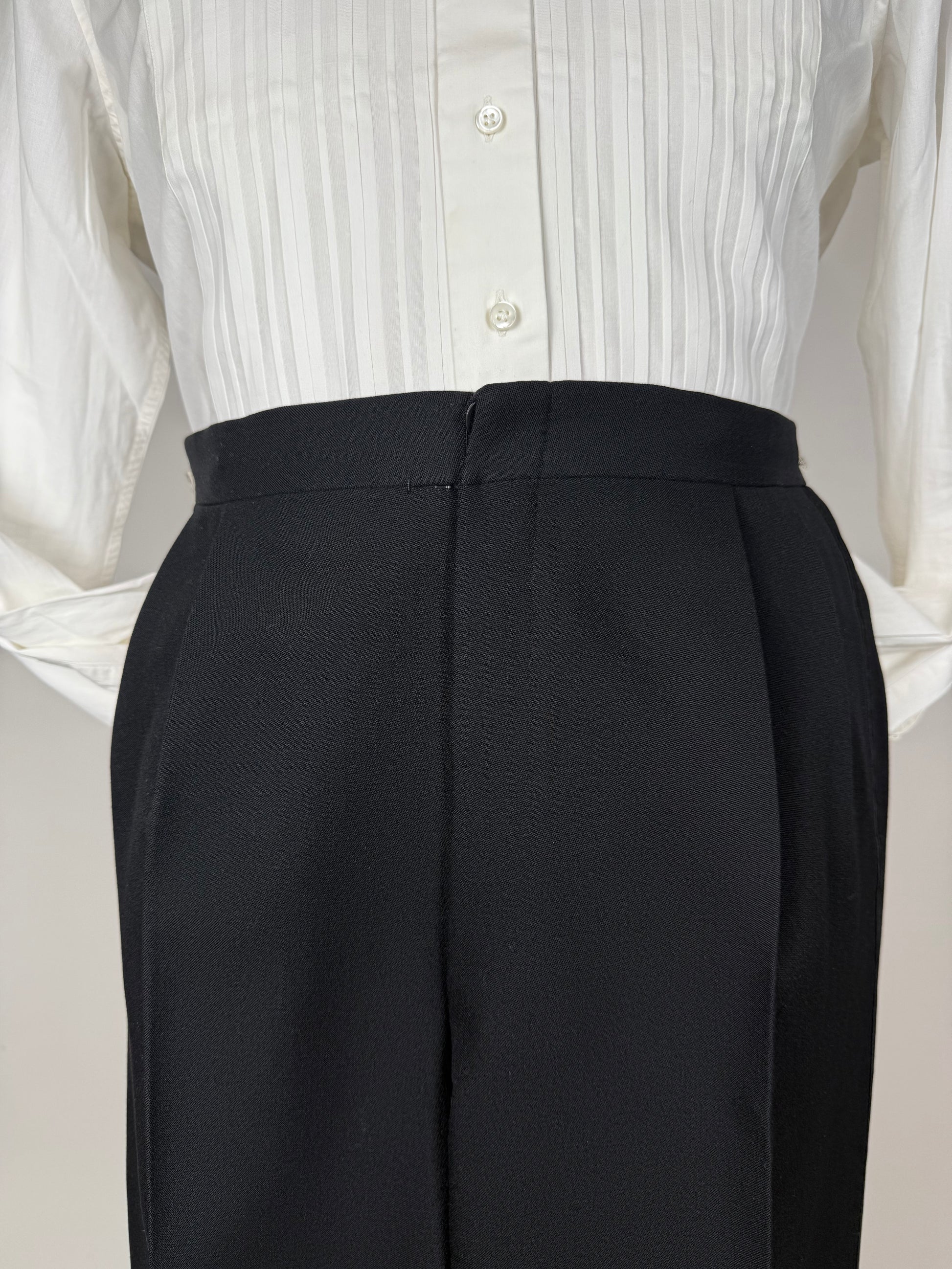 Pantaloni a vita alta con doppie pinces, classica chiusura centrata, silhouette ampia ma con fondo leggermente rastremato come tipico dell'epoca.