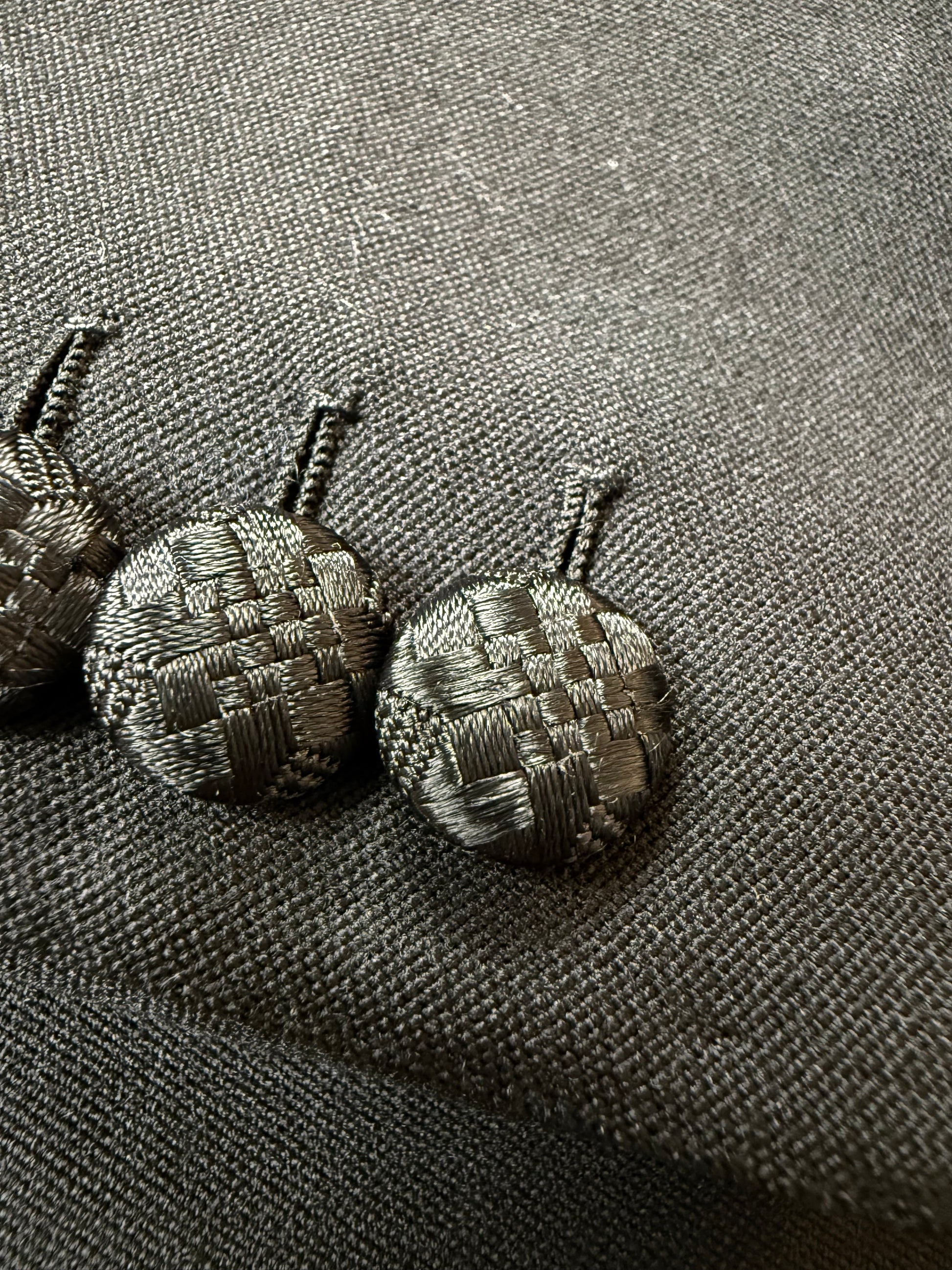 Giacca realizzata e intelata a mano, con revers sciallati in raso di seta, bottoni anch'essi foderati in seta dalla raffinata lavorazione intrecciata.