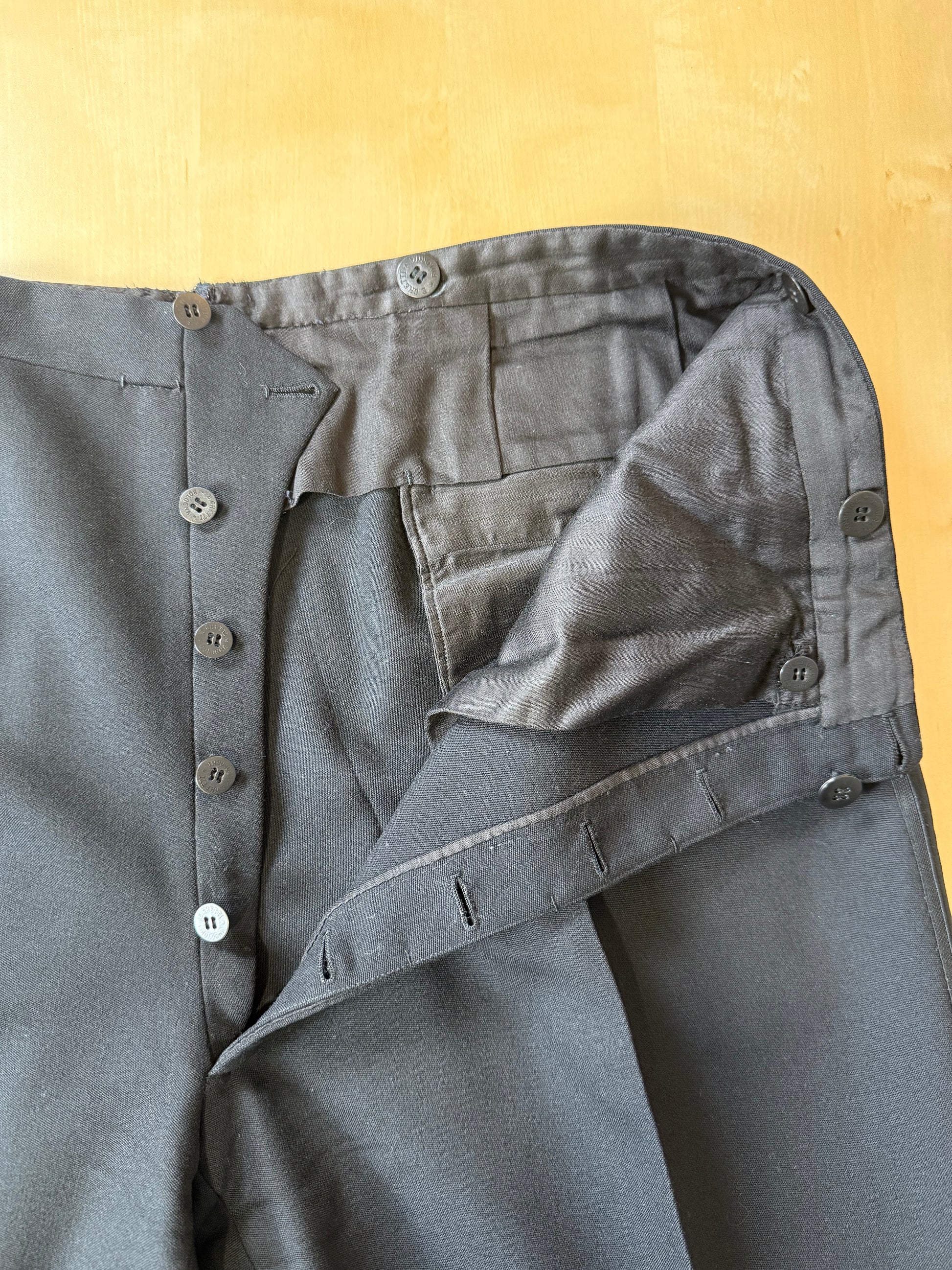 I pantaloni sono già predisposti all'interno con i bottoni per le bretelle, bottoni originali con il punzone della sartoria. Cintura senza passanti.