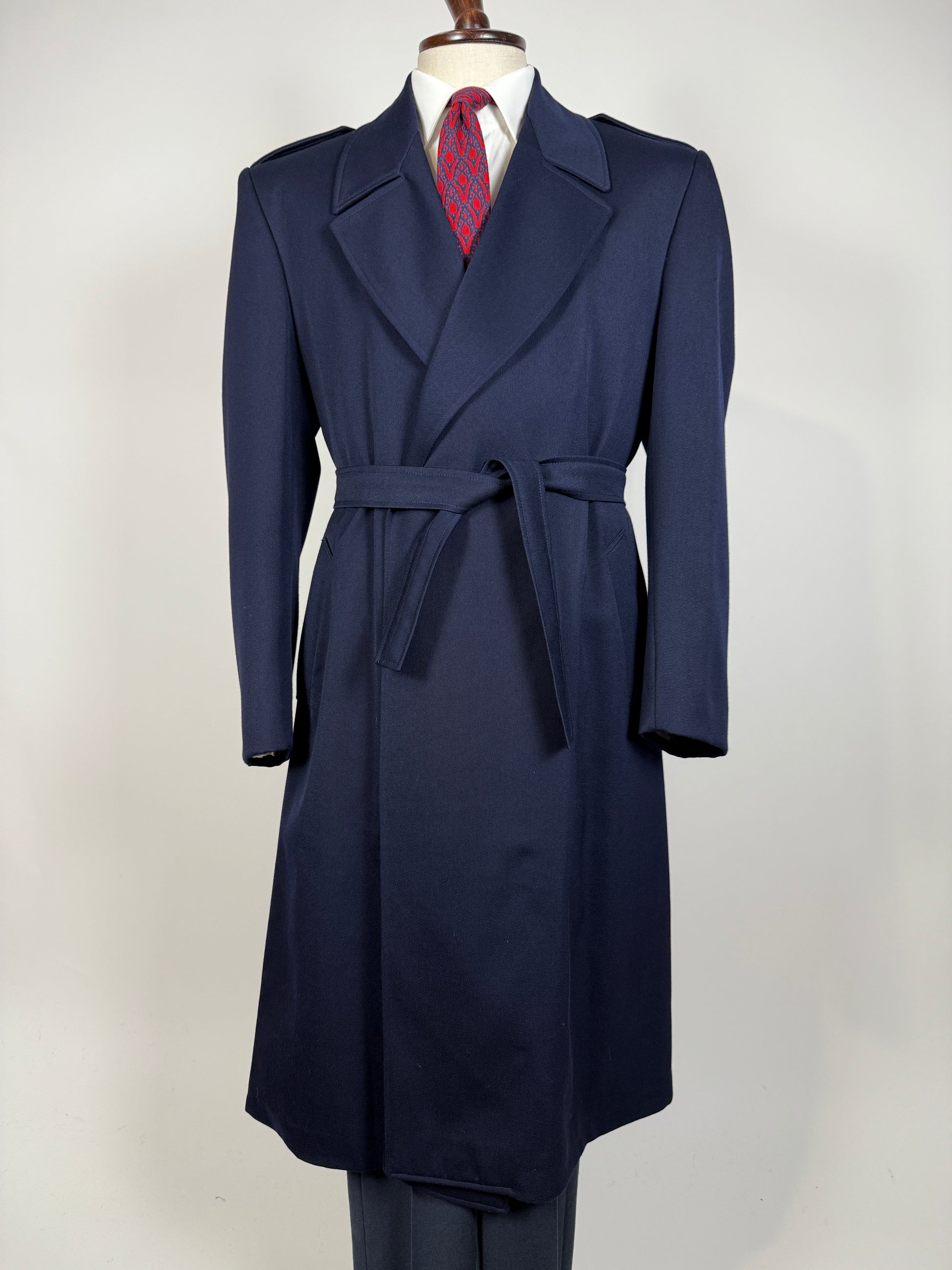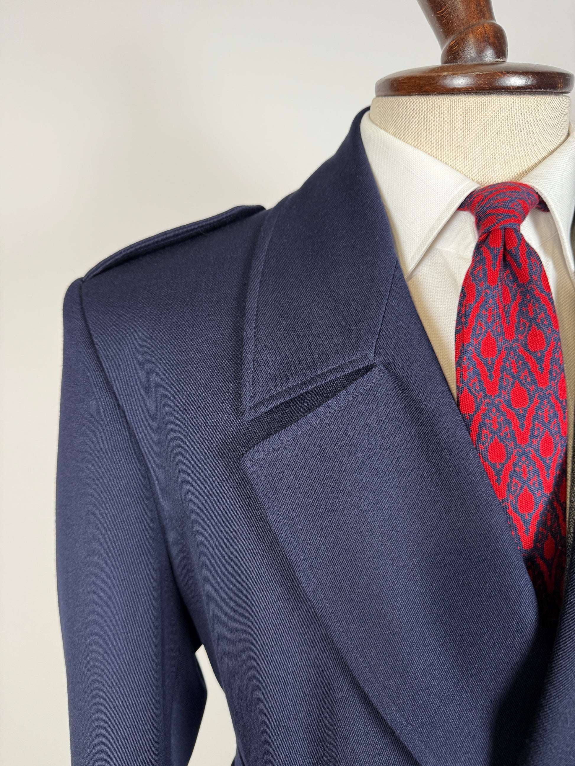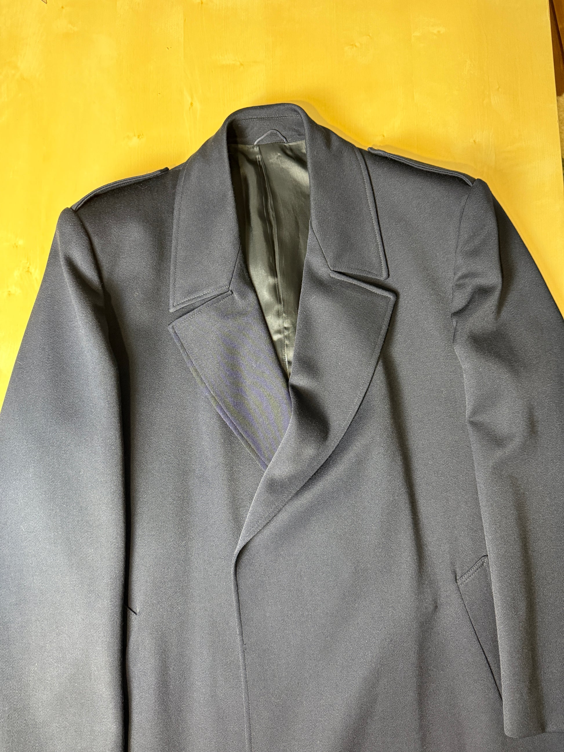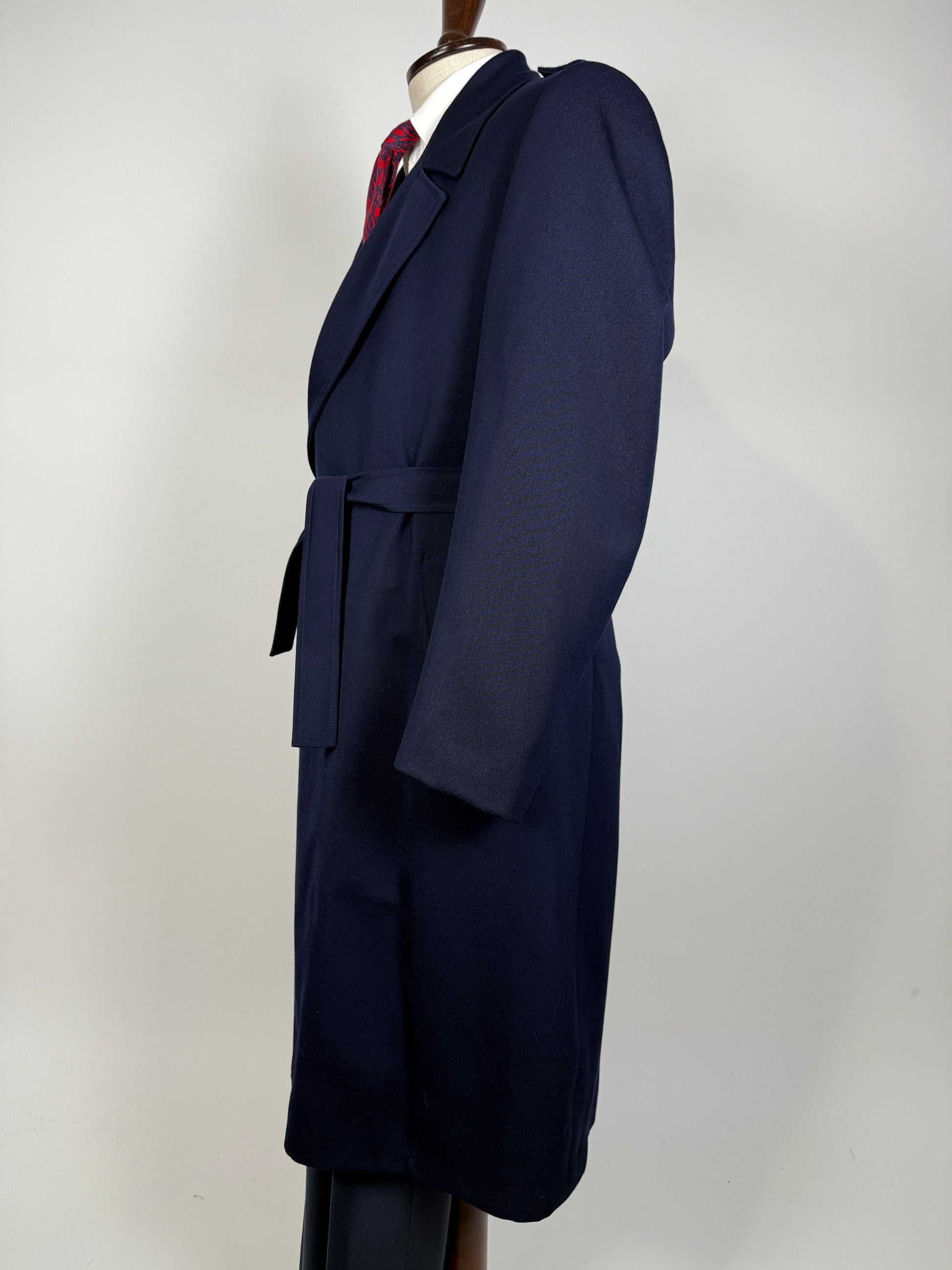 Magnifico soprabito anni '70 in twill 100% lana pettinata colore blu navy: un tessuto in pura lana simile alla gabardina di cotone, con ottime proprietà isolanti ma anche impermeabili, che richiama moltissimo, insieme al taglio generale del capo, il mondo militare.
