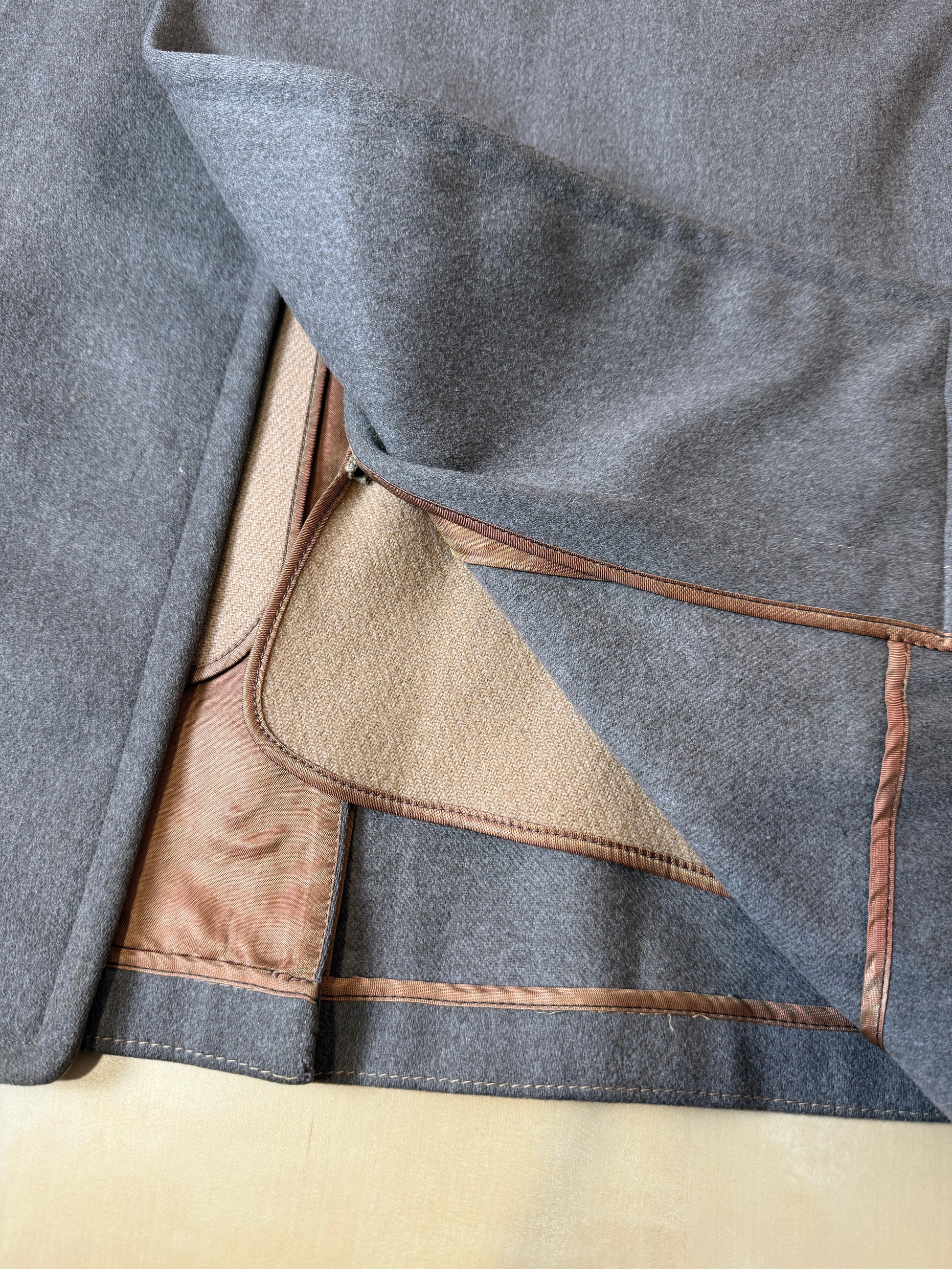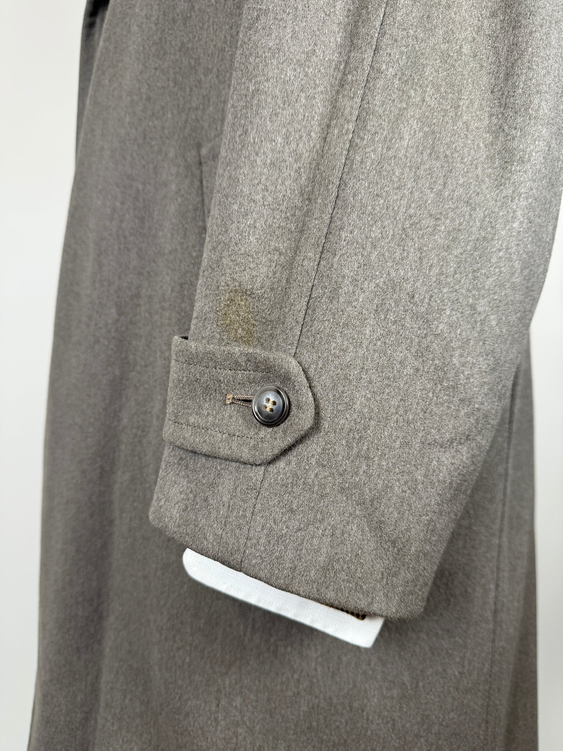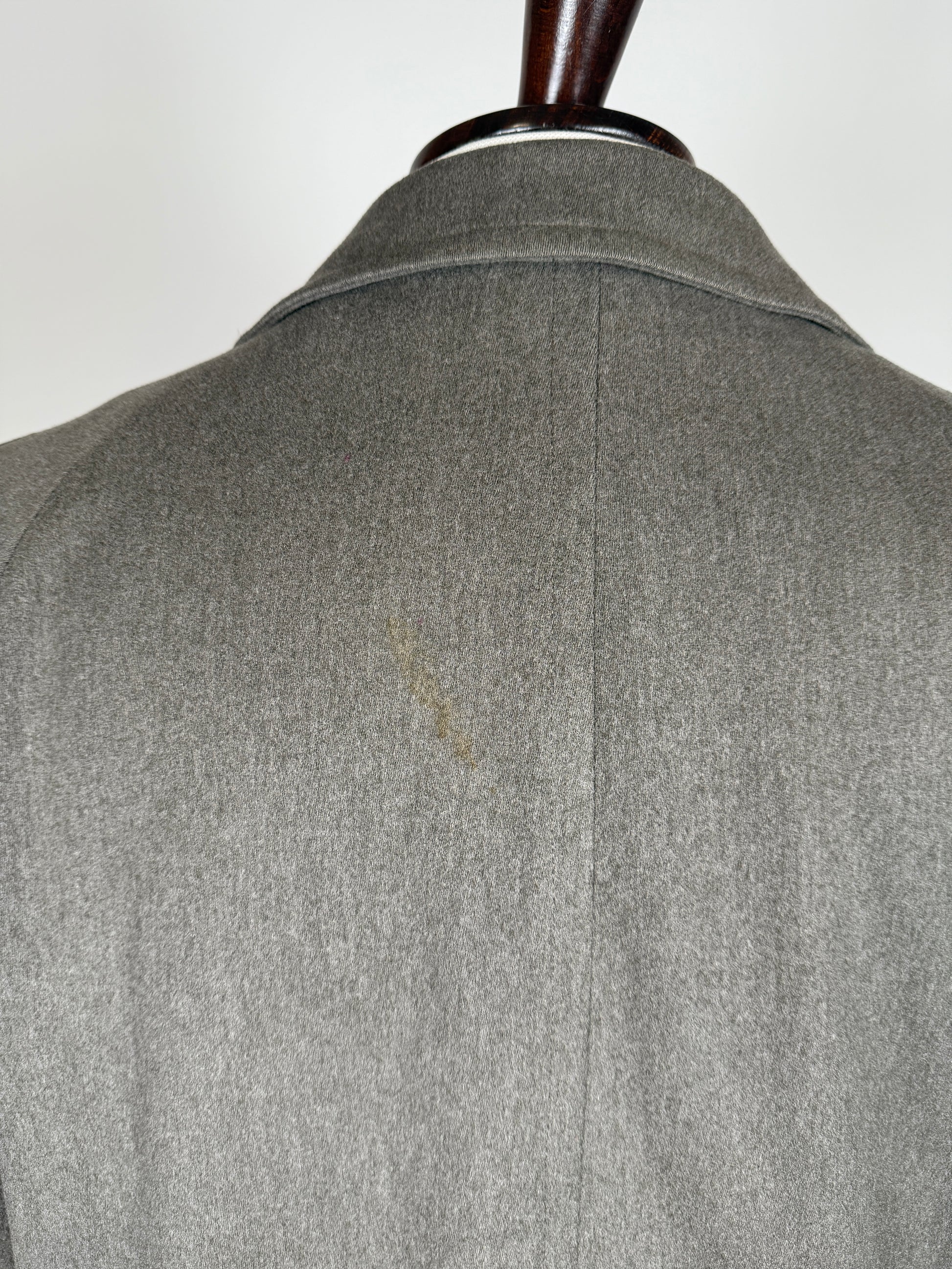 Tessuto in panno di lana rasato che ricorda il covert, di un colore fra il grigio, il verde e il cachi.